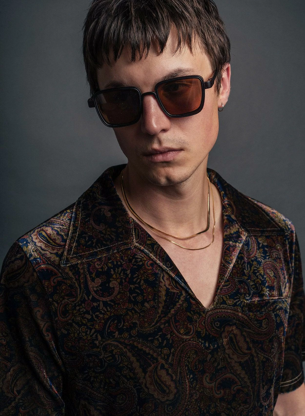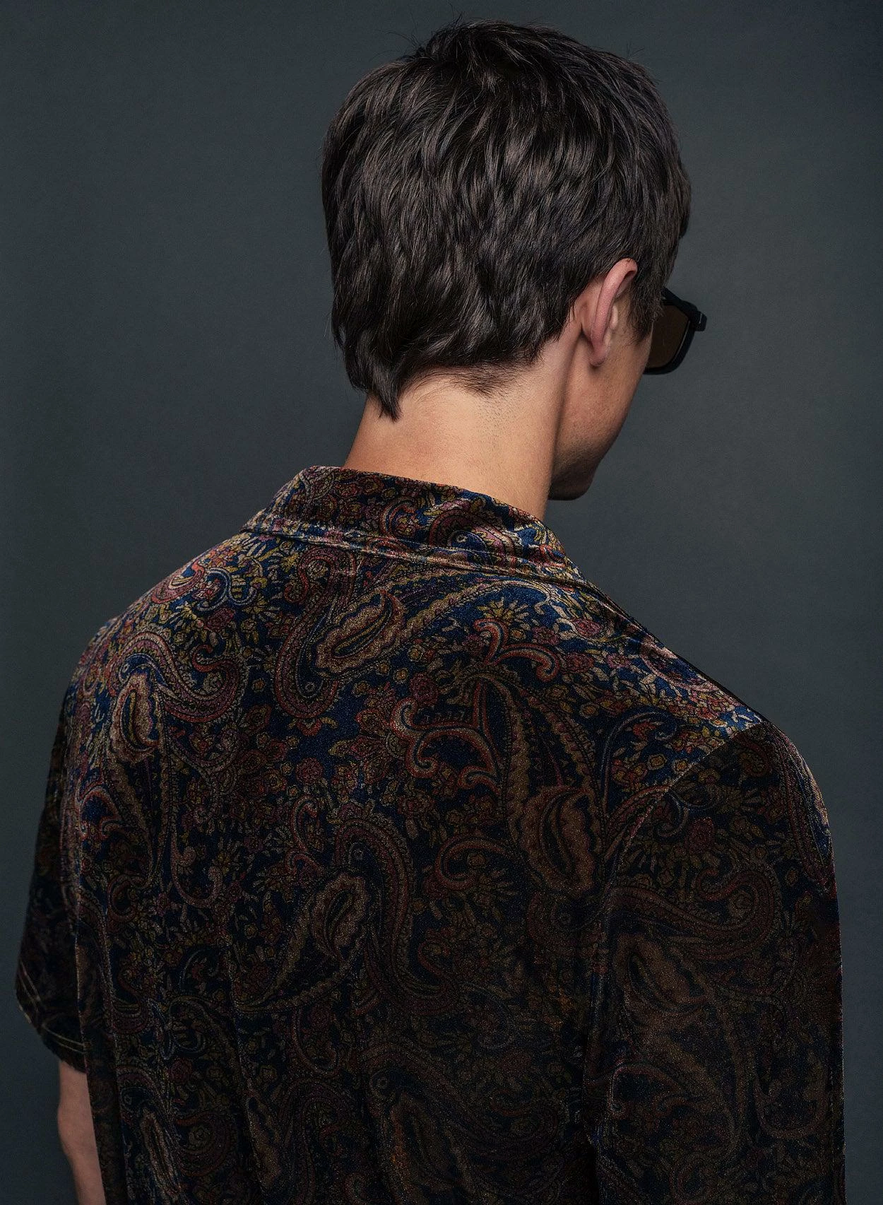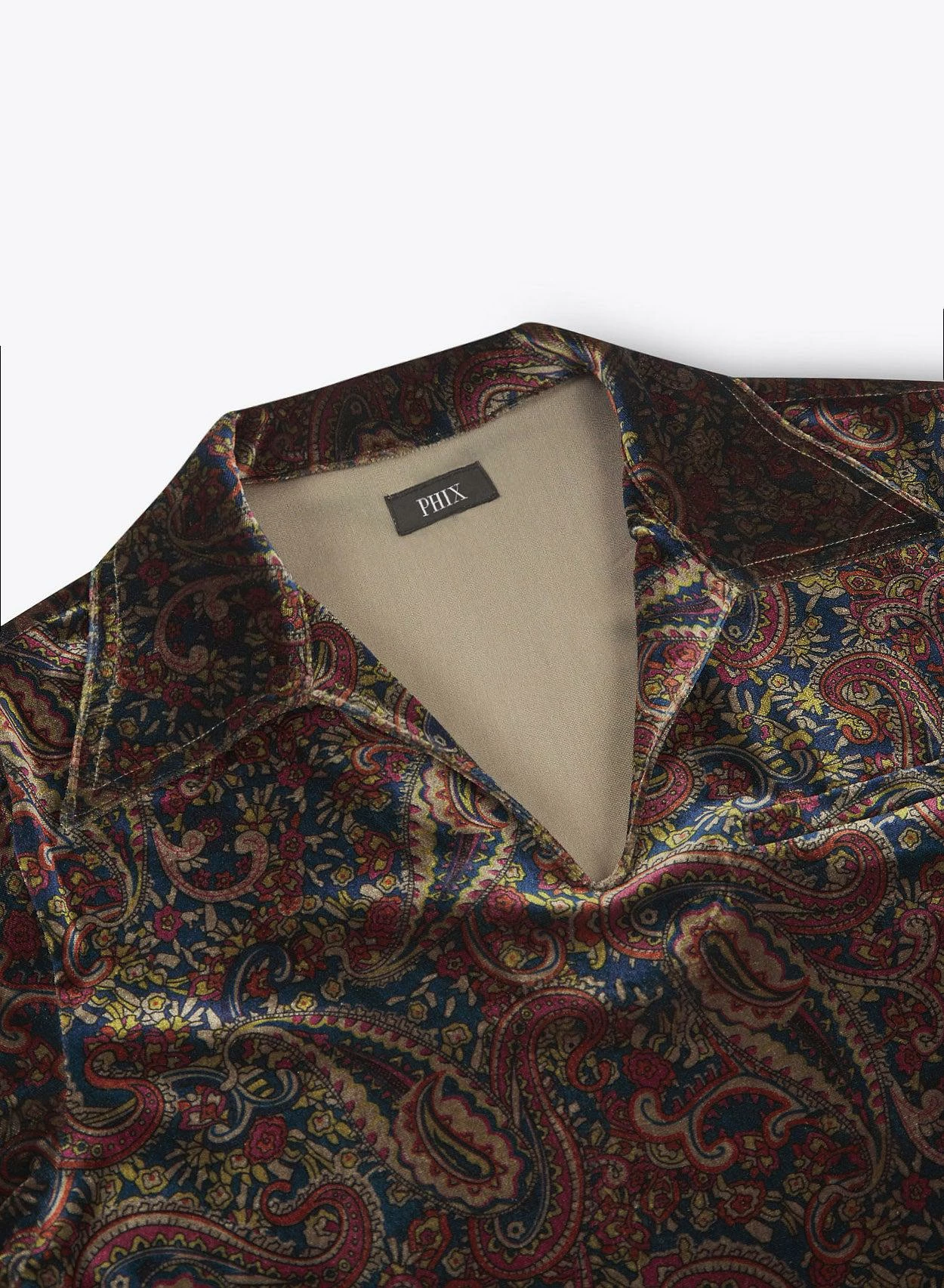Our signature paisley print has been reworked into a new short sleeved polo silhouette, ideal for the warmer months. Cut from a plush velvet with an all-over sixties psychedelic motif in dark tonal browns and blues for a vintage feel, this style is finished with an open collar and relaxed sleeves. Switch denim jeans out for our wool flares to go from day to night.