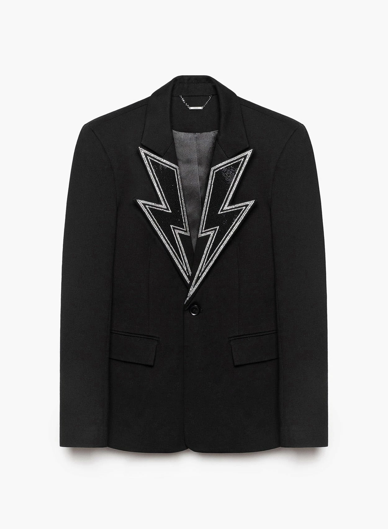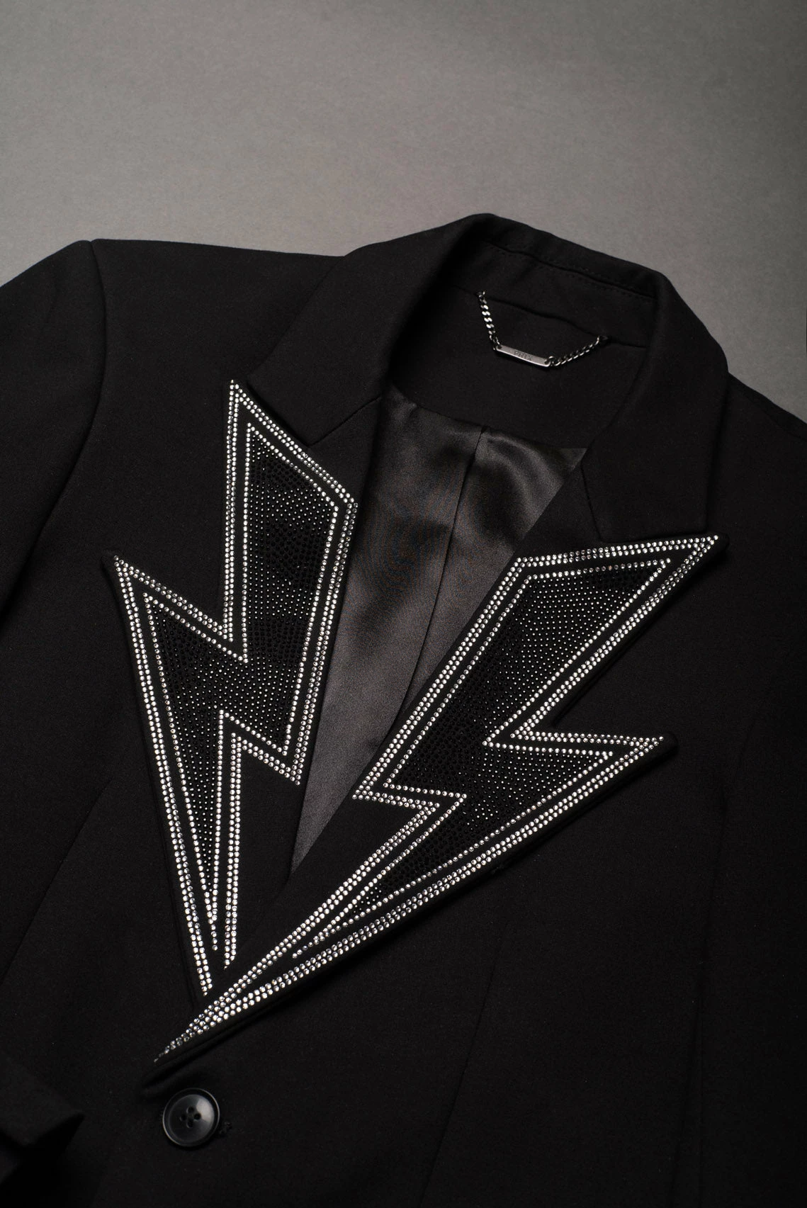Because a normal black blazer just doesn’t cut it. It has long sleeves, peaked lapels, flap pockets and crystal embellished bolt design across the lapels. Designed and sold exclusively by Phix. Also available in red.