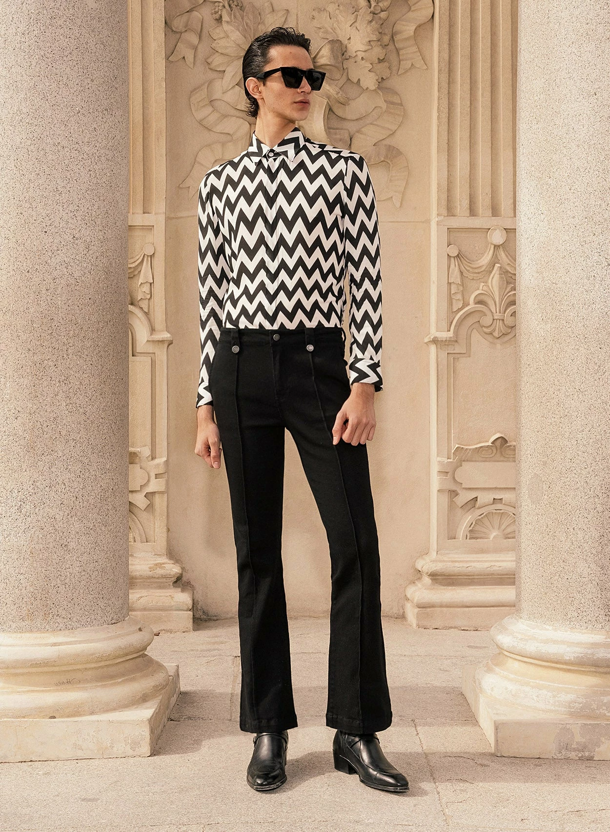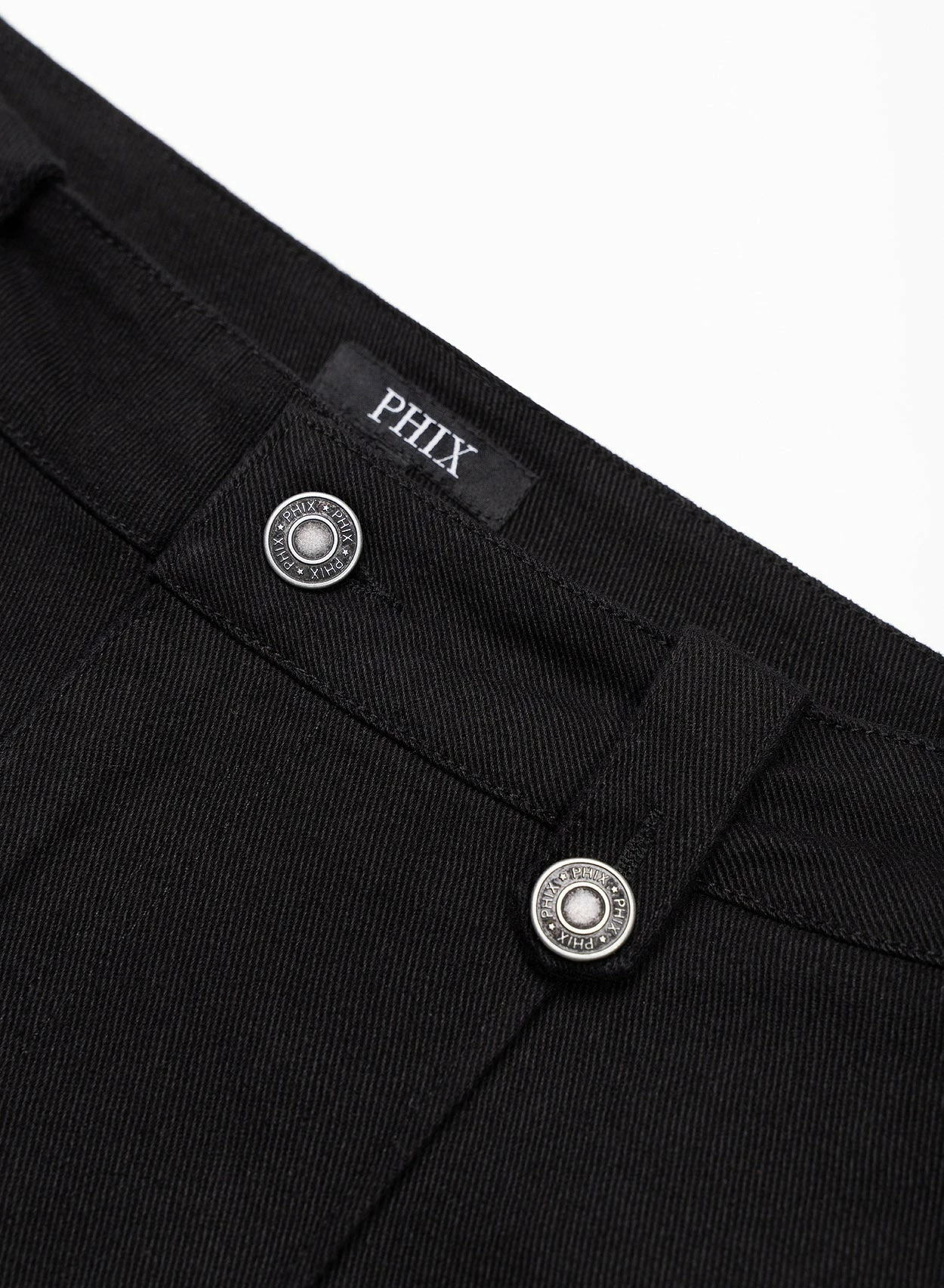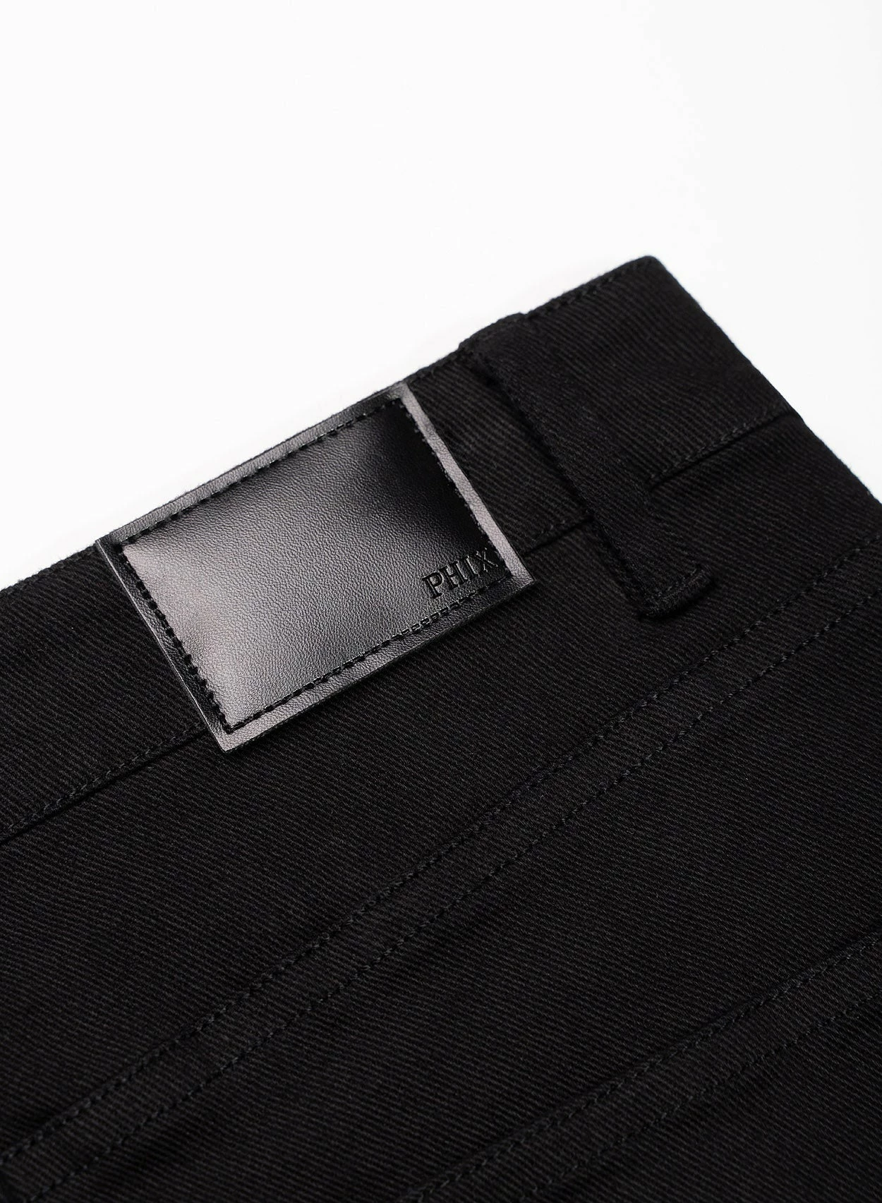Our signature pin belt silhouette, now cut from premium cotton denim. Tailored for a more relaxed, straight leg cut, these black denim jeans taper to a flare at the ankle and feature two front belt loops, intricately detailed with bespoke PHIX embossed polished silver-tone buttons. Finished with pintuck centre press detailing, rear external pockets and a premium YKK zipper, these flared jeans pair well with your best boots and a leather jacket, for a refined yet laid-back 1970’s vintage look. Also available in classic light blue wash.