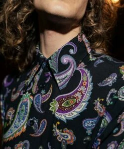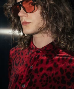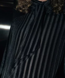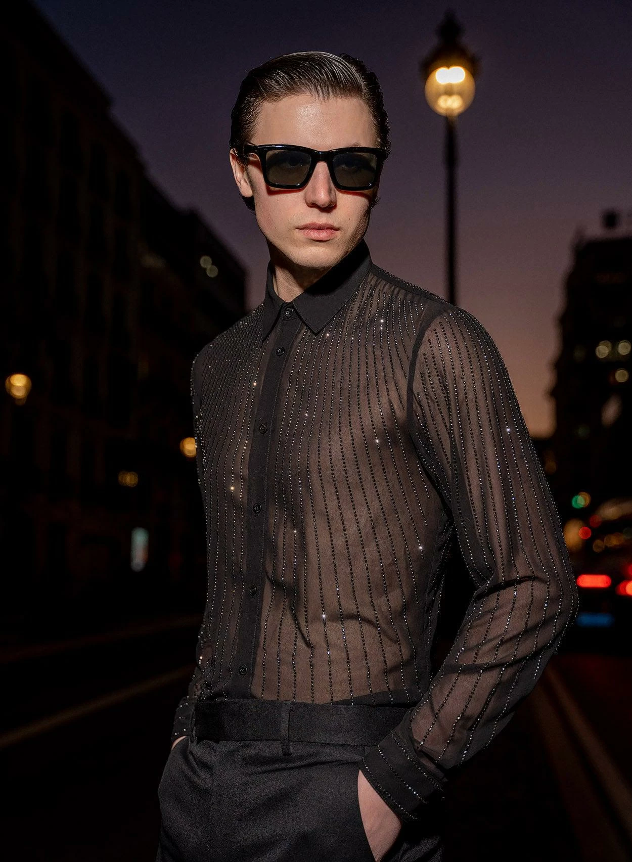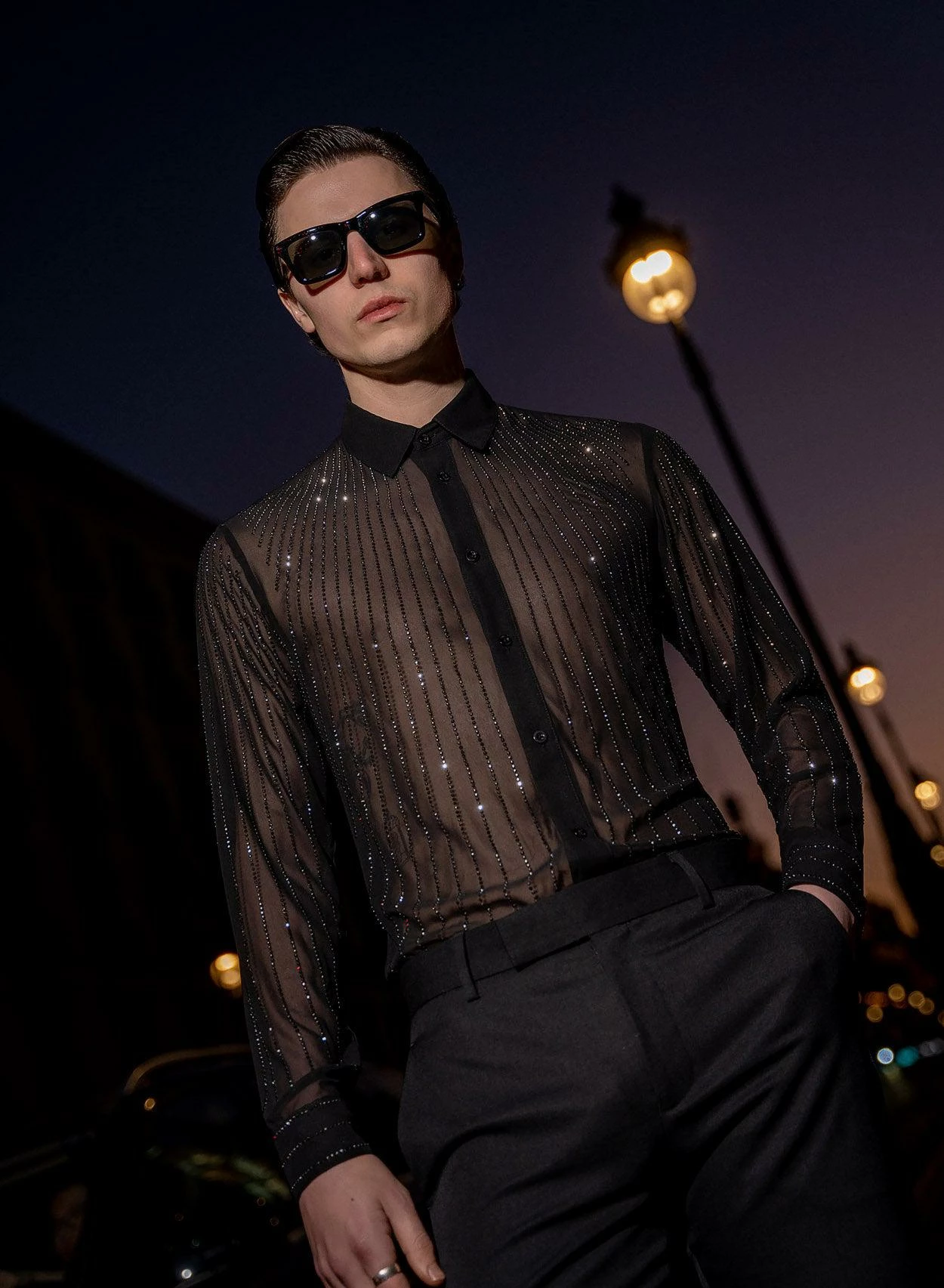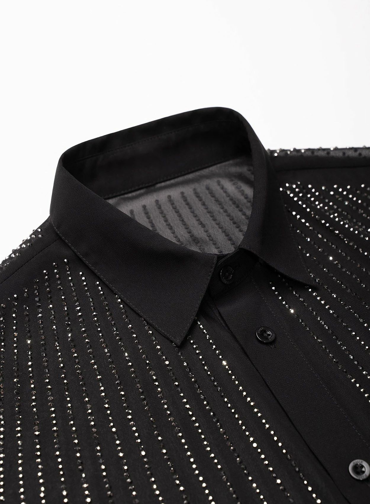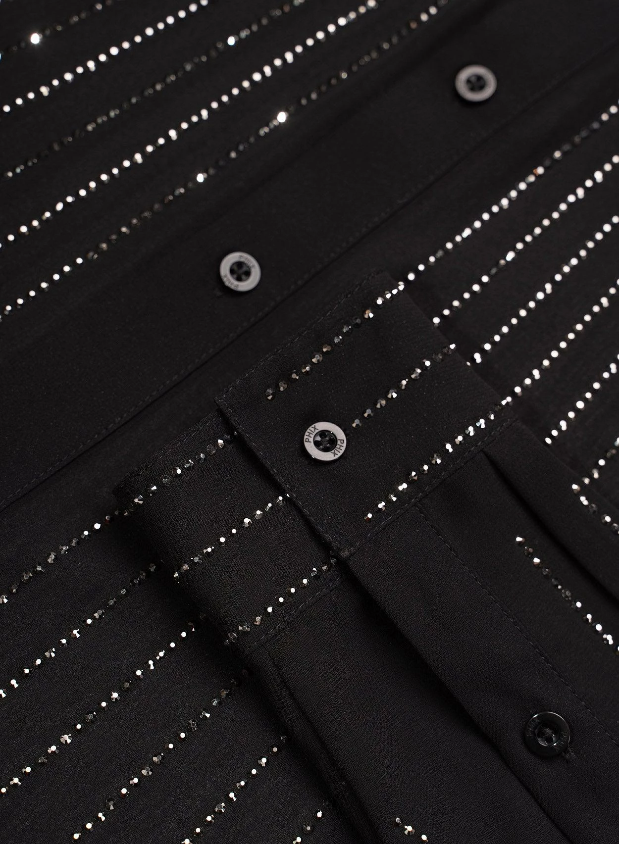 Cut from smooth semi-sheer dark chiffon for our signature tailored fit with pointed collar, this is a true glitzy statement shirt. Intricately embroidered with rhinestone crystals in a linear pattern and finished with subtle black logo embossed buttons throughout. Exclusively PHIX, this material has been designed and created in-house for a truly bespoke look. Style yours with sleek tailoring and leather boots for effortless cool.