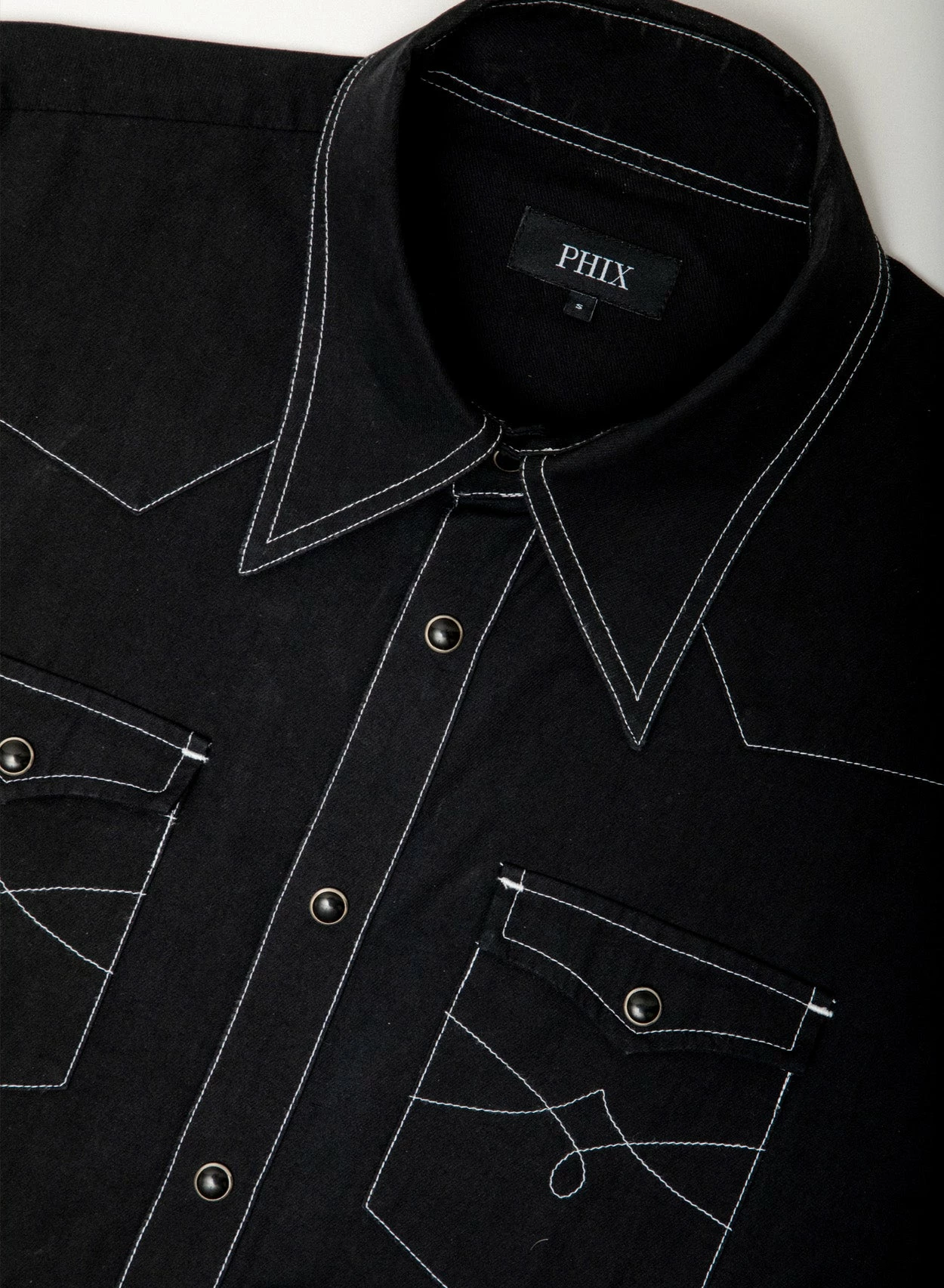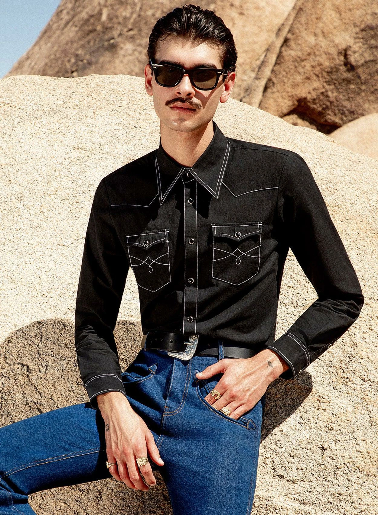 Crafted from premium black cotton denim, this vintage infused Western shirt has long sleeves, a statement pointed collar and a tailored silhouette. Intricate white contrast stitching adds a touch of visual intrigue, accentuating the shirt’s craftsmanship. Embrace a blend of ruggedness and refinement with this classic piece that effortlessly transitions from day to night, making it a versatile addition to your wardrobe.