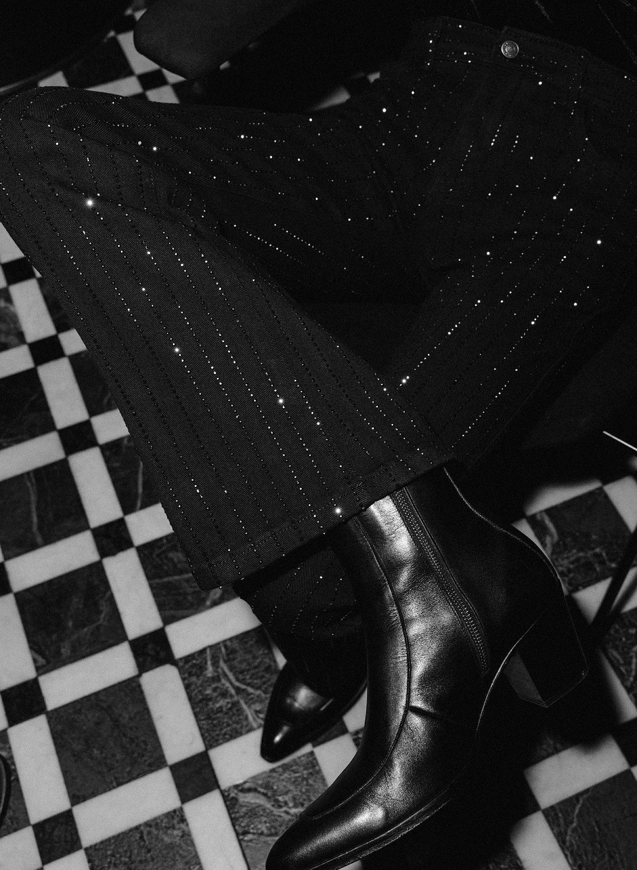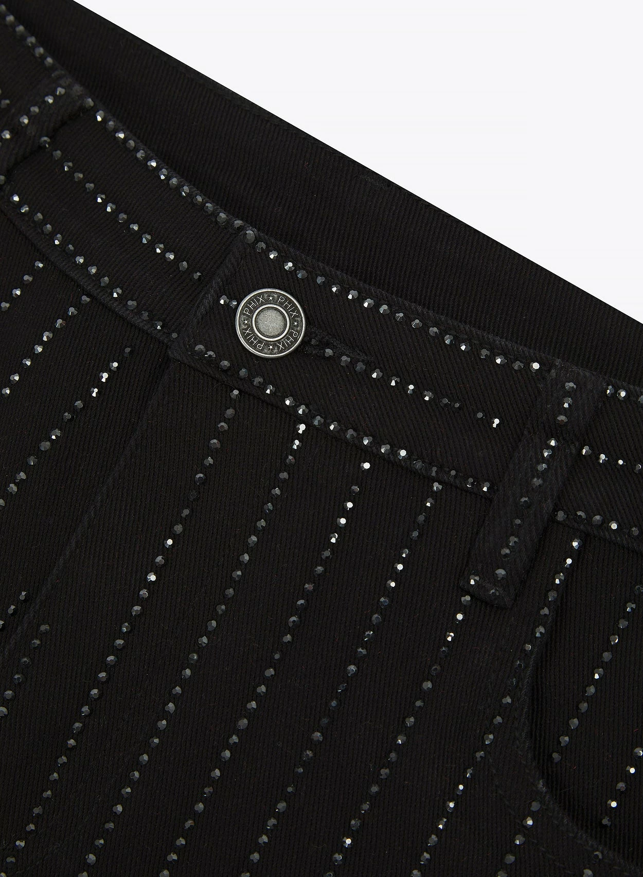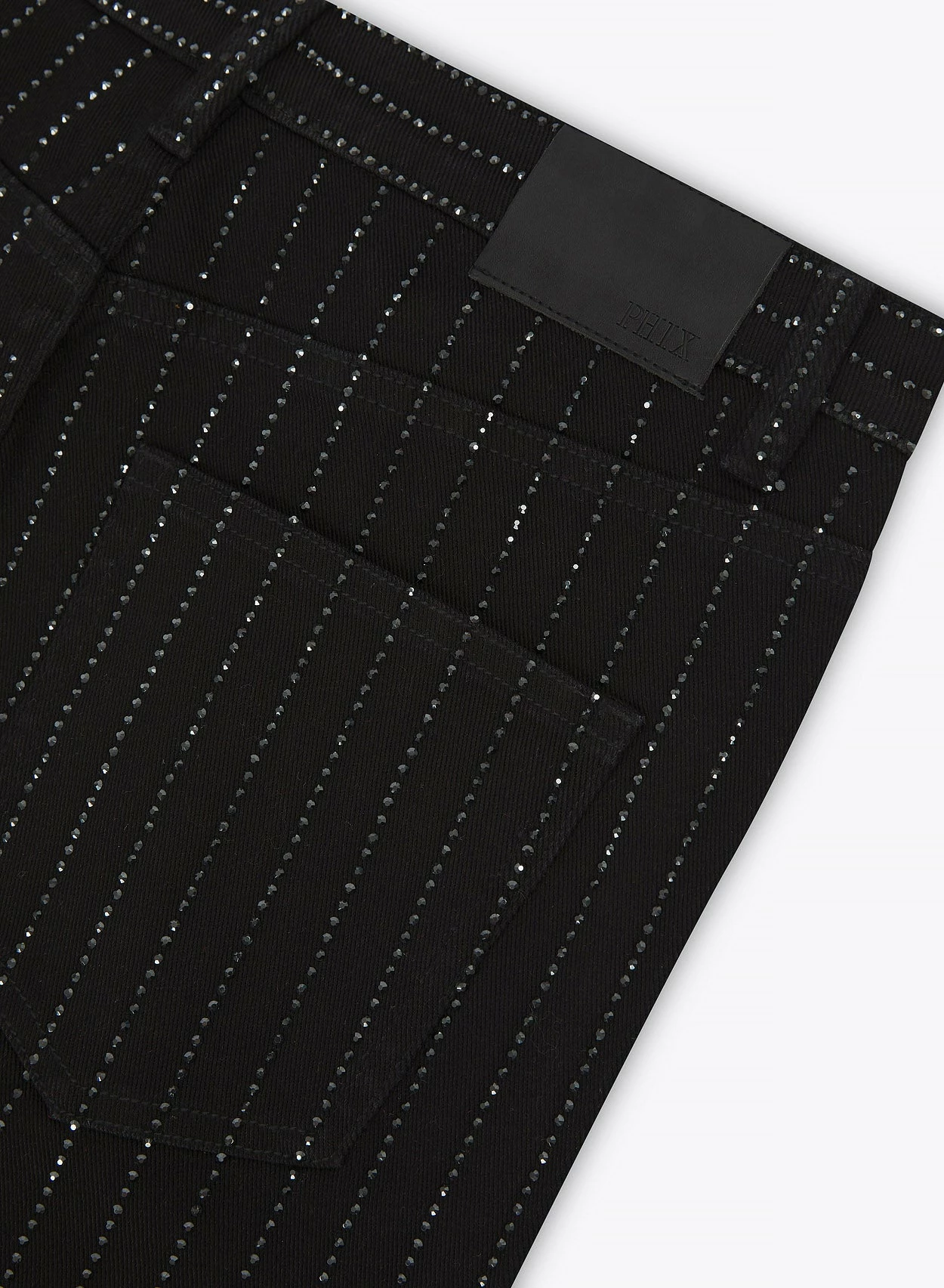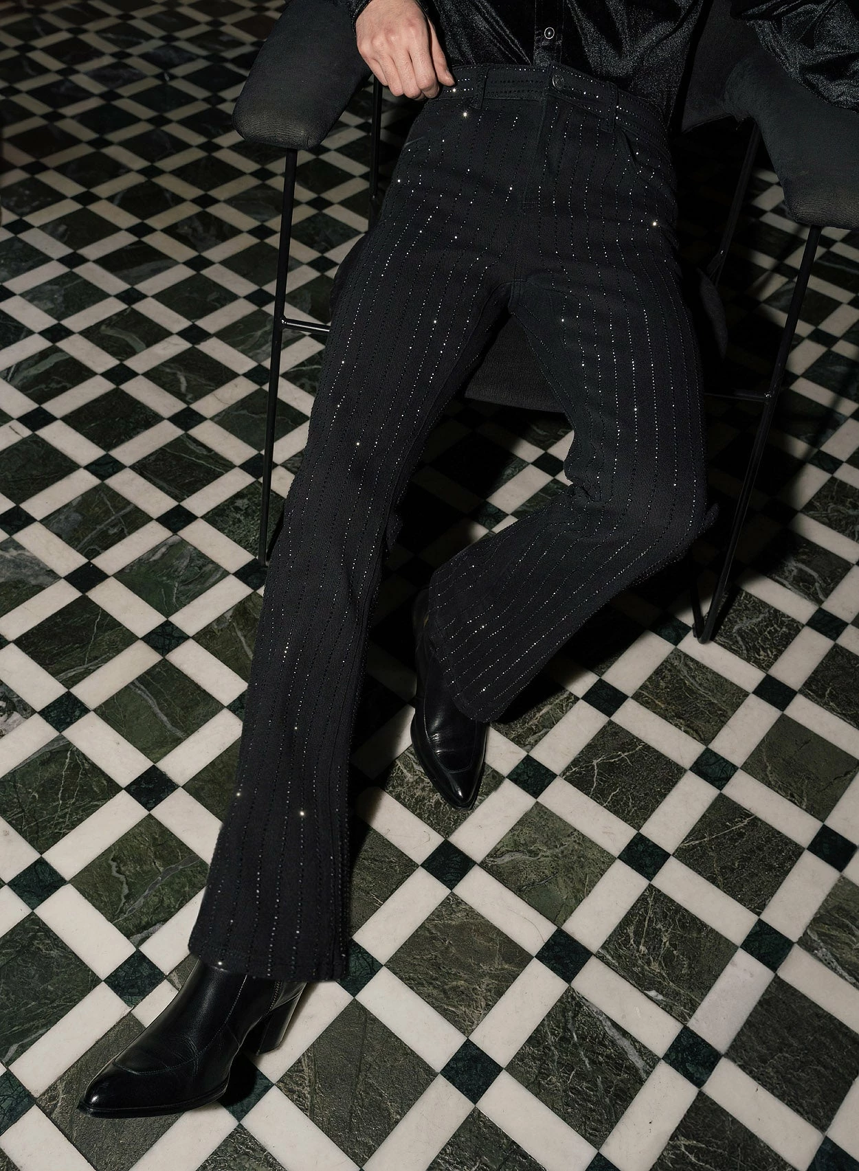 Make a statement with our latest denim concoction. Cut for a tapered flared silhouette from a classic black denim base, these jeans are adorned with a silver rhinestone pinstripe design for a unique blend of chic style and edge. Available in both regular and long leg lengths. Finished with a YKK gold-standard zip fastening and single button closure.