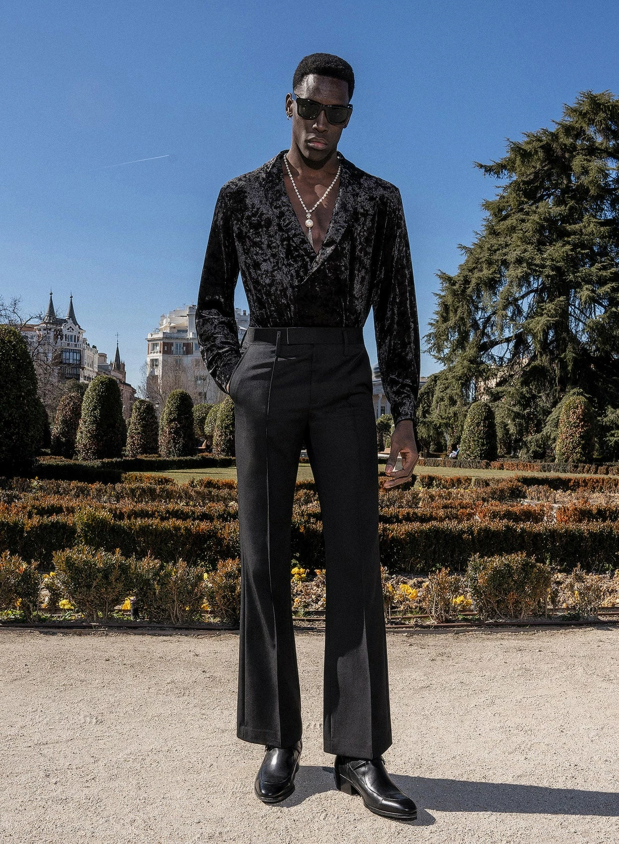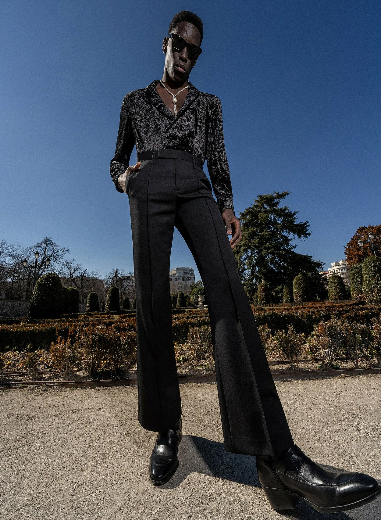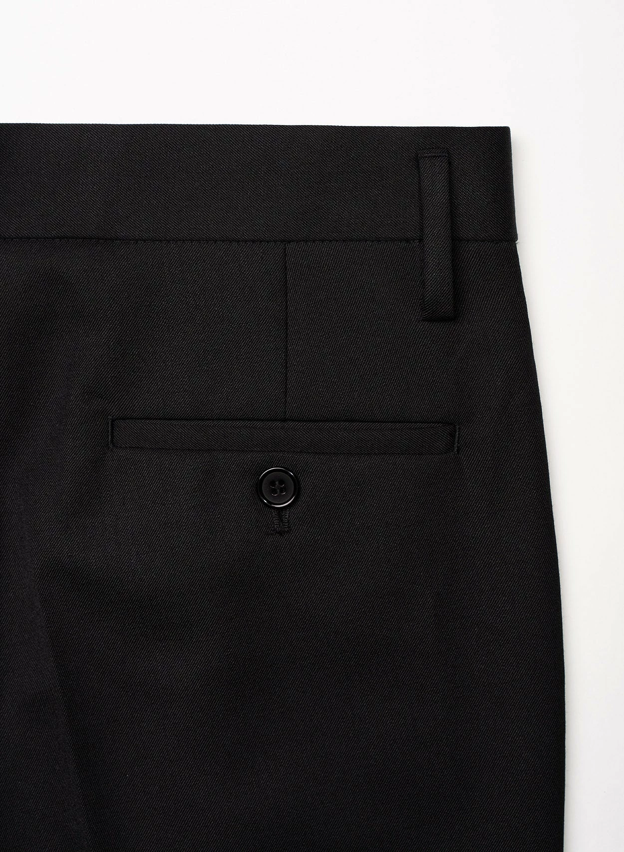 Crafted from black wool rich fabric and tailored for a slim-fit with flared silhouette, these trousers feature statement pin tuck detailing, rear pockets and a premium YKK zipper. These are a wardrobe staple which allow for effortless dressing with a vintage feel.