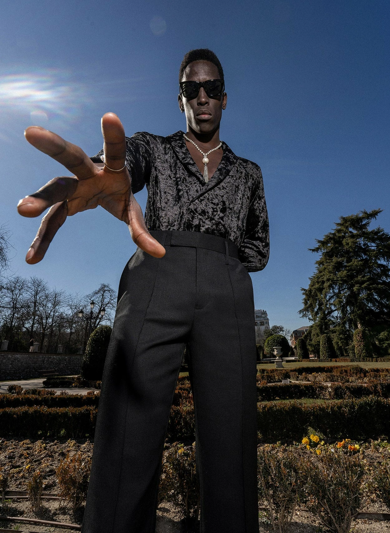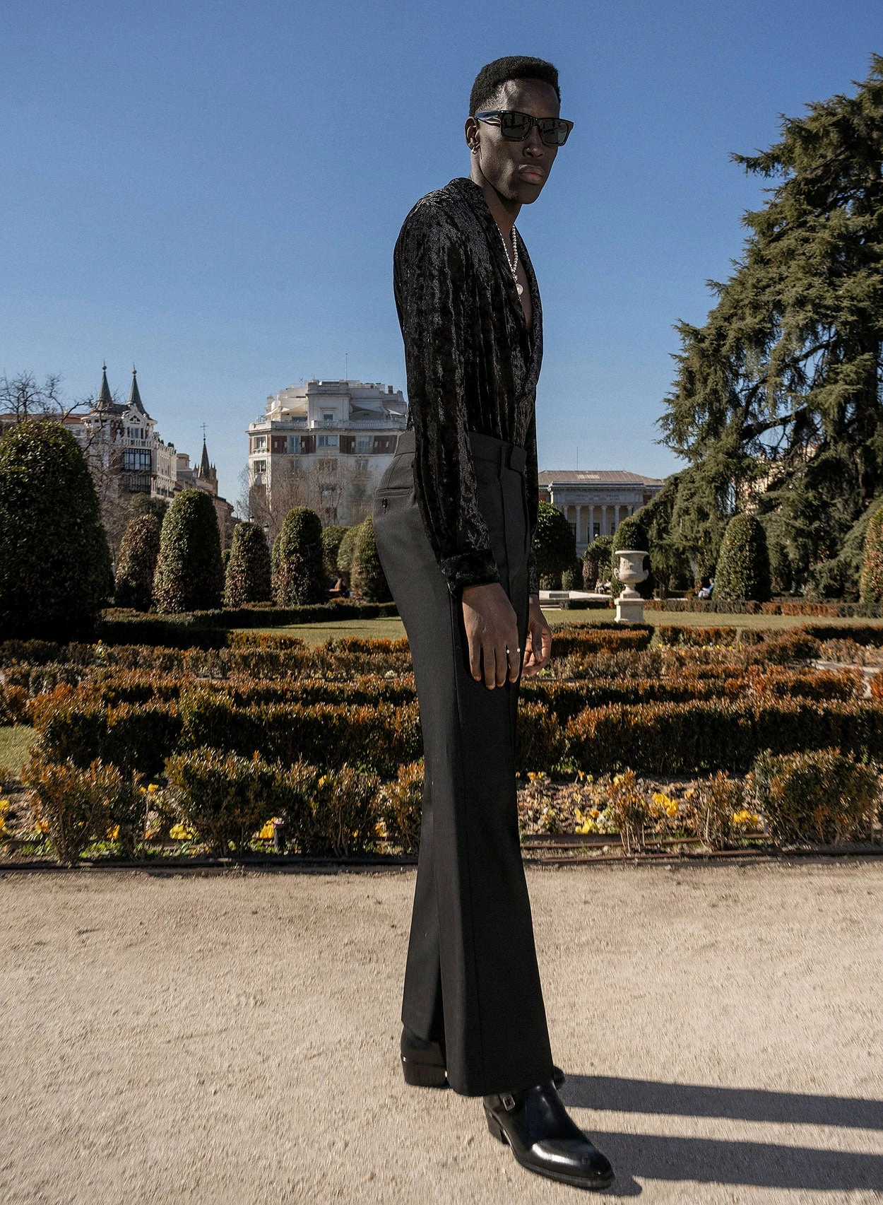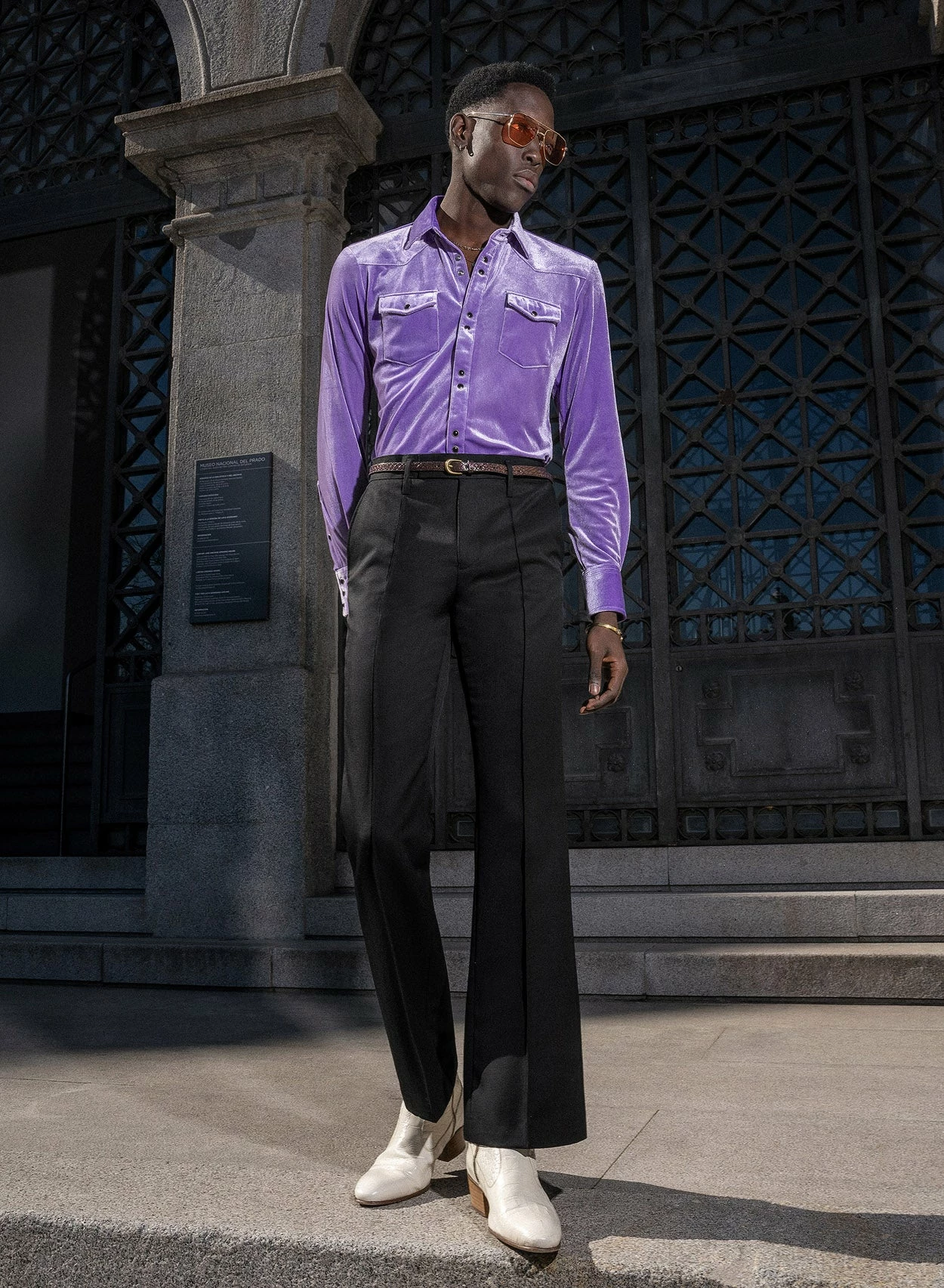 Crafted from black wool rich fabric and tailored for a slim-fit with flared silhouette, these trousers feature statement pin tuck detailing, rear pockets and a premium YKK zipper. These are a wardrobe staple which allow for effortless dressing with a vintage feel.