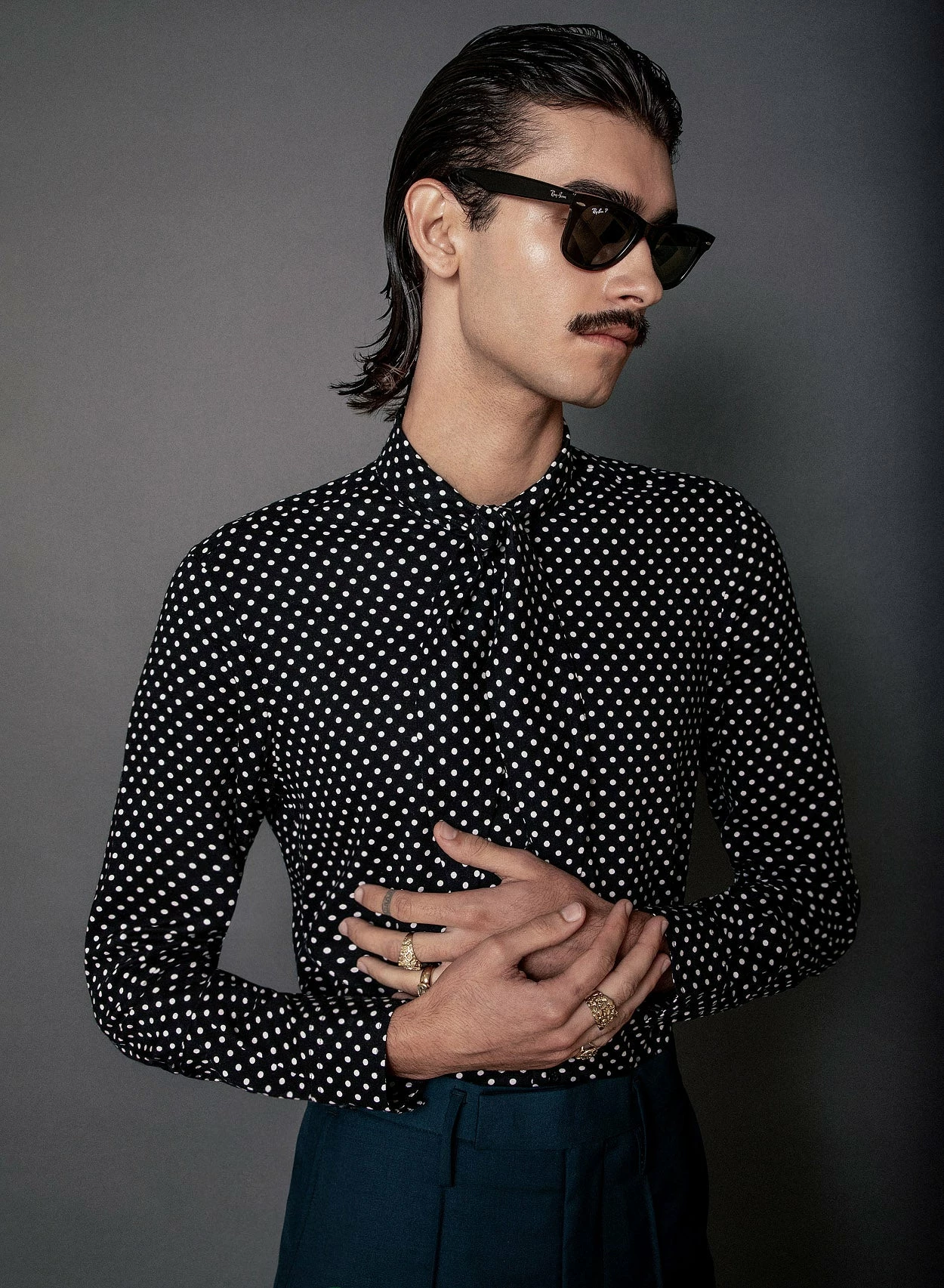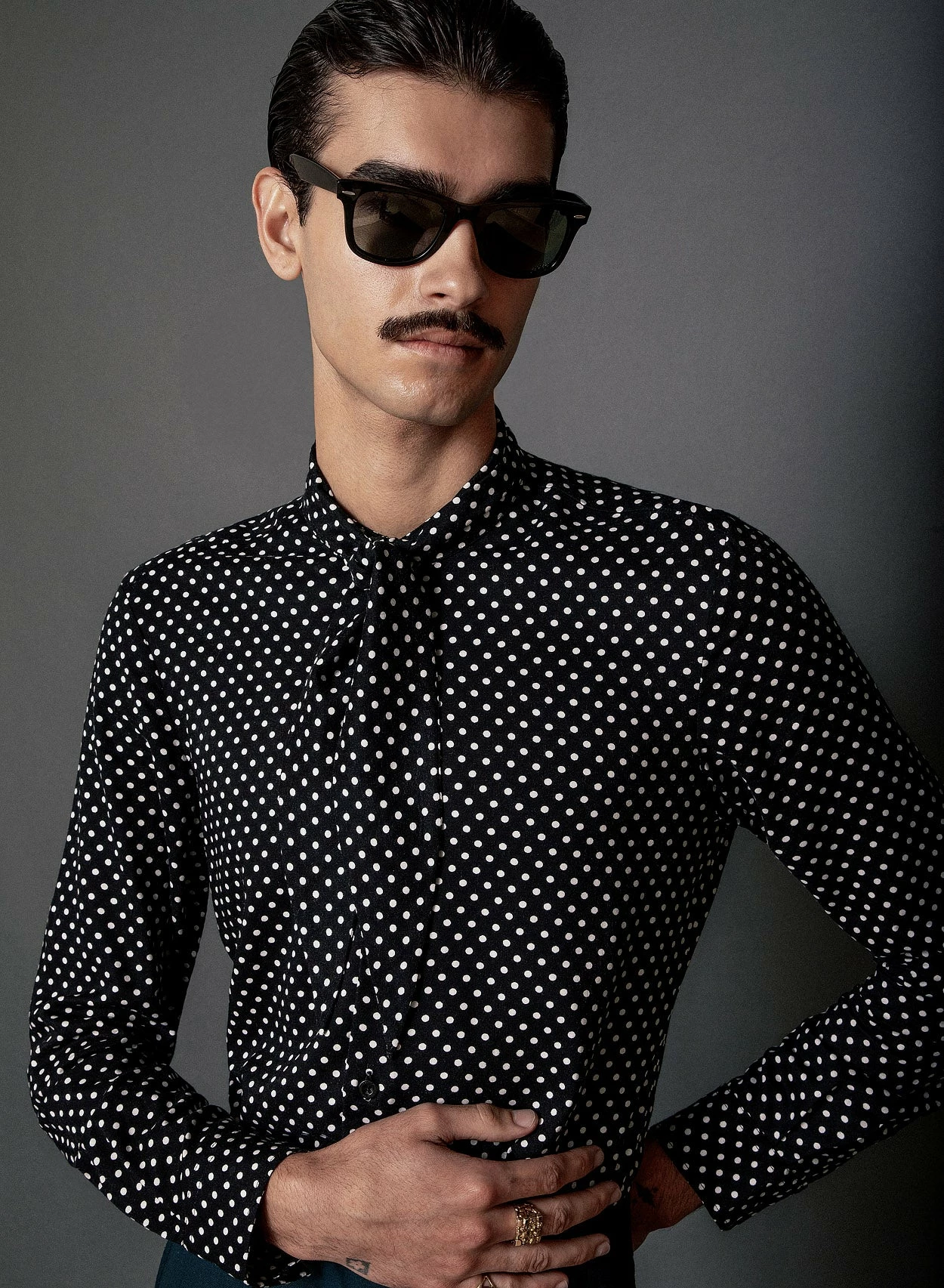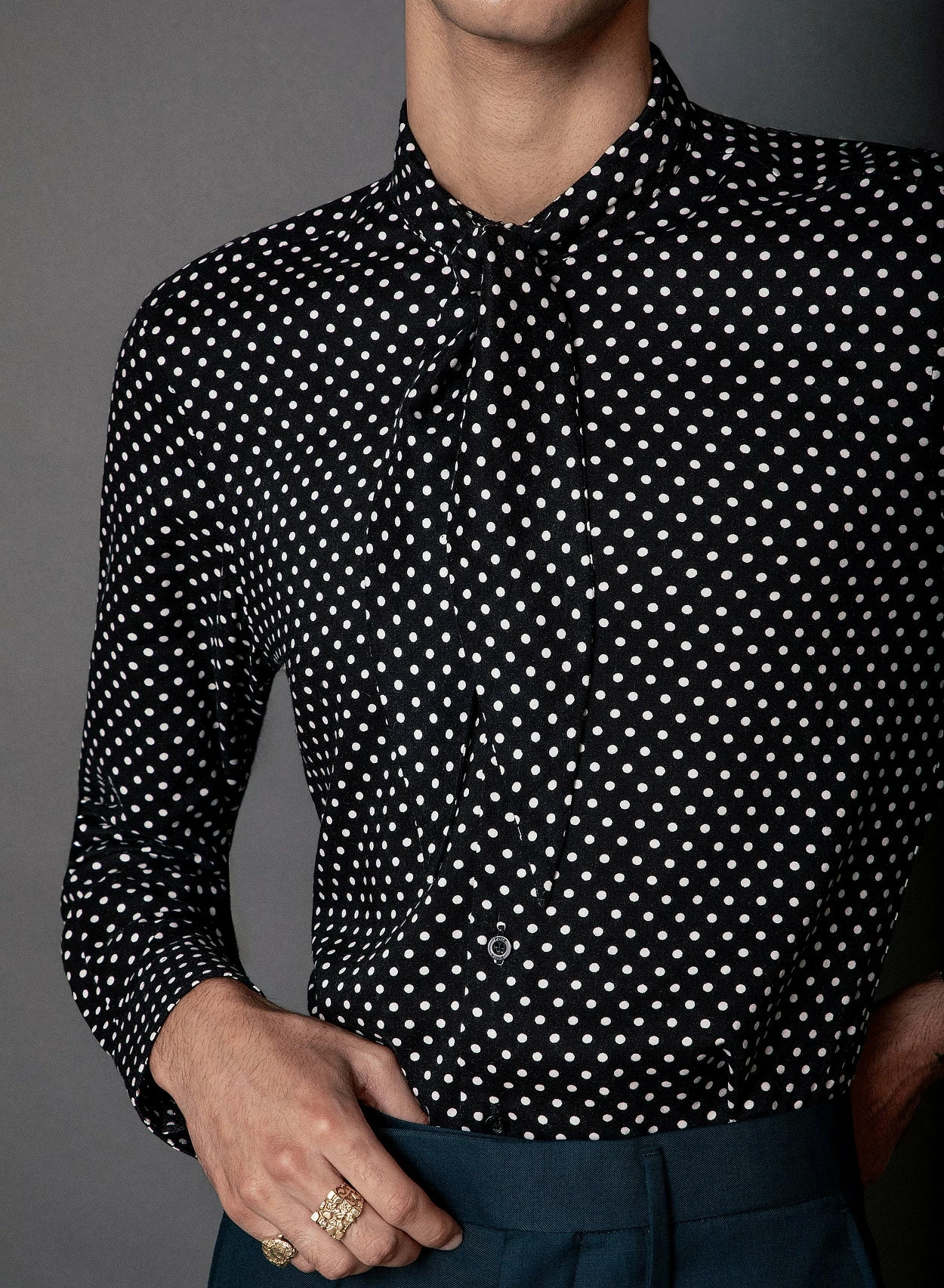 Crafted from sleek black viscose, this shirt is adorned with playful polka dots that add a touch of whimsy to your ensemble. Exclusively PHIX, this print has been designed and created in-house for a truly bespoke look. The pointed tie collar detail adds a unique touch to our signature long sleeved slim fit silhouette. This shirt exudes sophistication with a hint of bold playfulness and pairs perfectly with block colour tailoring or flares for a vintage-feel look.