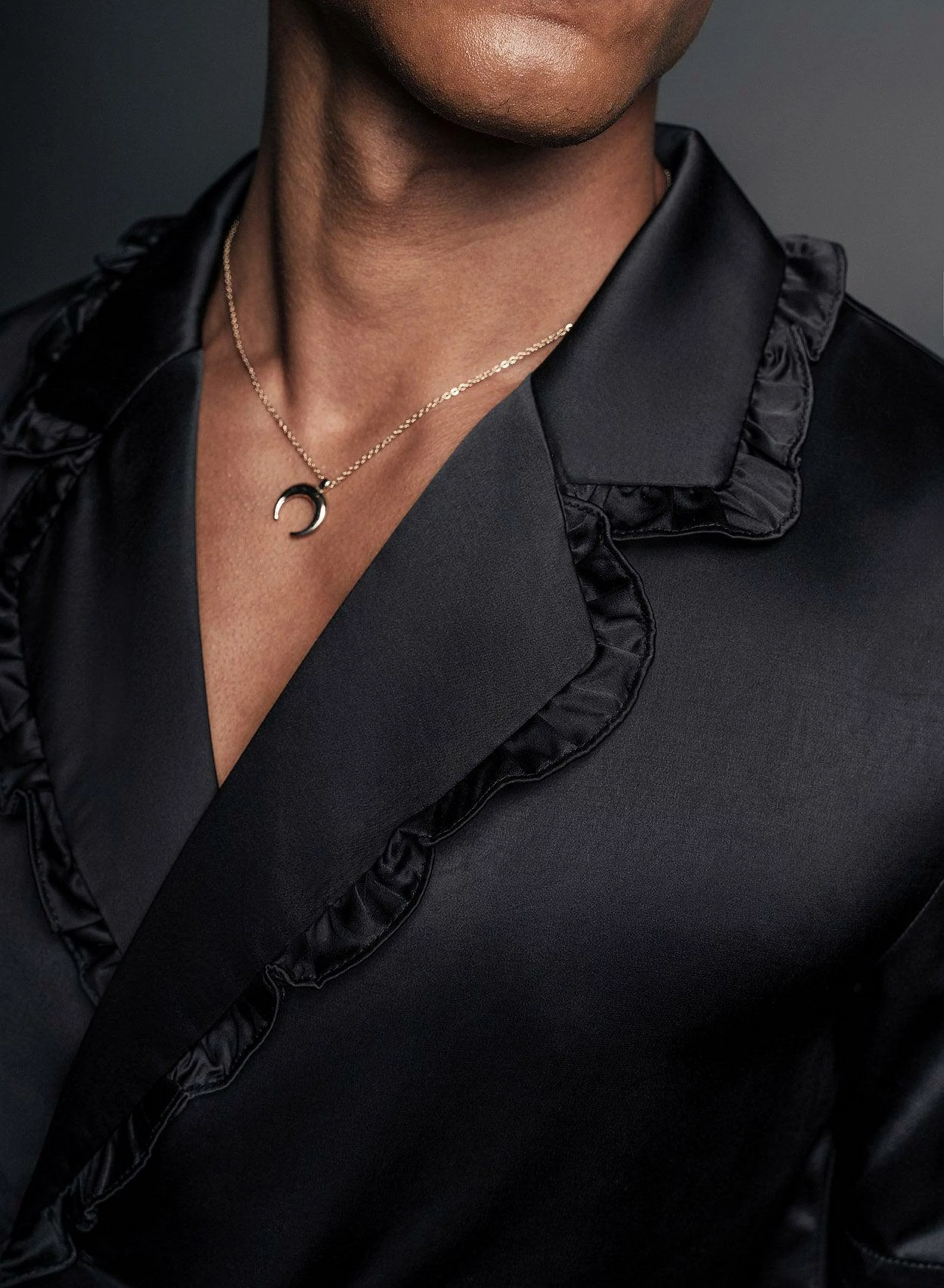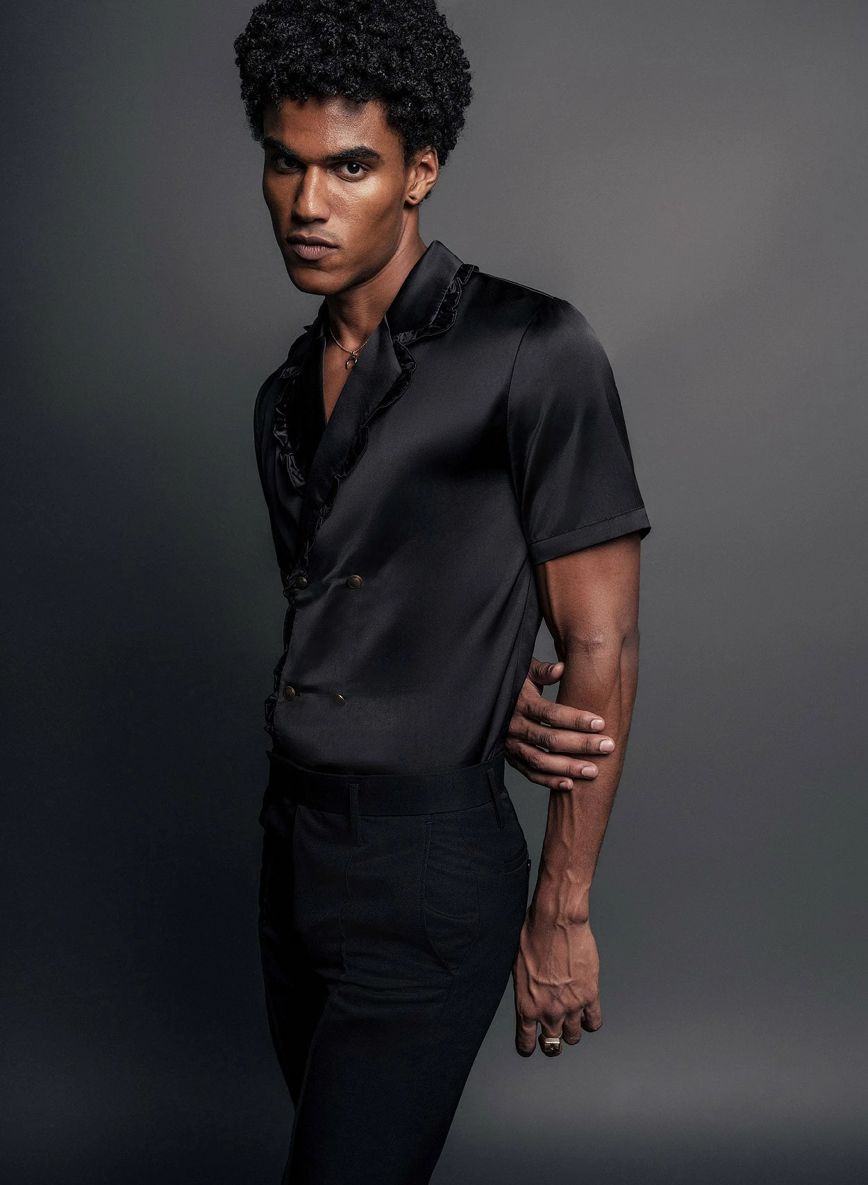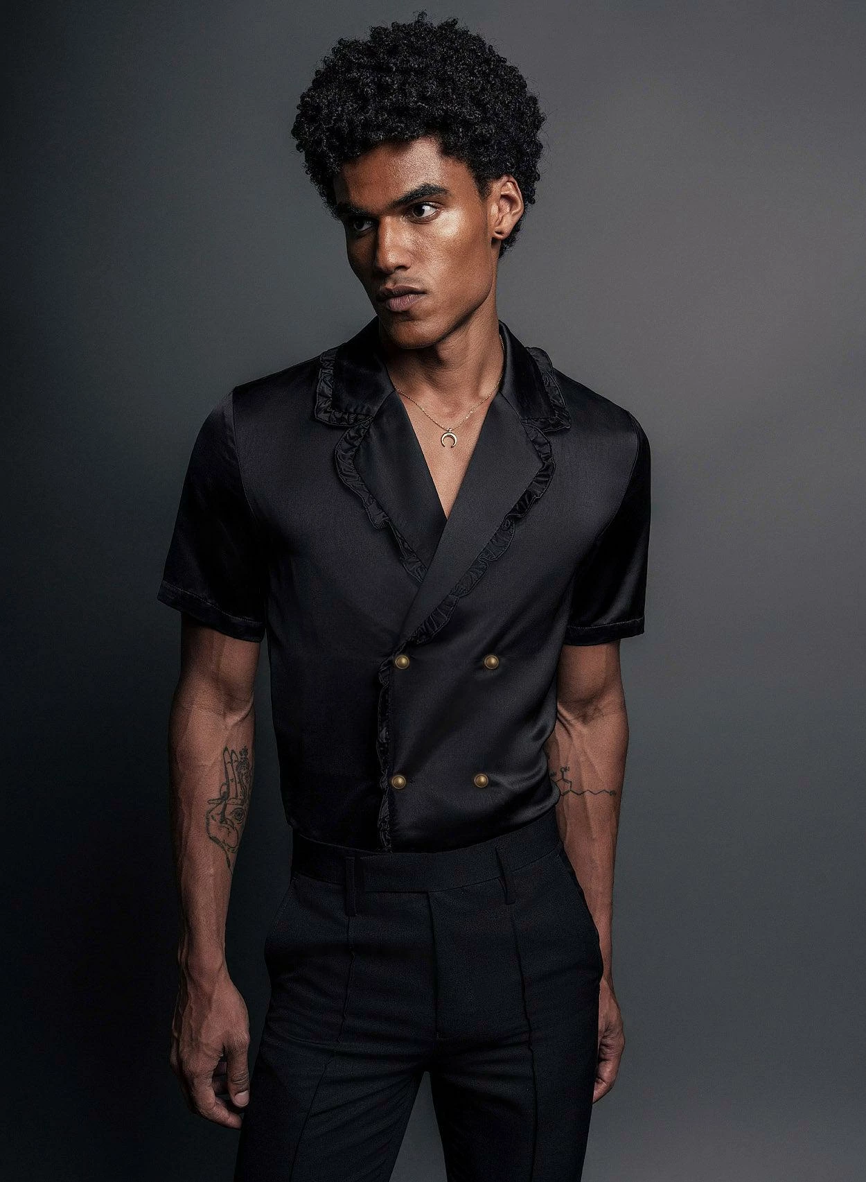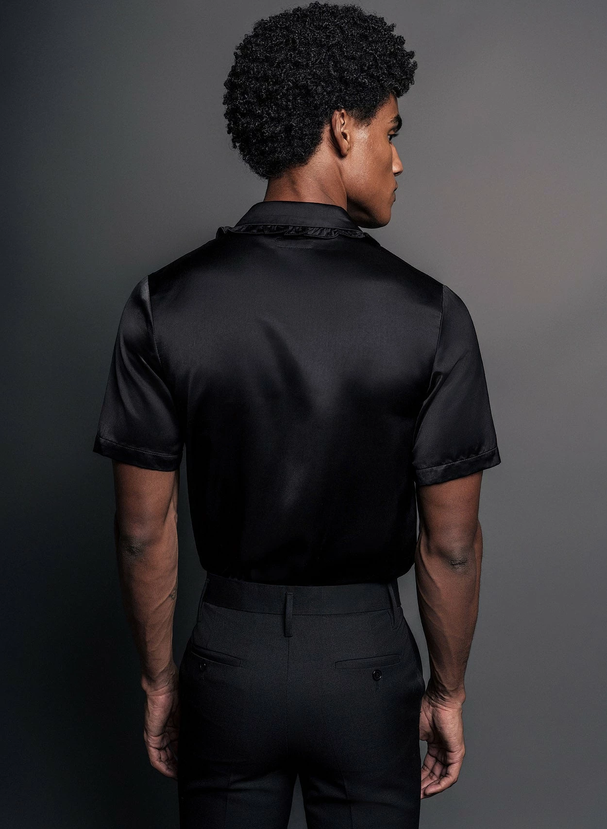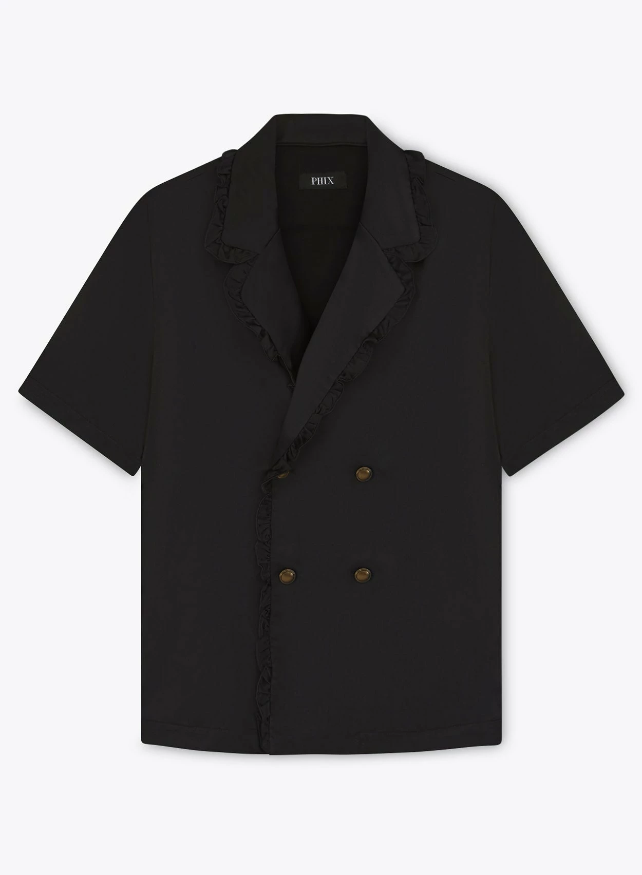 Cut from lustrous smooth black satin material, this unique shirt has a double-breasted silhouette with ruffled lapels and duo metal button detailing. Tailored for a relaxed fit with short sleeves, pair it with lighter shades of tailoring for a cool contrast look. Also available in champagne.