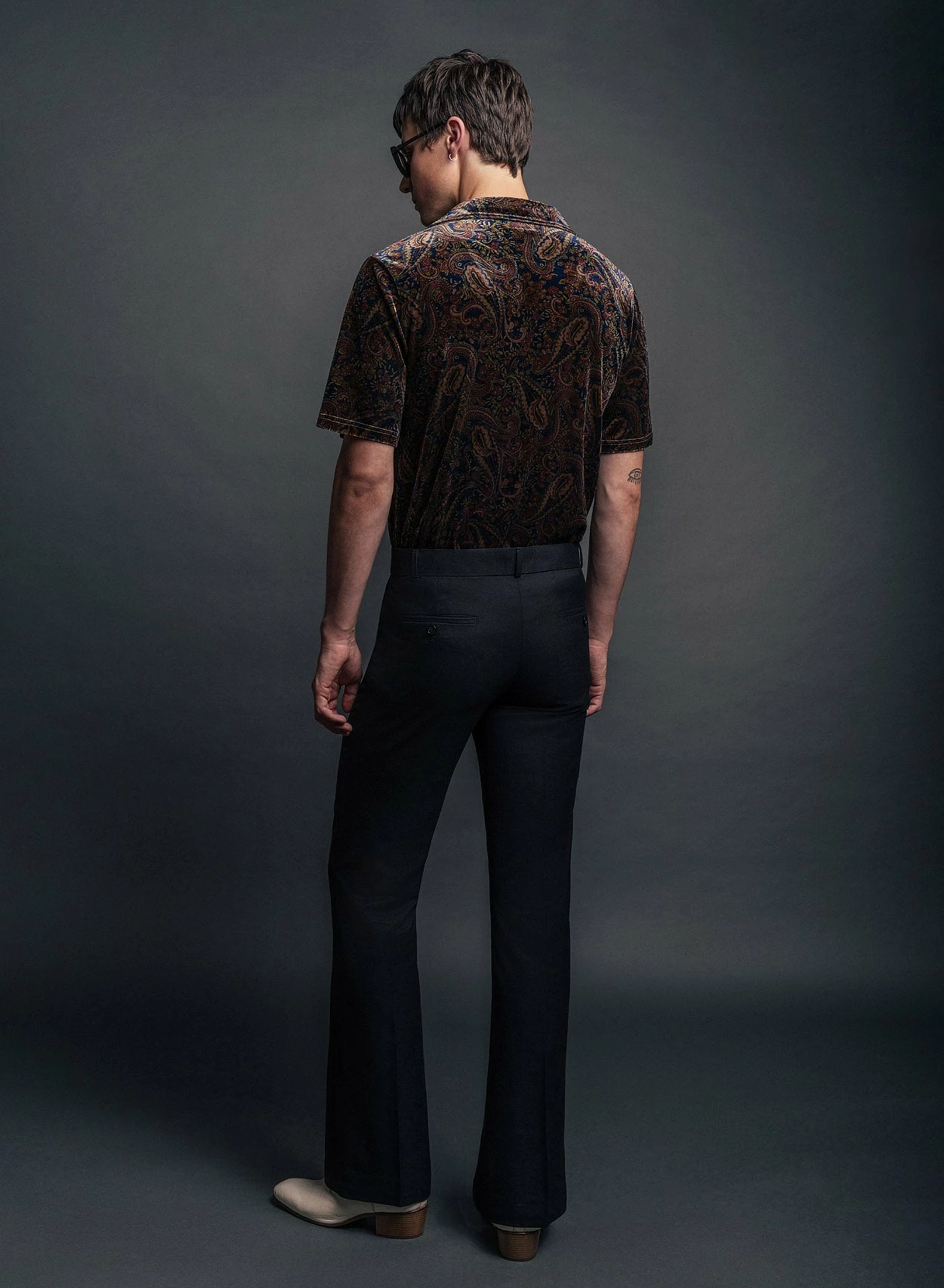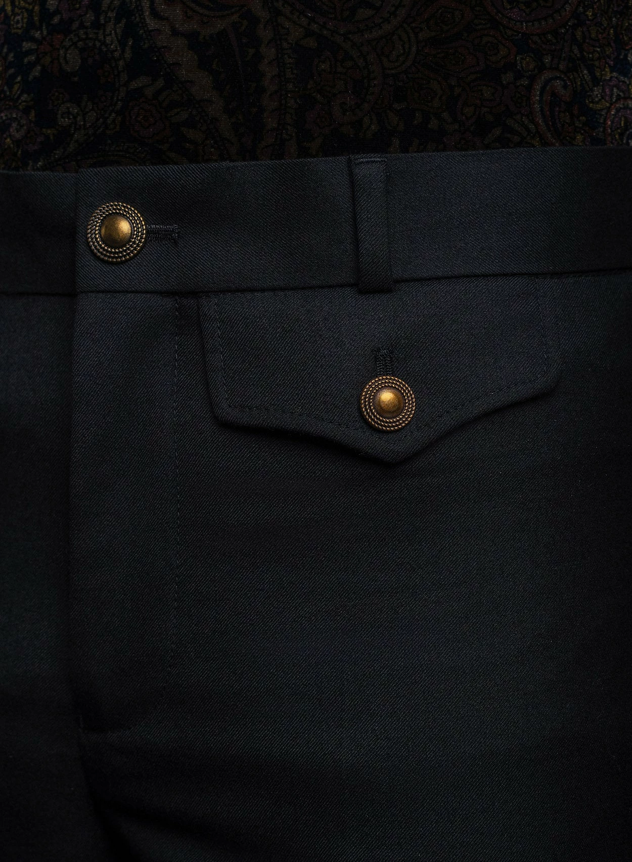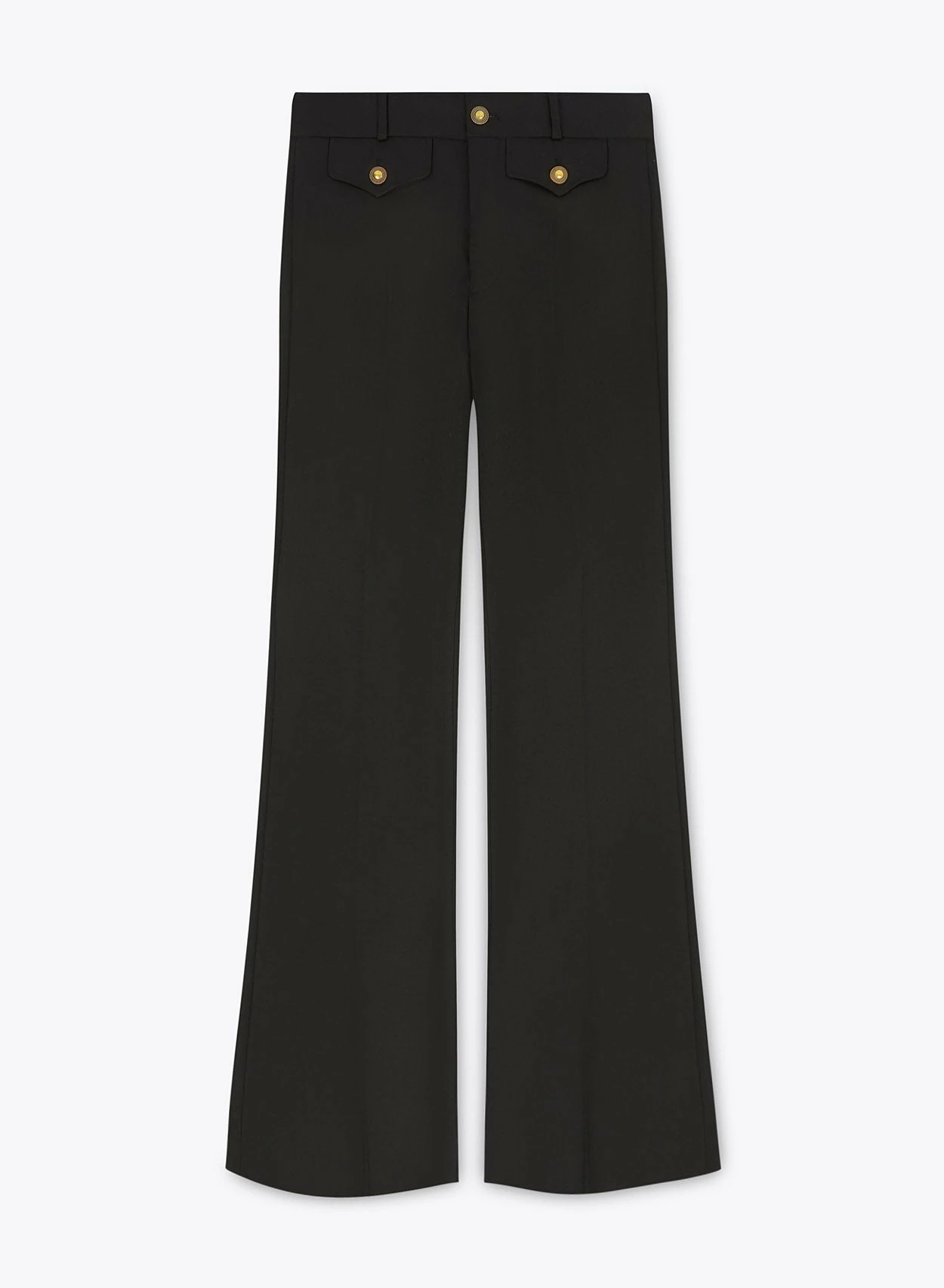 Crafted from black wool-rich material and tailored for a slim-fit with a 1970’s tapered flare silhouette, these trousers feature two front flap pockets with polished gold button detailing and centre leg press. These trousers pair perfectly with the matching cropped blazer for a cohesive suiting look, ideal for a wedding or event.