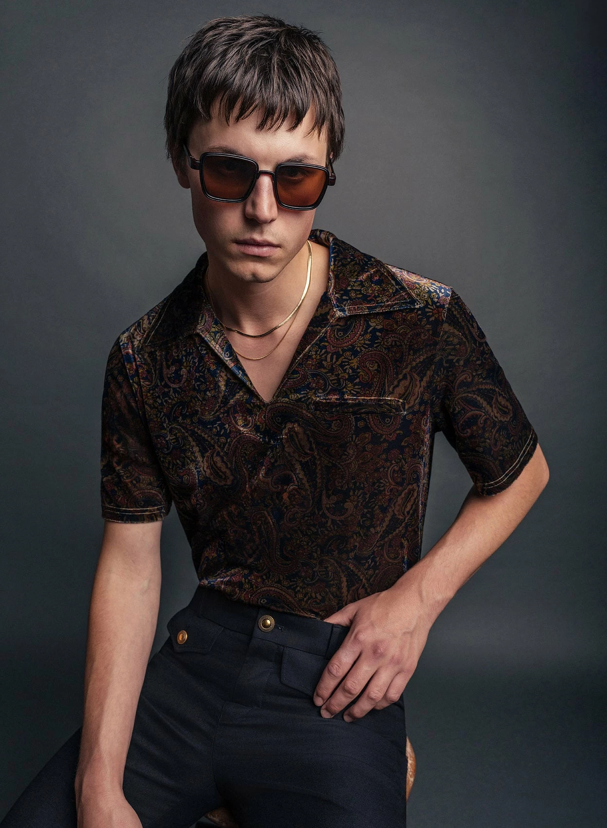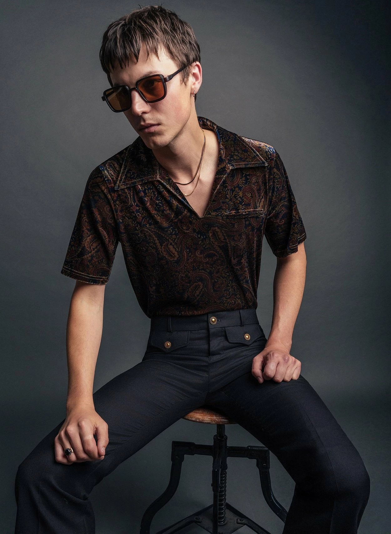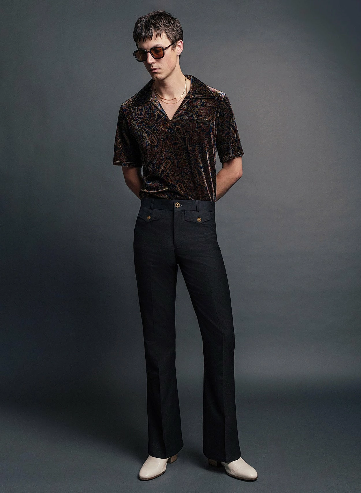 Crafted from black wool-rich material and tailored for a slim-fit with a 1970’s tapered flare silhouette, these trousers feature two front flap pockets with polished gold button detailing and centre leg press. These trousers pair perfectly with the matching cropped blazer for a cohesive suiting look, ideal for a wedding or event.