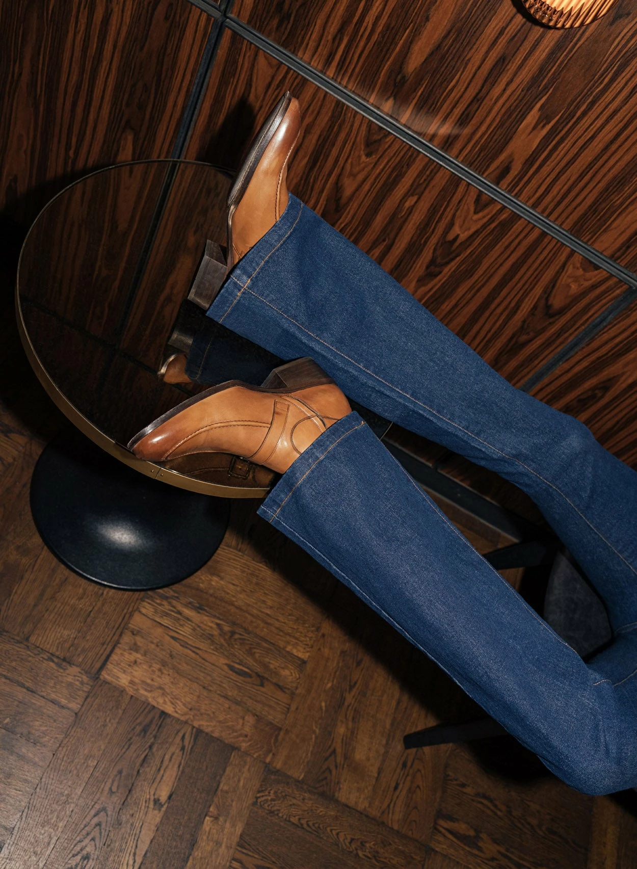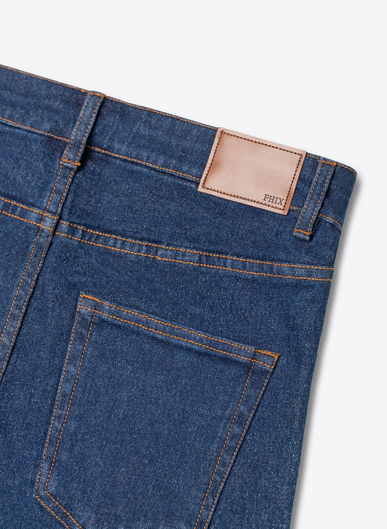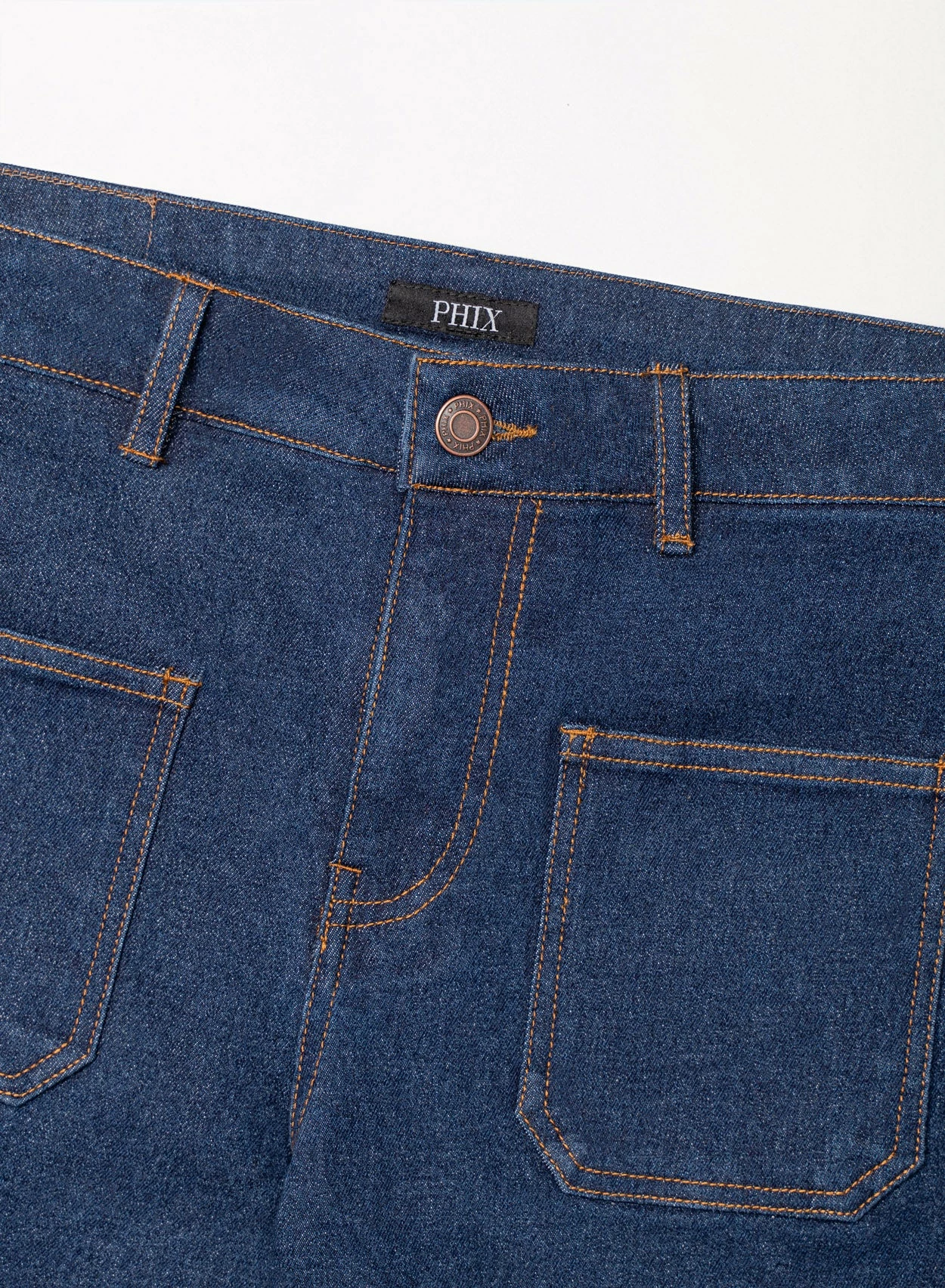 A new cut for SS22, these jeans combine meticulous design and cutting edge manufacturing with a more relaxed, bootcut silhouette. Crafted from high-grade dark wash cotton denim, this style is tailored for a looser fit to the upper leg and then tapers out to a flare at the ankle. Finished with external pockets front and back for a unique look, bespoke brass-effect buttons embossed with the PHIX logo, and a high-quality YKK zipper. Also available in black.