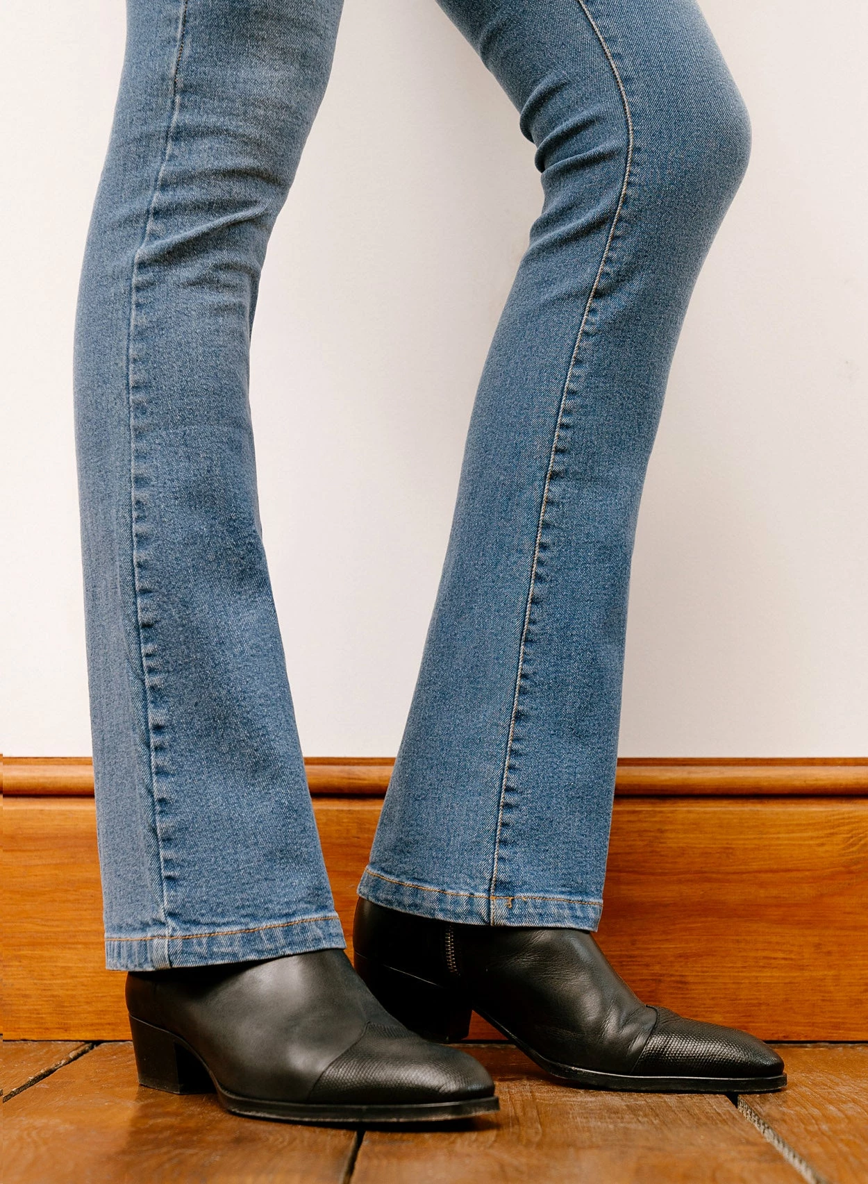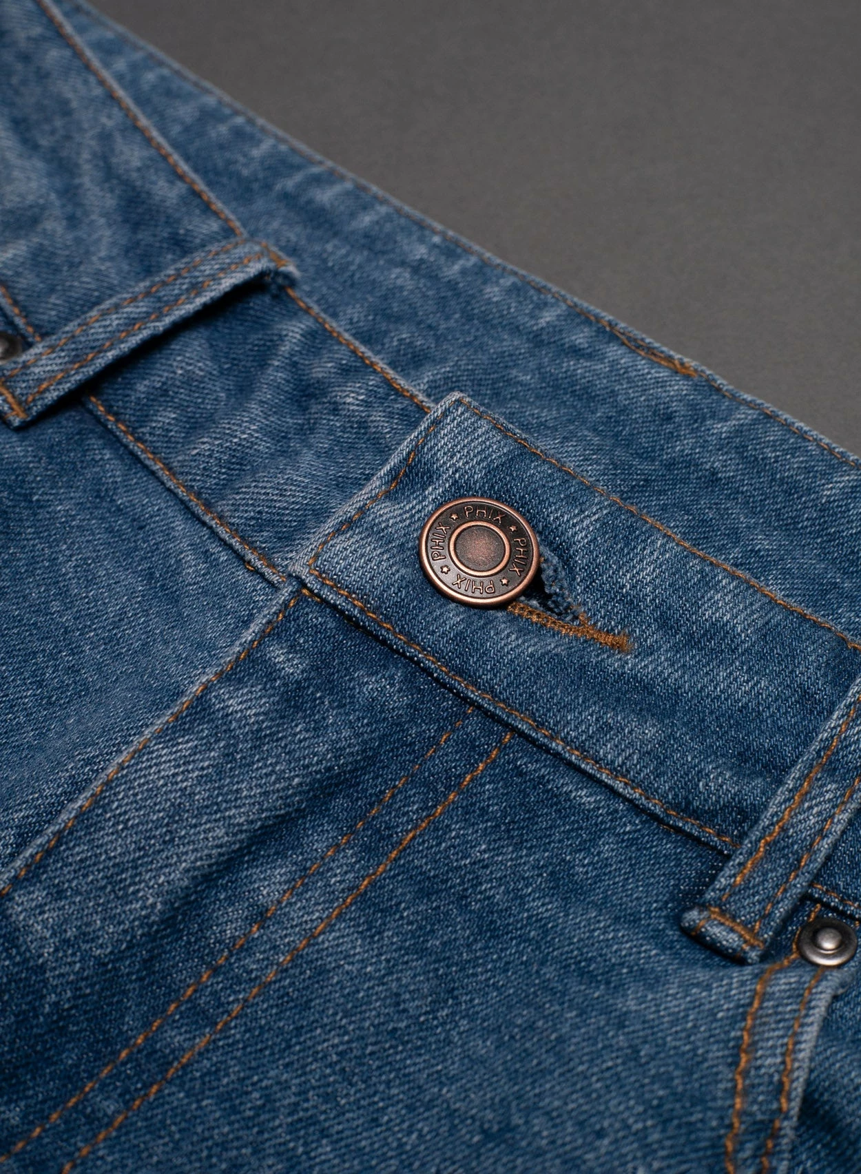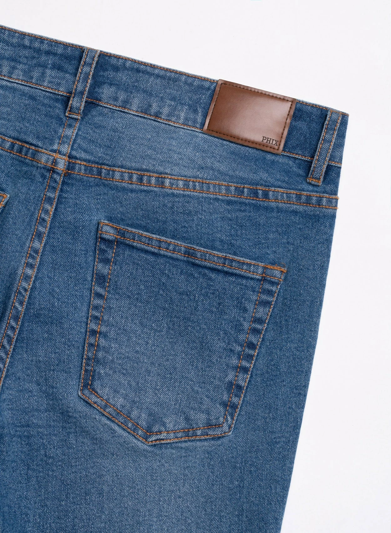 Our denim flared jeans feature a seventies-inspired silhouette. Crafted from high-grade cotton, this style is tailored for a slim fit to the upper leg and then tapers out to a flare at the ankle. Bespoke brass effect buttons embossed with the PHIX logo, and a high-quality YKK zipper, finish the look. Wear with heeled Chelsea boots for winter.