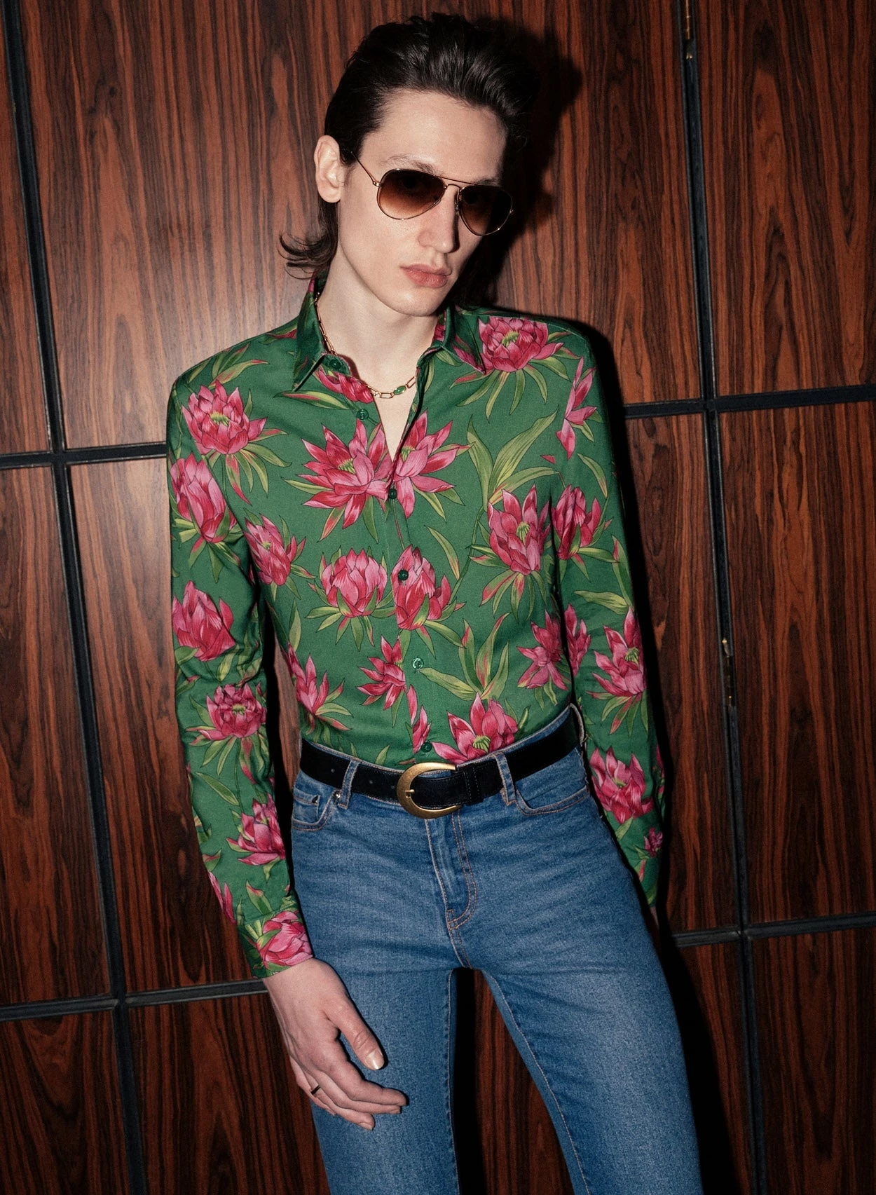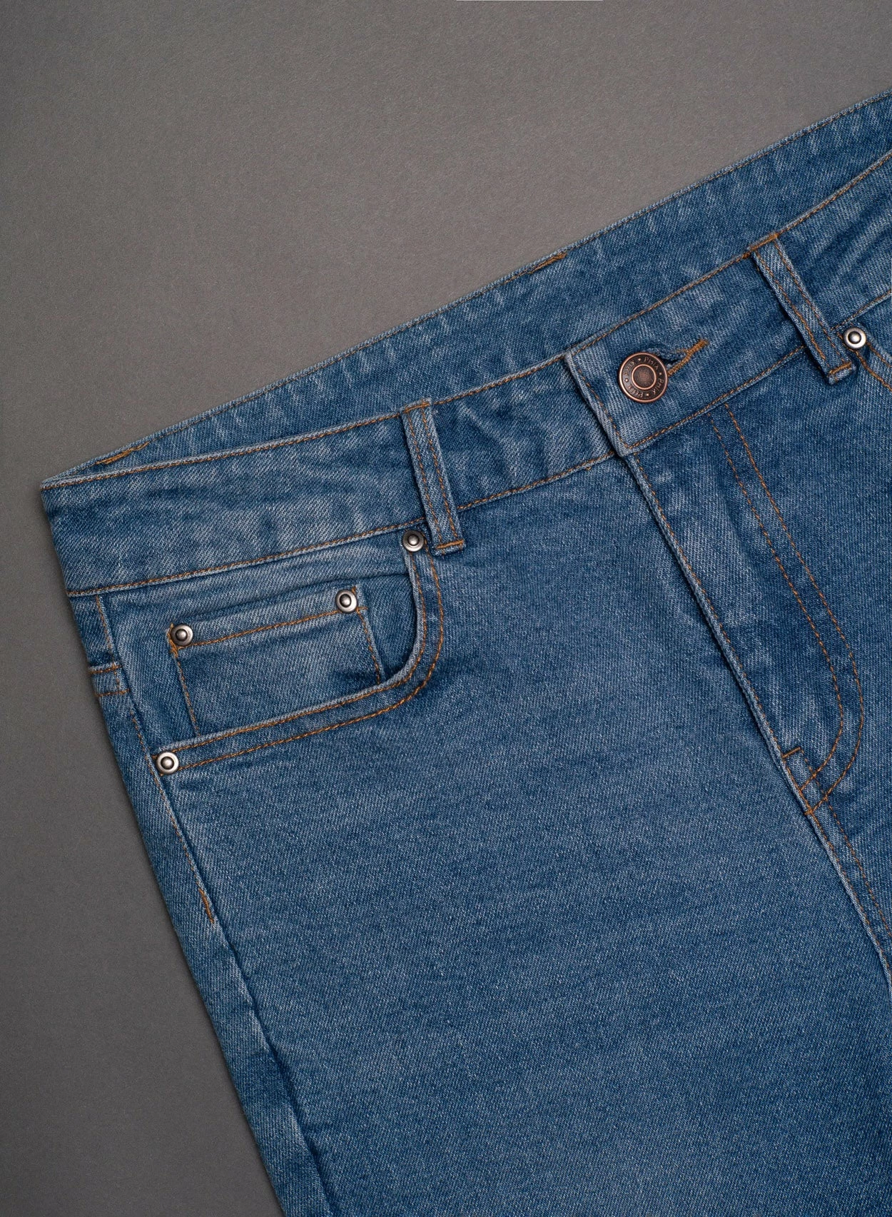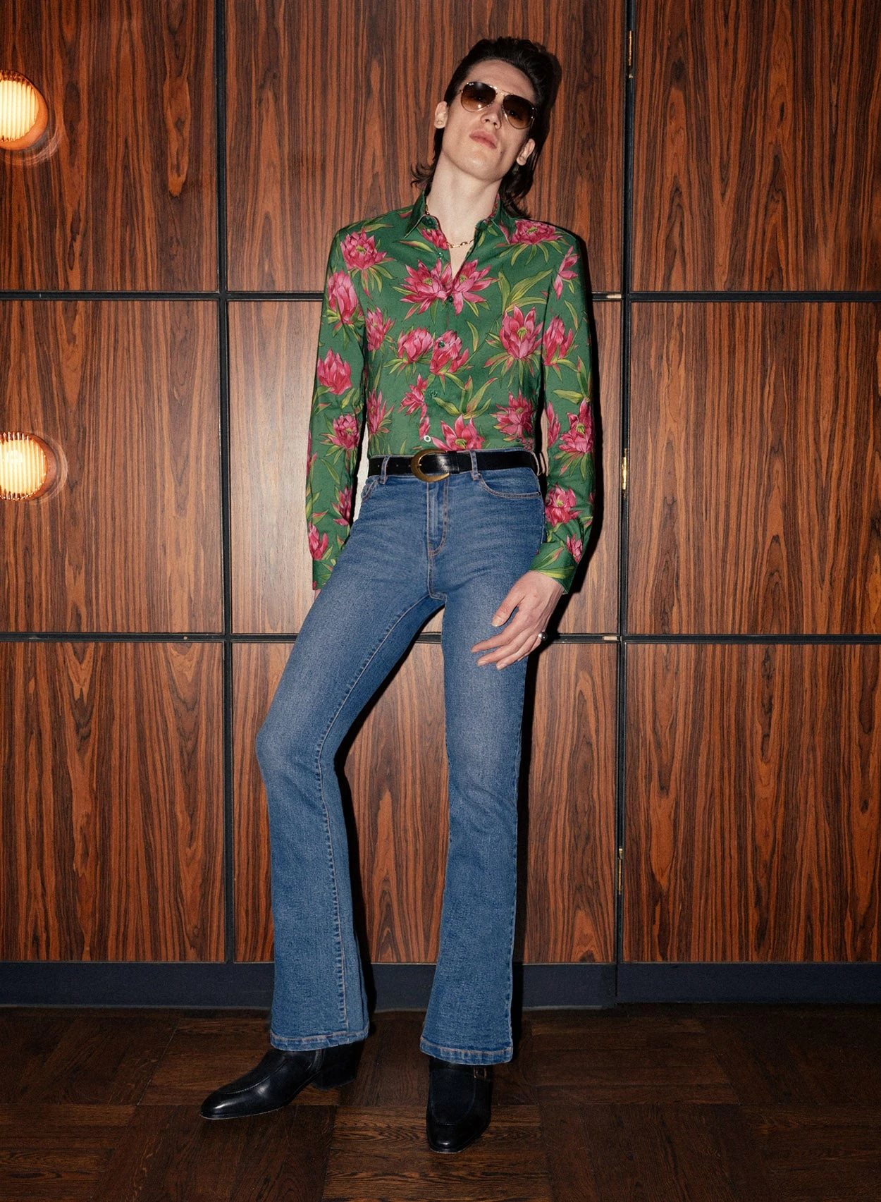 Our denim flared jeans feature a seventies-inspired silhouette. Crafted from high-grade cotton, this style is tailored for a slim fit to the upper leg and then tapers out to a flare at the ankle. Bespoke brass effect buttons embossed with the PHIX logo, and a high-quality YKK zipper, finish the look. Wear with heeled Chelsea boots for winter.