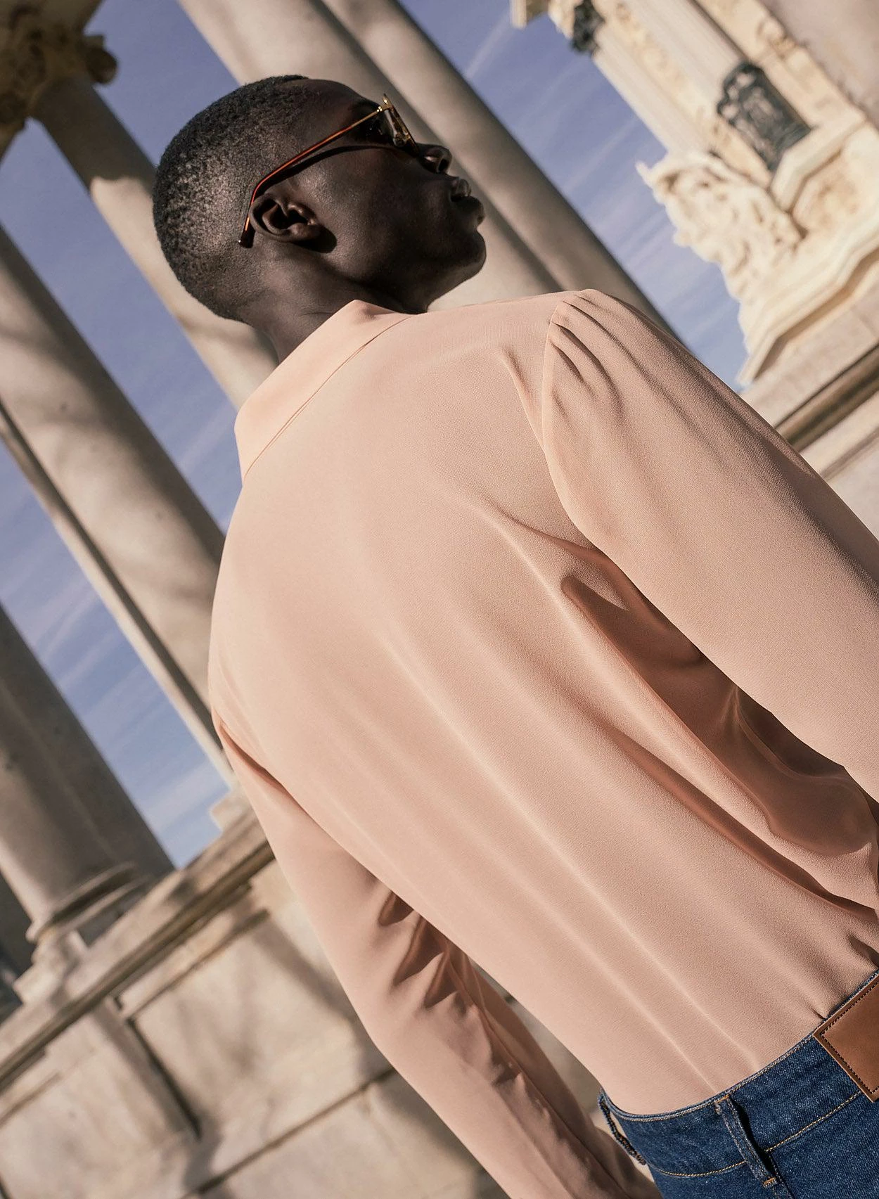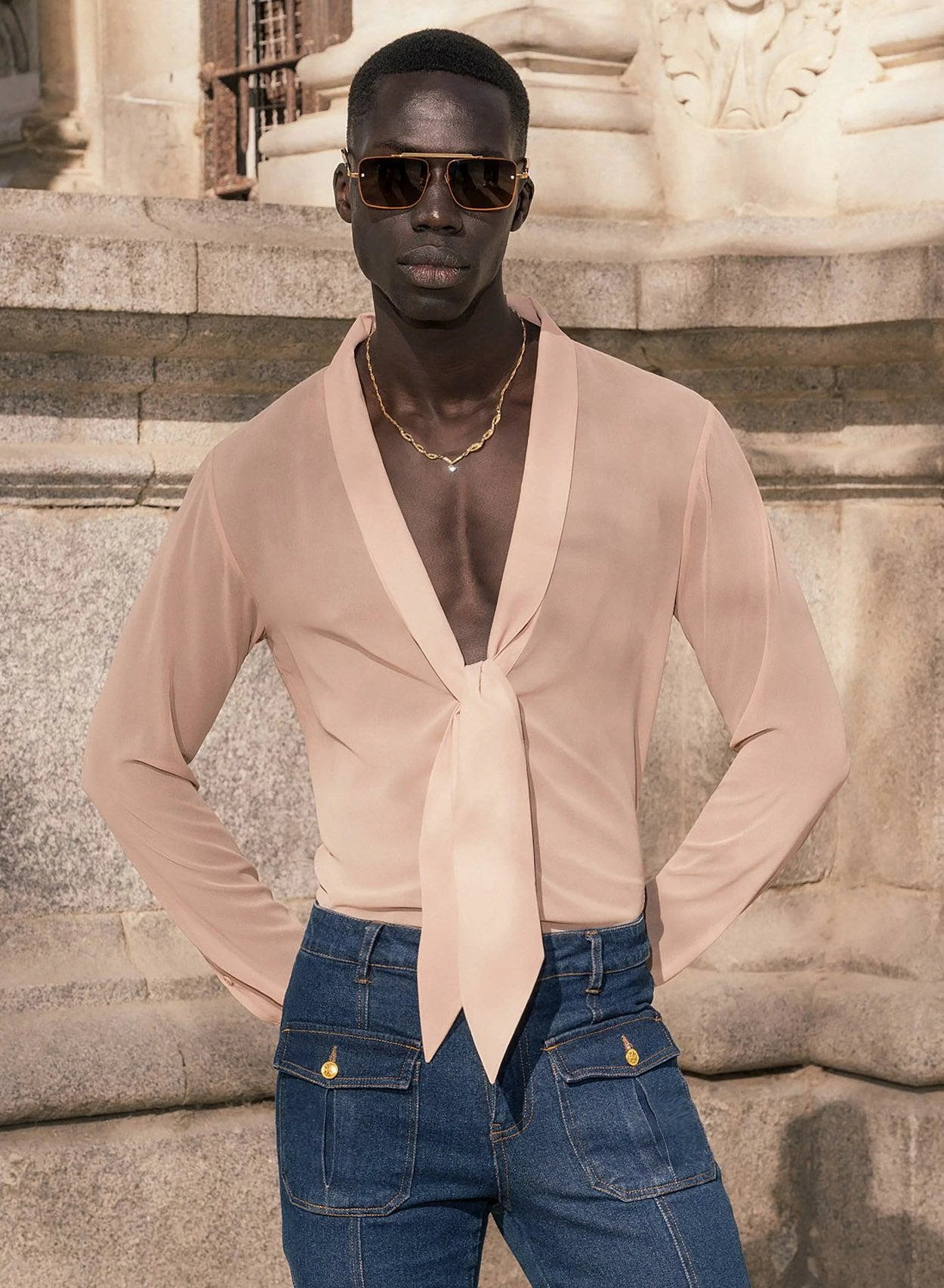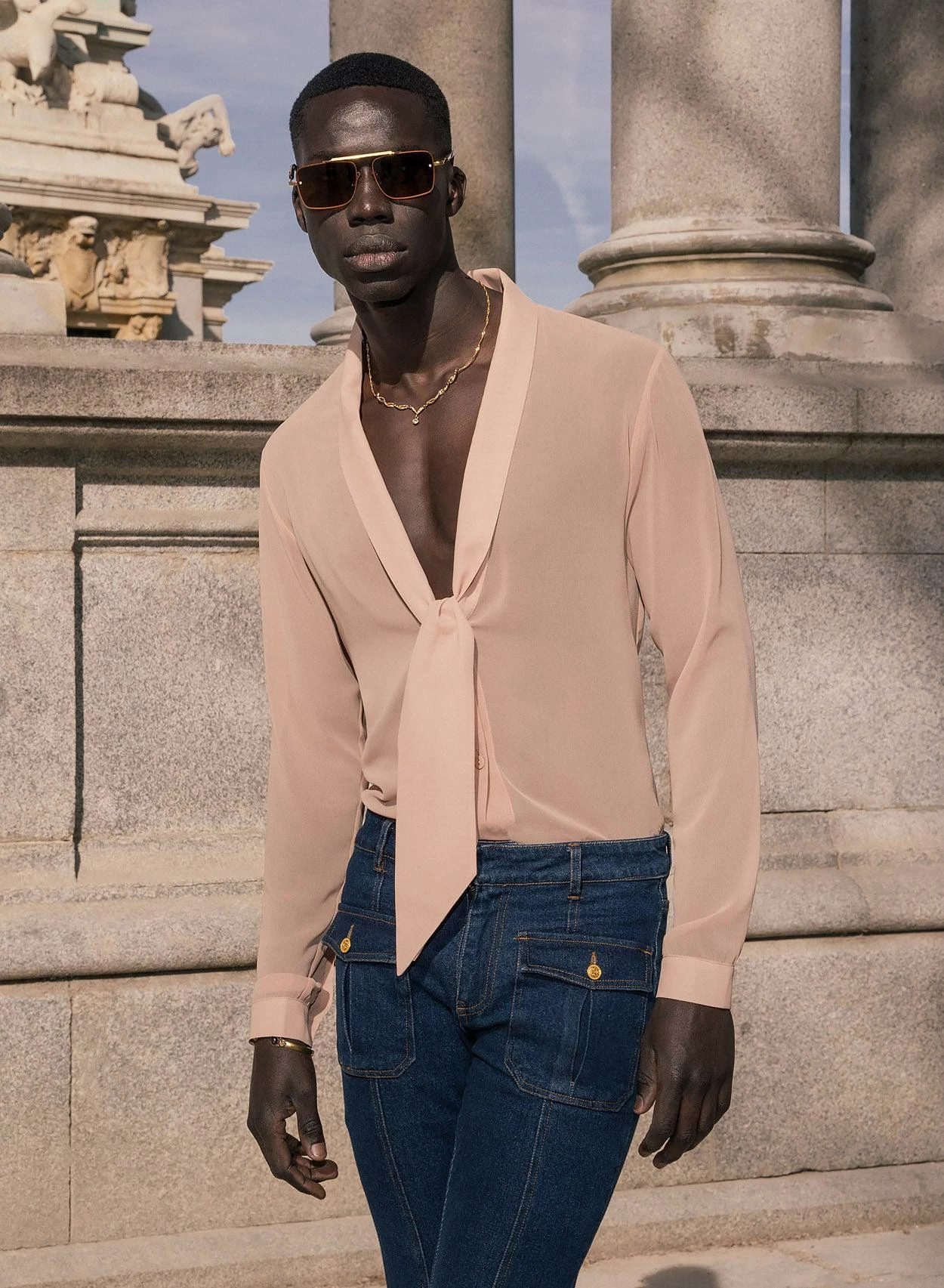 Cut from smooth semi-sheer camel coloured chiffon for our signature tailored fit with a low cut, tie collar this is a true statement shirt. Complete with fitted cuffs, pair yours with tailored denim and leather boots for effortless casual daytime cool. Also available in black.