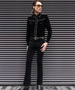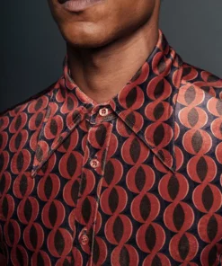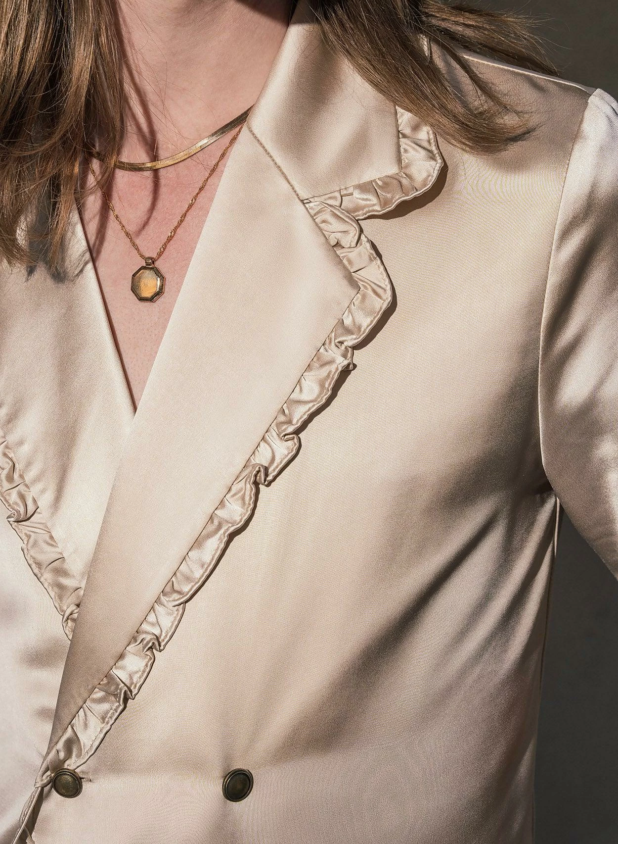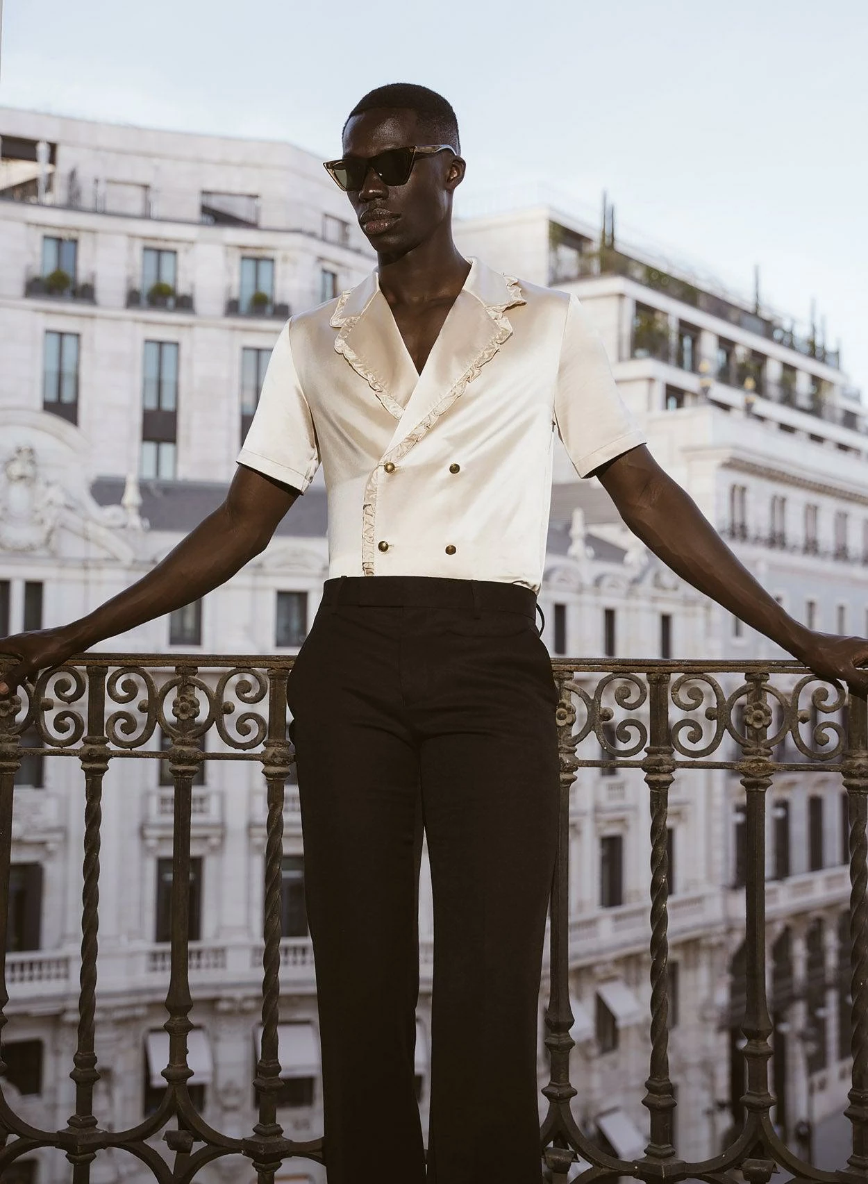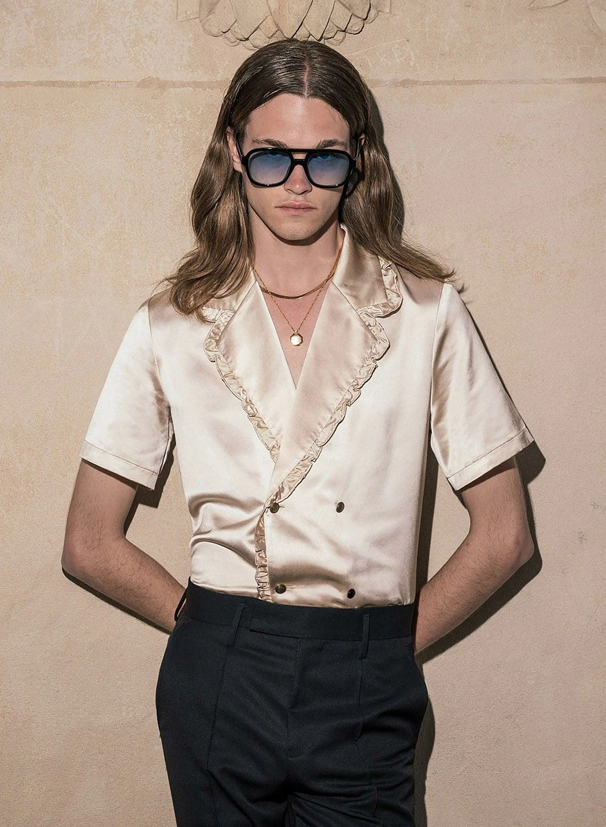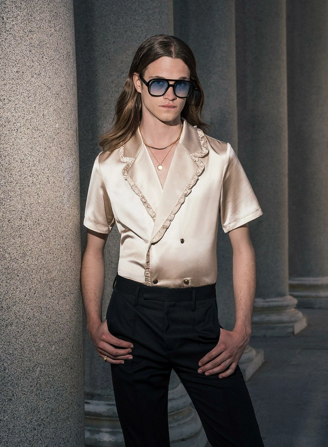 Cut from lustrous smooth champagne coloured satin material, this unique shirt has a double-breasted silhouette with ruffled lapels and duo metal button detailing. Tailored for a relaxed fit with short sleeves, pair it with darker shades of tailoring for a cool contrast look. Also available in black.
