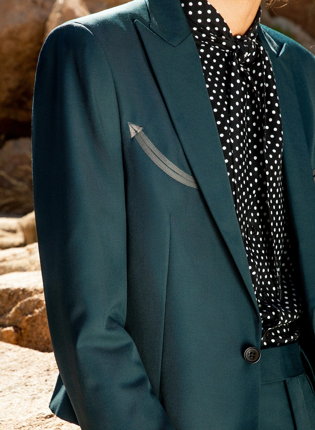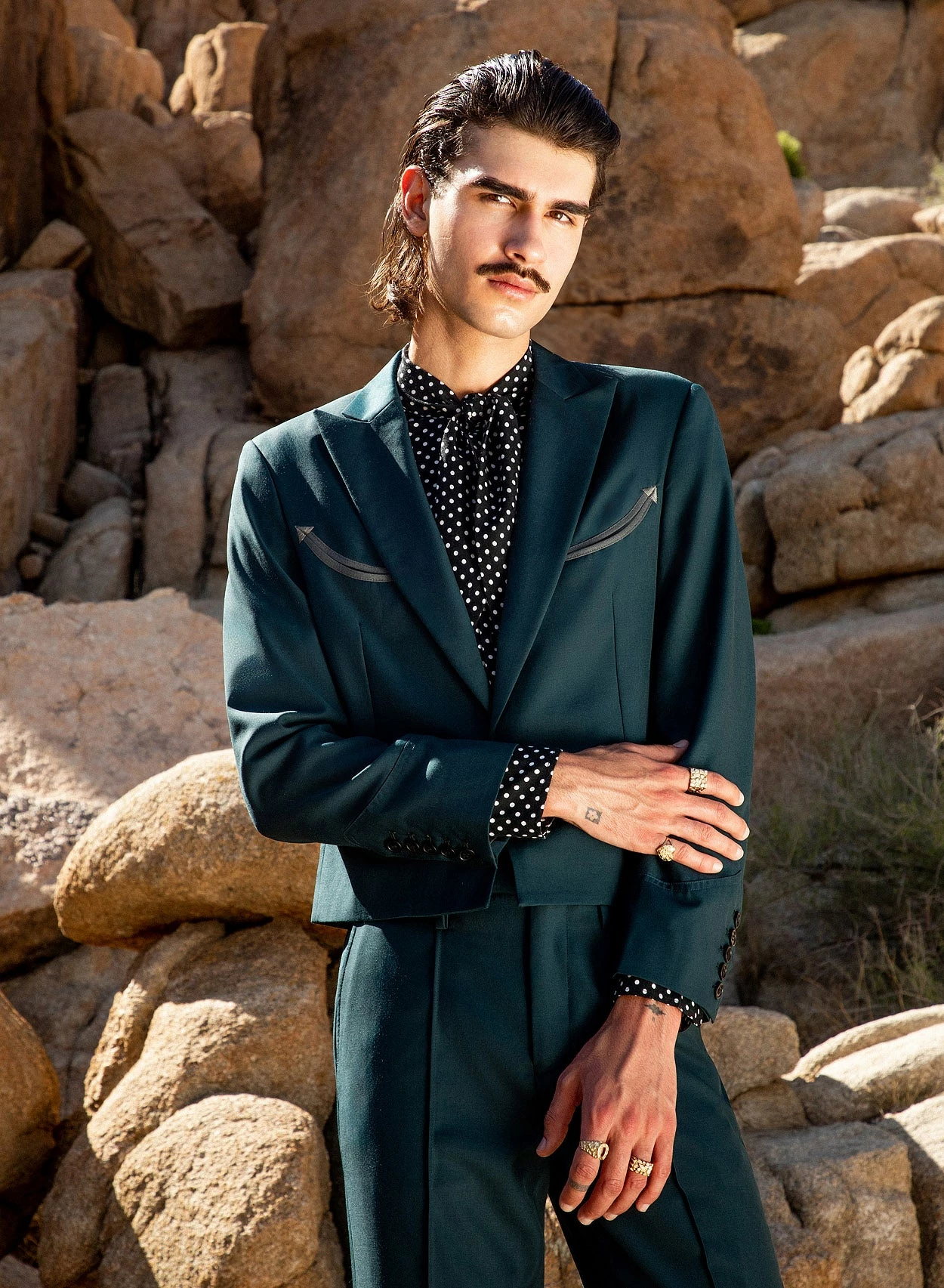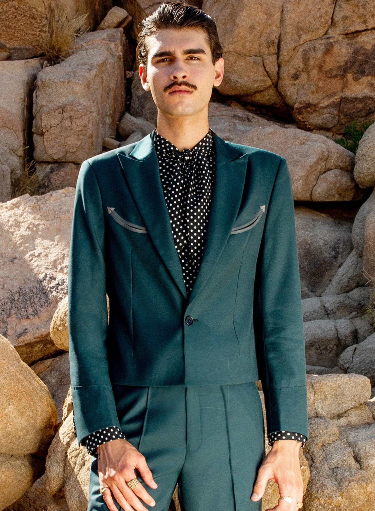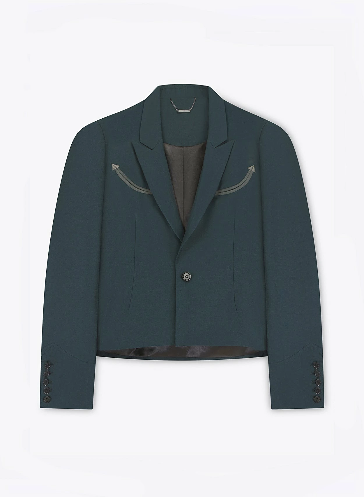 Crafted from luxurious dark green hue wool-rich material, this blazer combines classic style with a touch of western charm. Featuring a tailored and cropped silhouette with peaked lapels and a single button closure. Pair with the matching flared trousers for a full suit look, ideal for a formal event or wedding.