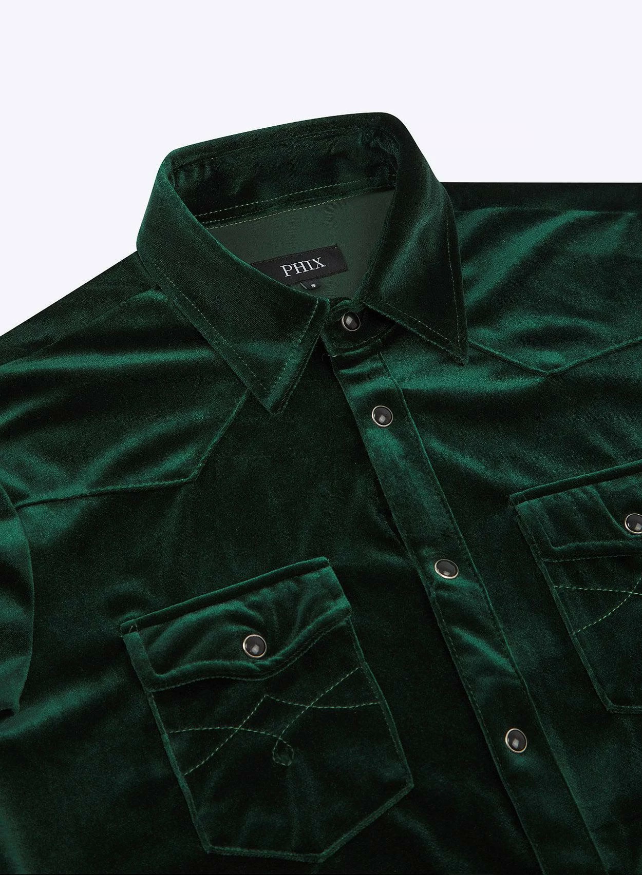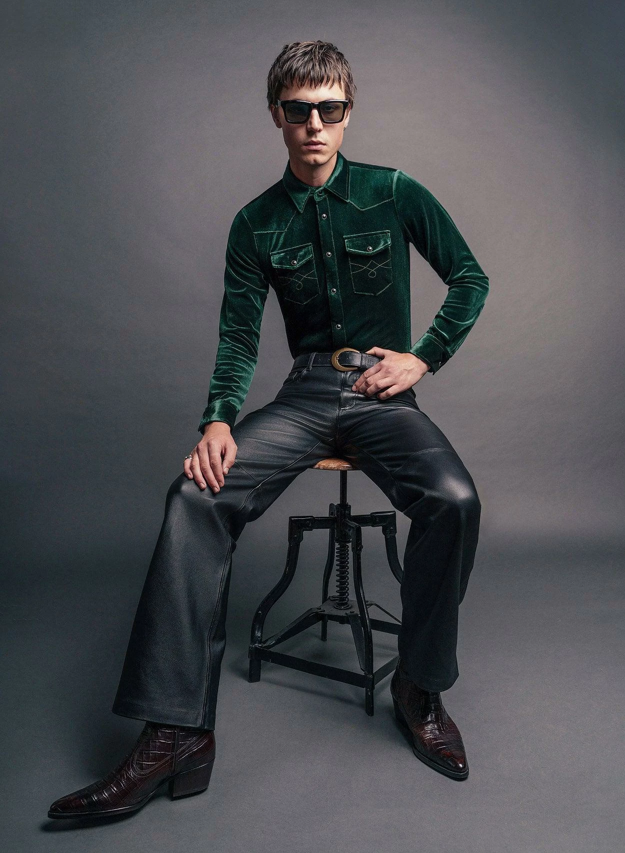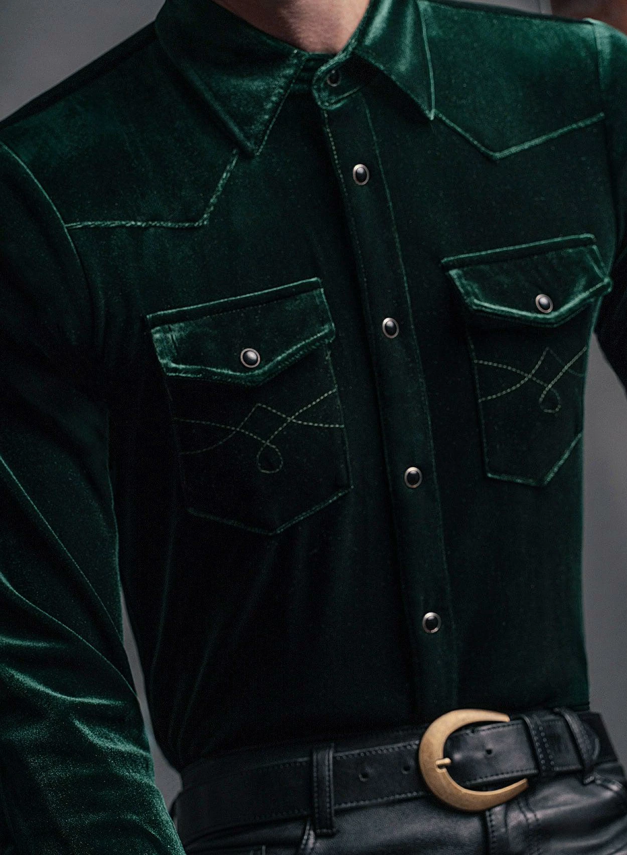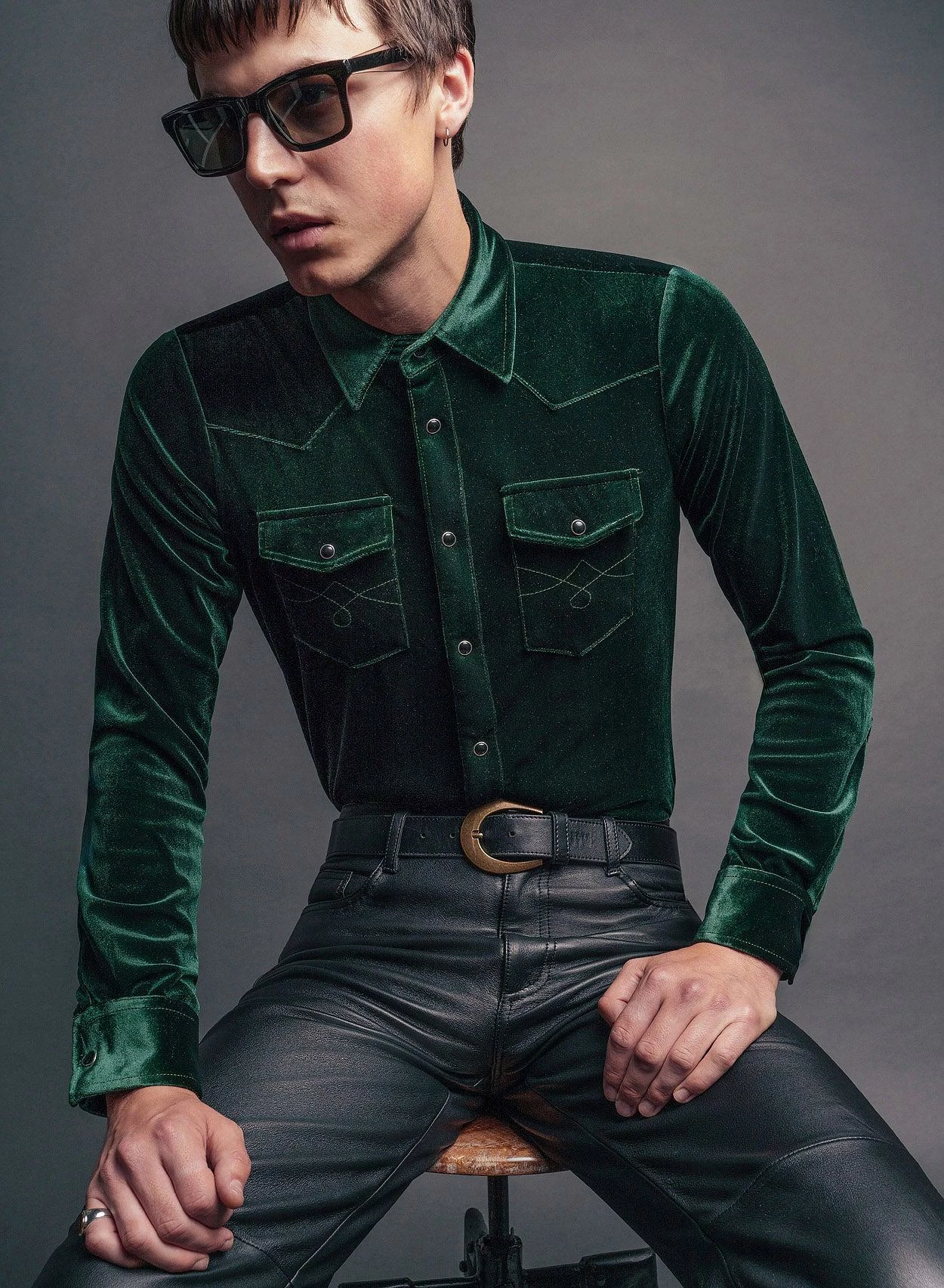 Crafted from a luxuriously plush sea green velvet, this western infused shirt is finished with silver edged, black popper buttons for added ease of wear and features functional angular flap pockets on the chest. Tuck yours into high-waisted denim flares for a vintage American western look. Also available in purple or teal via our shirting category.
