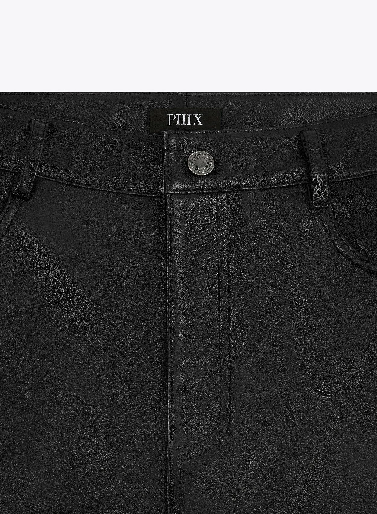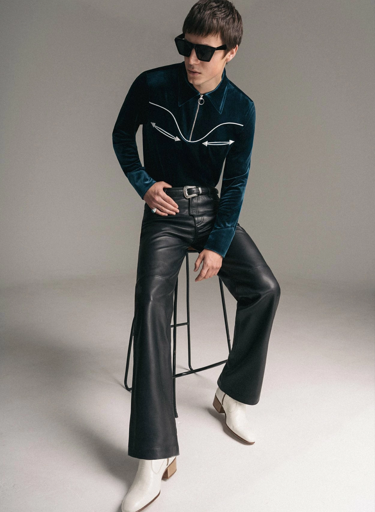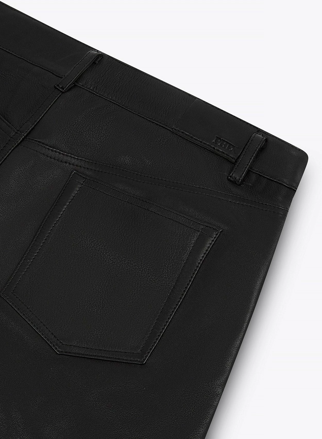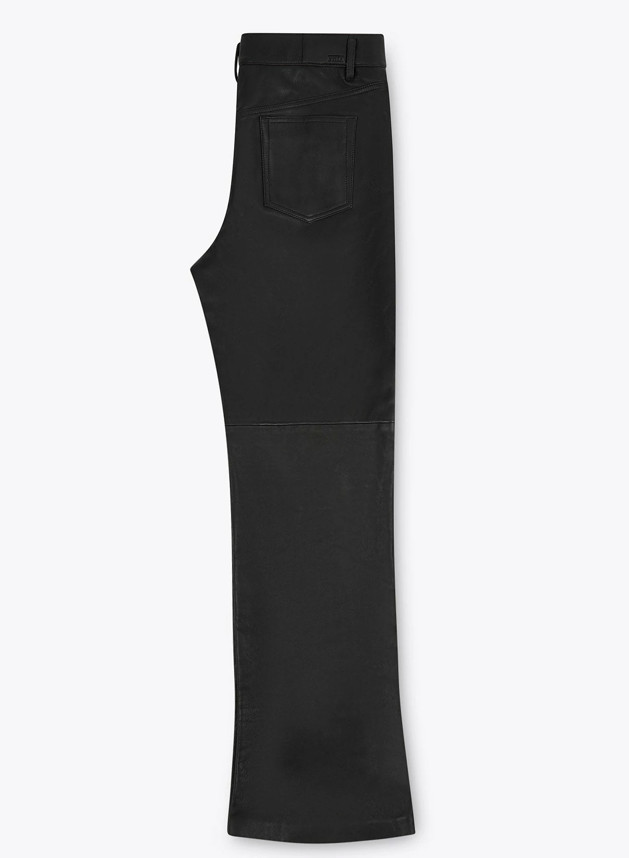 Meticulously tailored from smooth black 100% genuine lambskin leather, these trousers boast a wider legged silhouette with a high waistline and tapered, subtle flare cut. A subversive style staple, dress them up with bold tailoring or pair for a relaxed, rugged look with a tee and boots. Fully lined for ease of wear.