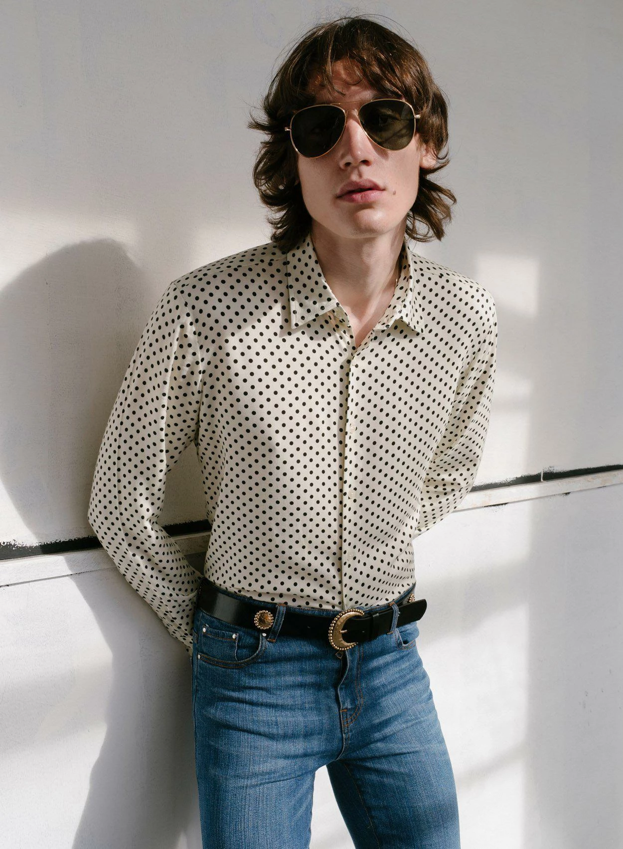 Crafted from a relaxed lightweight viscose material with a vintage feel black micro polka dot print and cut for a tailored silhouette. This shirt is finished with our signature pointed collar and monogram embossed buttons throughout. Pair with linen trousers for easy summer style.