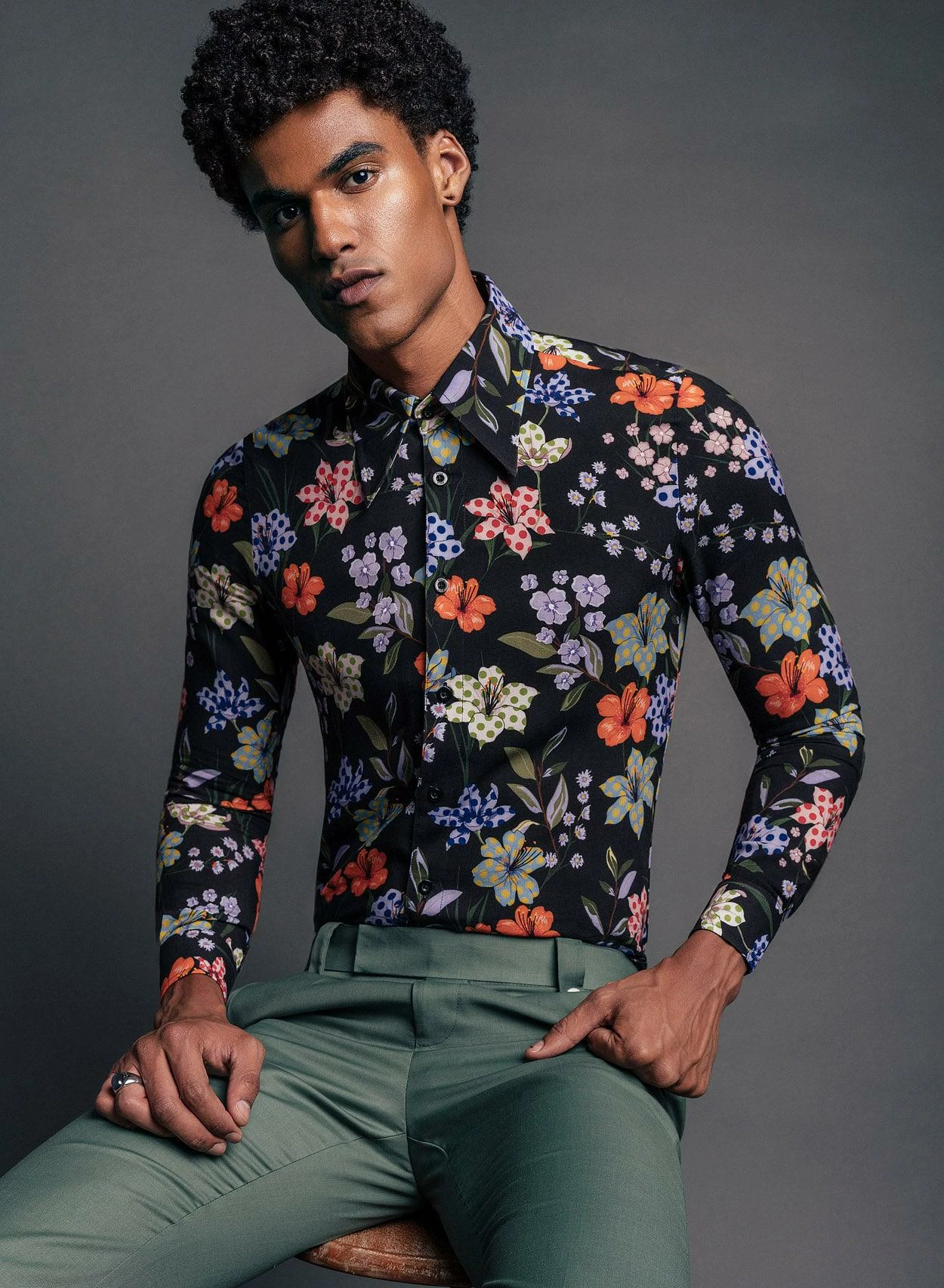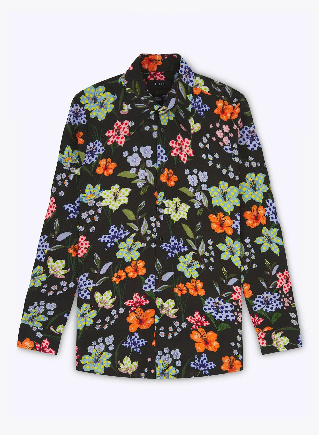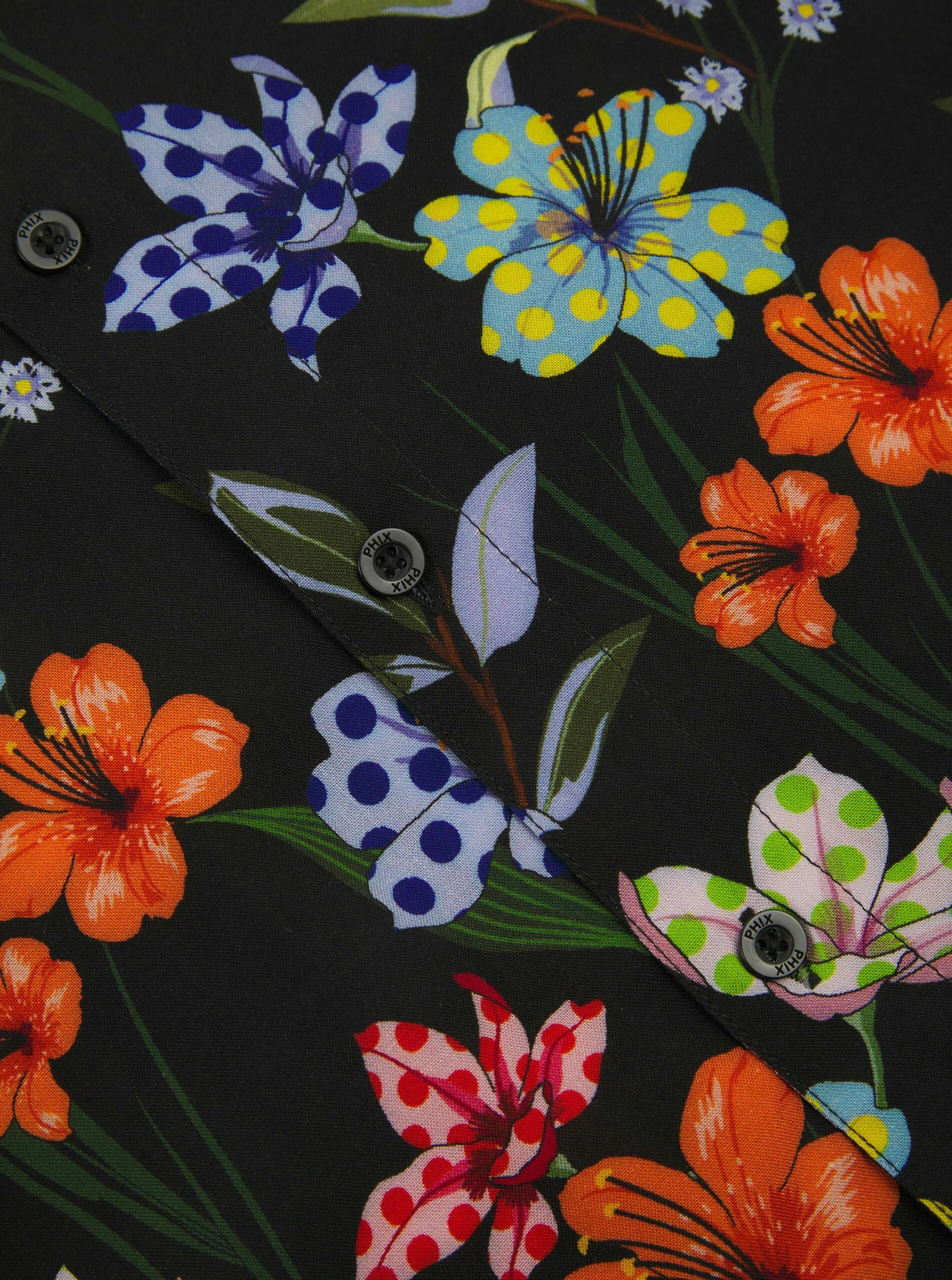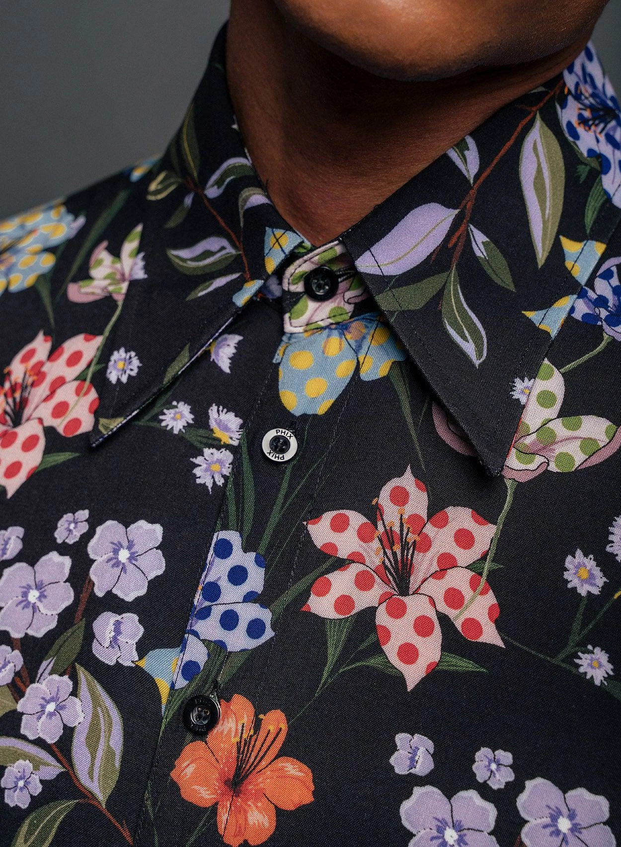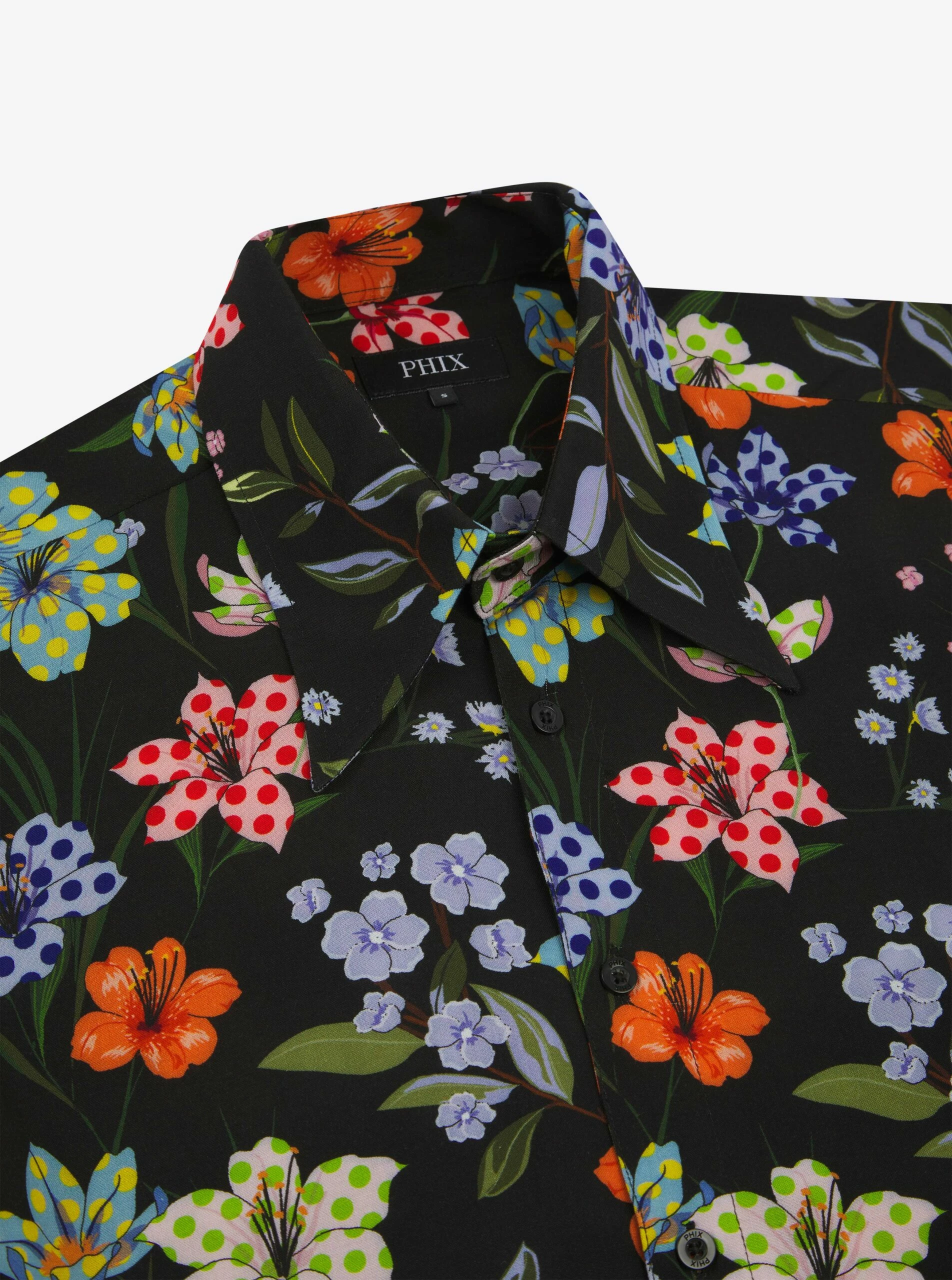 A captivating blend of sophistication and playful charm, this shirt is crafted from sleek black material with a quirky botanical design featuring vibrant spotted orchids in an array of bright colours. Exclusively PHIX, this print has been designed and created in-house for a truly bespoke look. The long sleeves and pointed collar add a touch of signature style, while the embossed monogram buttons showcase meticulous attention to detail. Embrace your individuality and make a statement with this unique piece that effortlessly combines refined style with a whimsical twist.