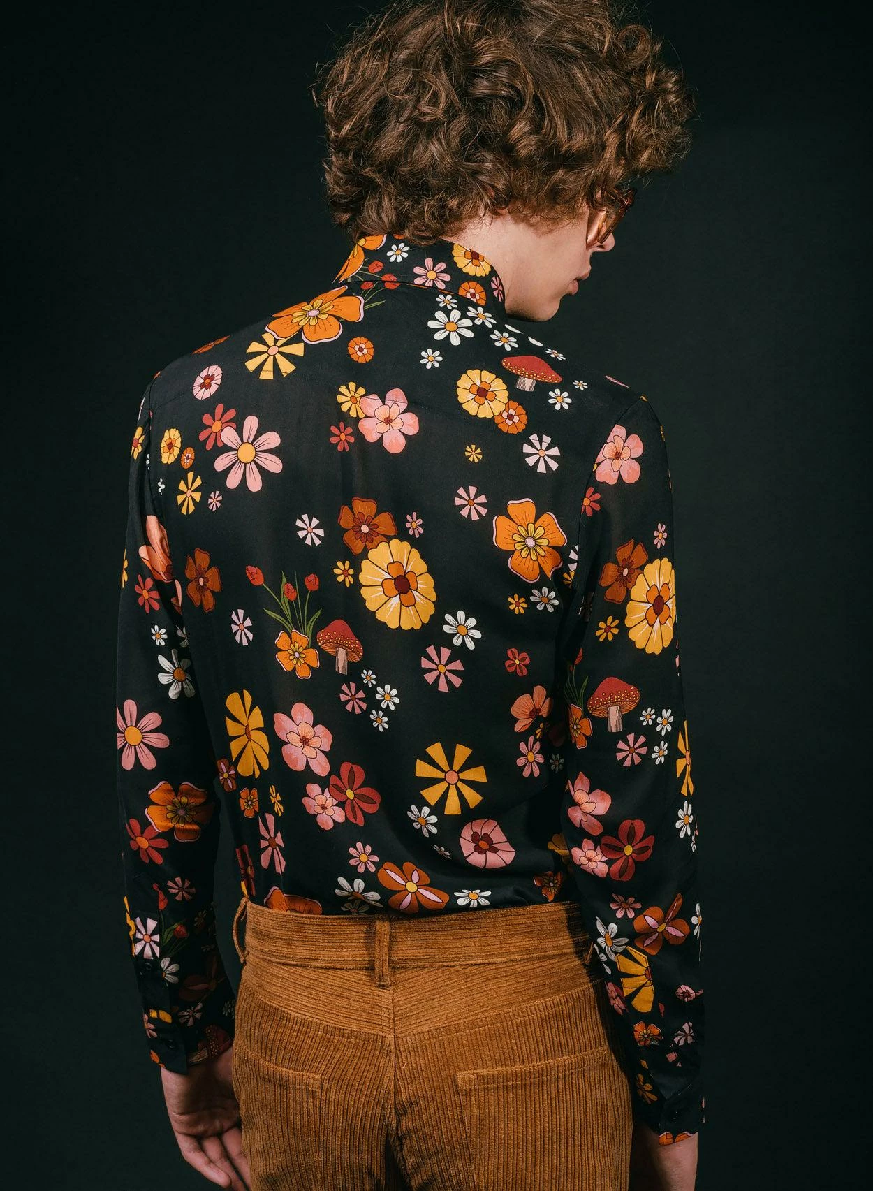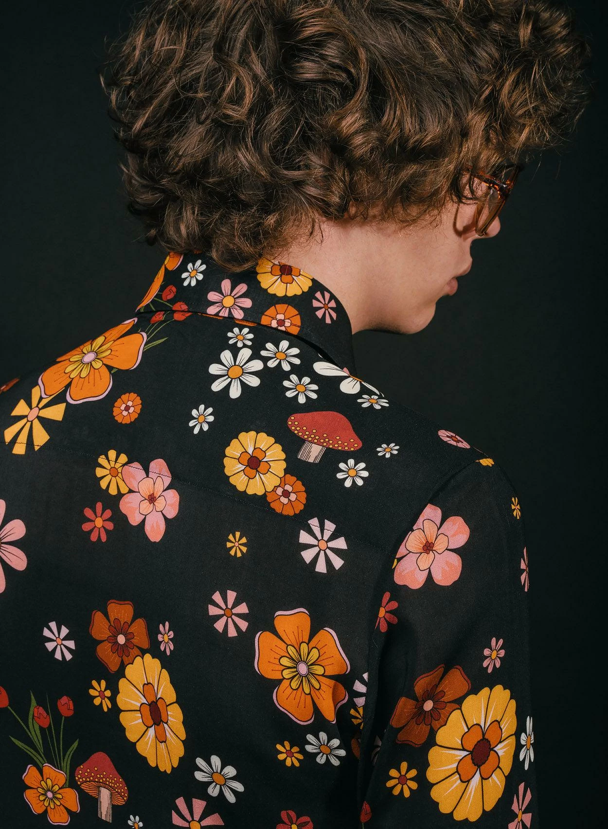 Our latest colourful floral print shirt… Flower power. Cut from lightweight black viscose, this shirt is infused with a sixties feel motif, finished with simple black PHIX branded embossed buttons and a classic pointed collar. Wear it open at the neck for a laidback look. Exclusively PHIX, this print has been designed and created in-house for a truly bespoke feel.