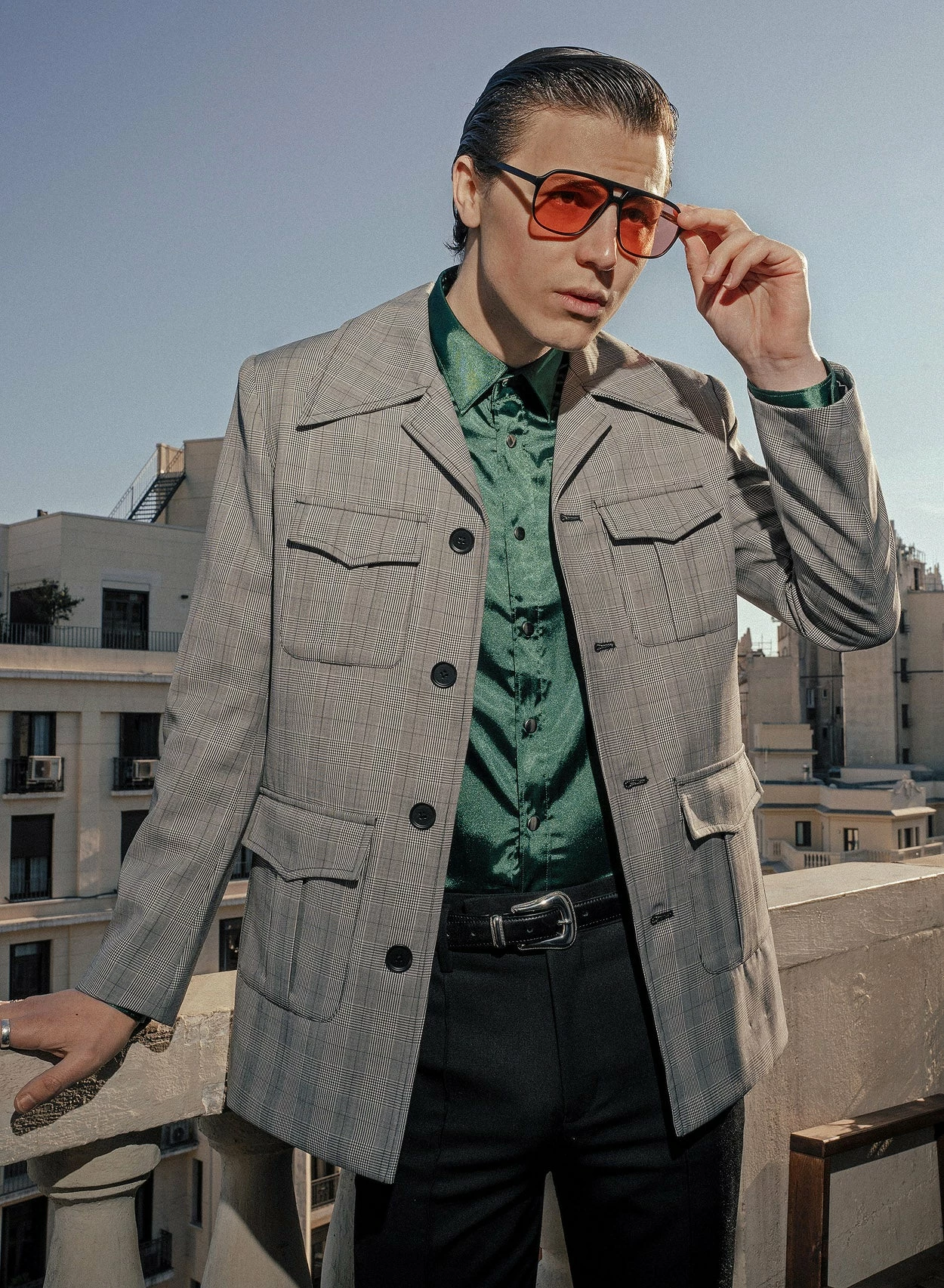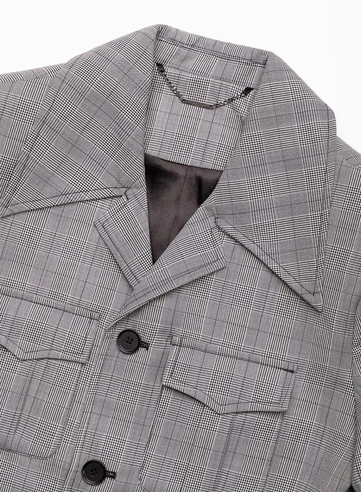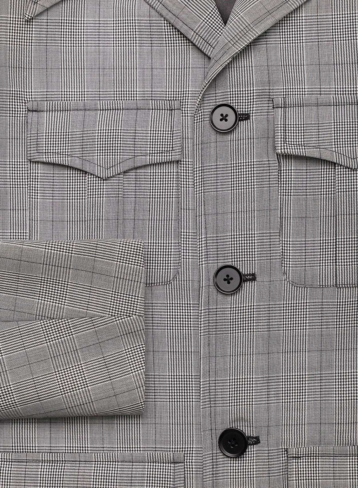 Woven from a premium wool rich material in a classic Prince Of Wales woven check pattern, this jacket has a tailored silhouette, four statement front flap pockets, button closures and statement lapels. Pair it with the matching flared trousers and a vest for effortless casual chic.