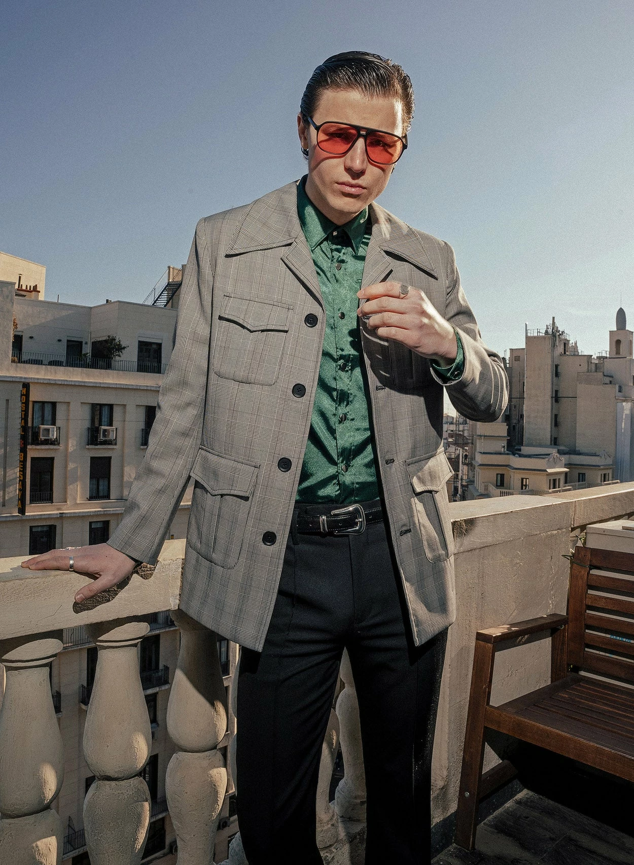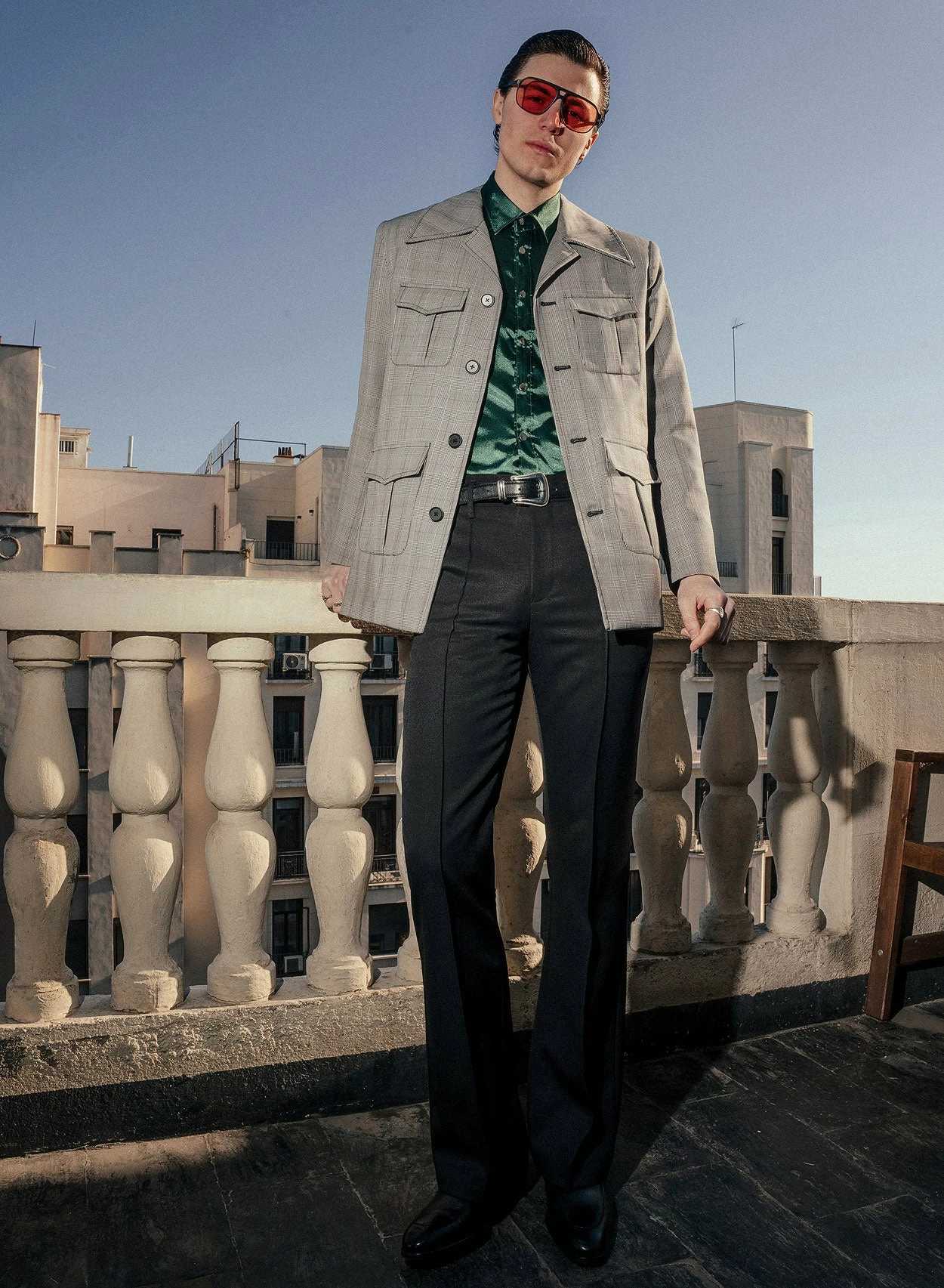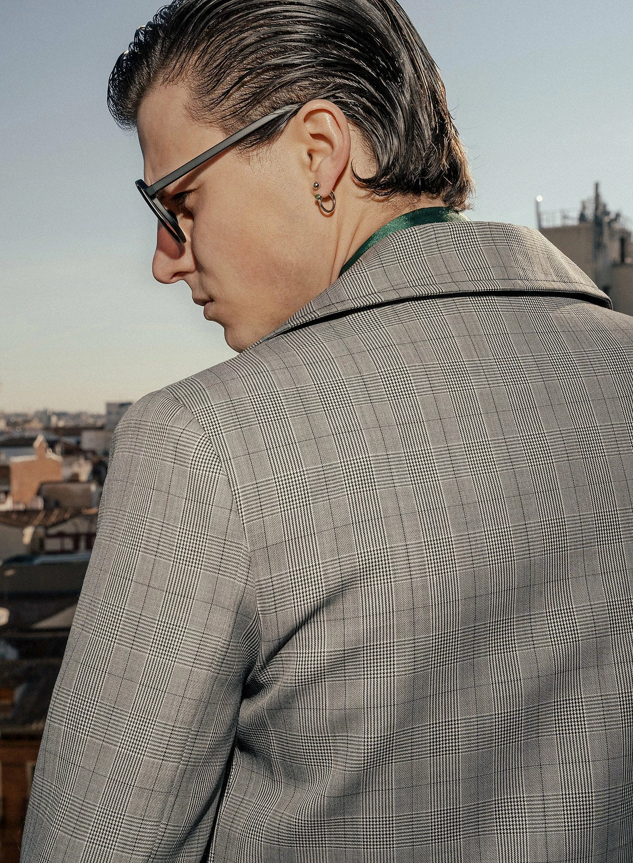 Woven from a premium wool rich material in a classic Prince Of Wales woven check pattern, this jacket has a tailored silhouette, four statement front flap pockets, button closures and statement lapels. Pair it with the matching flared trousers and a vest for effortless casual chic.