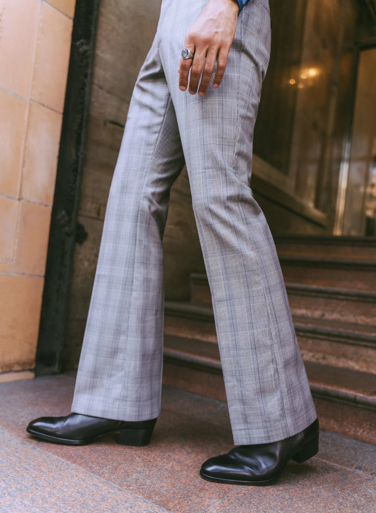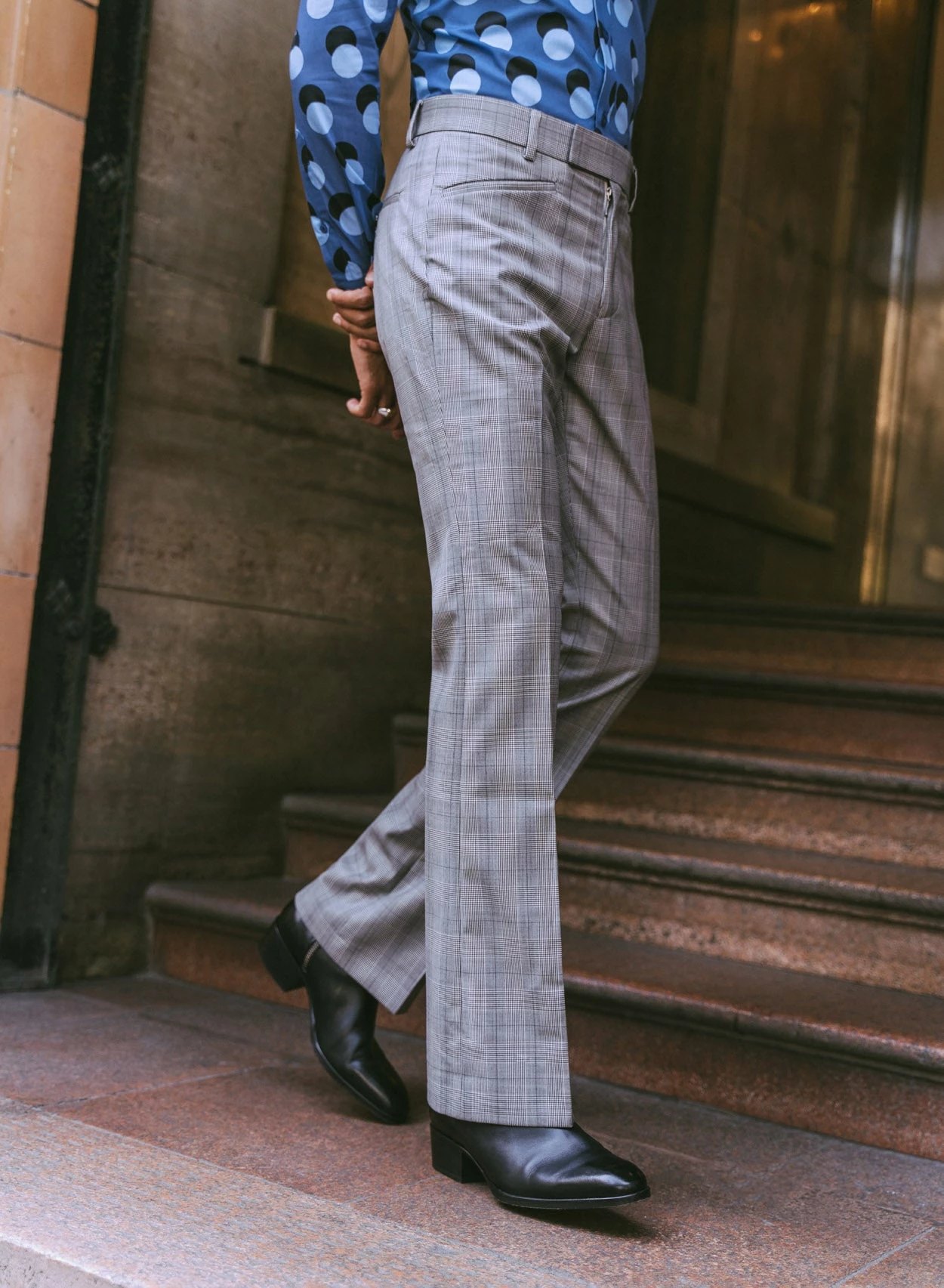 Crafted from a premium wool rich material with a Prince Of Wales woven check pattern and tailored for a slim-fit with flared silhouette, these trousers feature two front slanted pockets, rear pockets and a premium YKK zipper. Expertly finished with a smart pressed centre crease, pair them with our matching Grey Check Blazer for the full suit look.