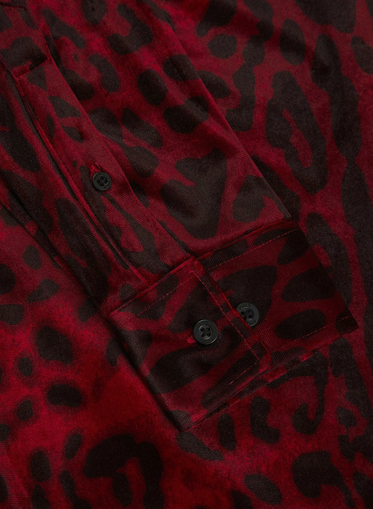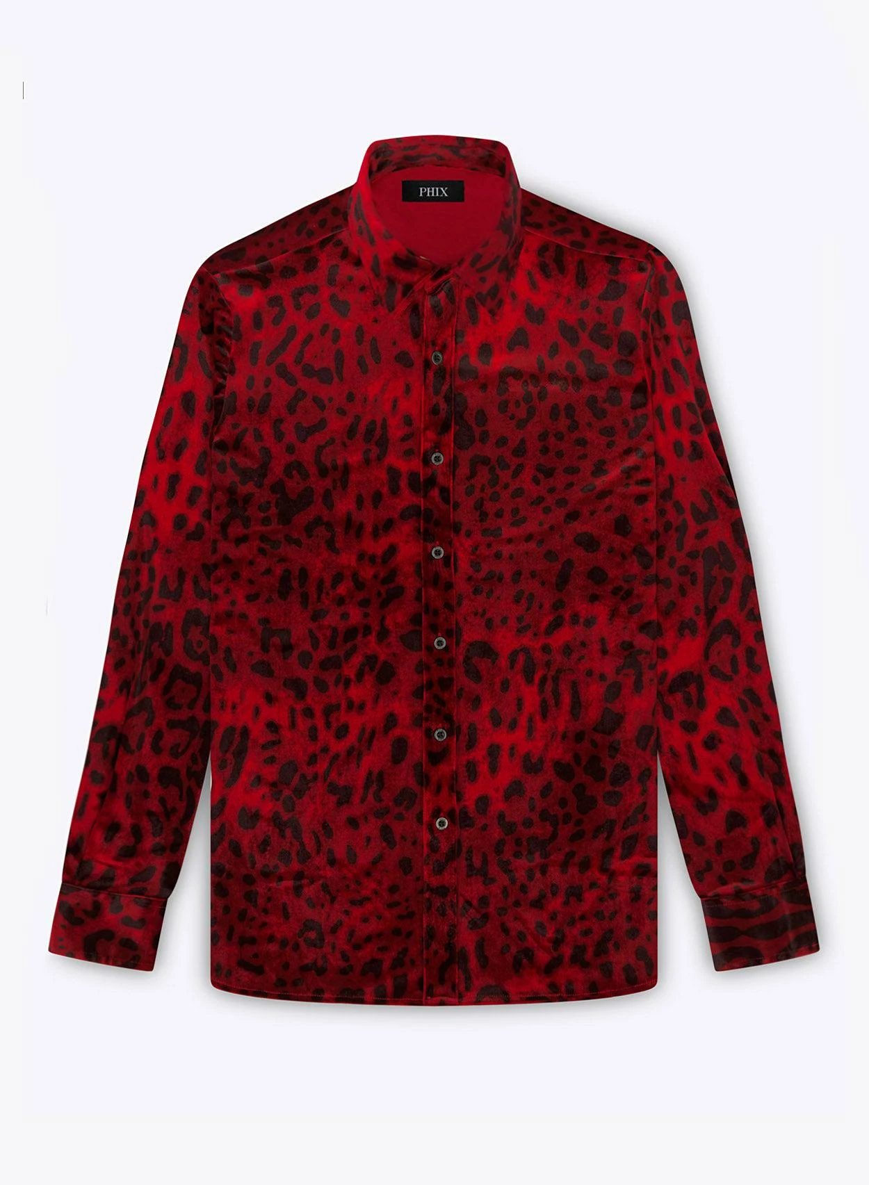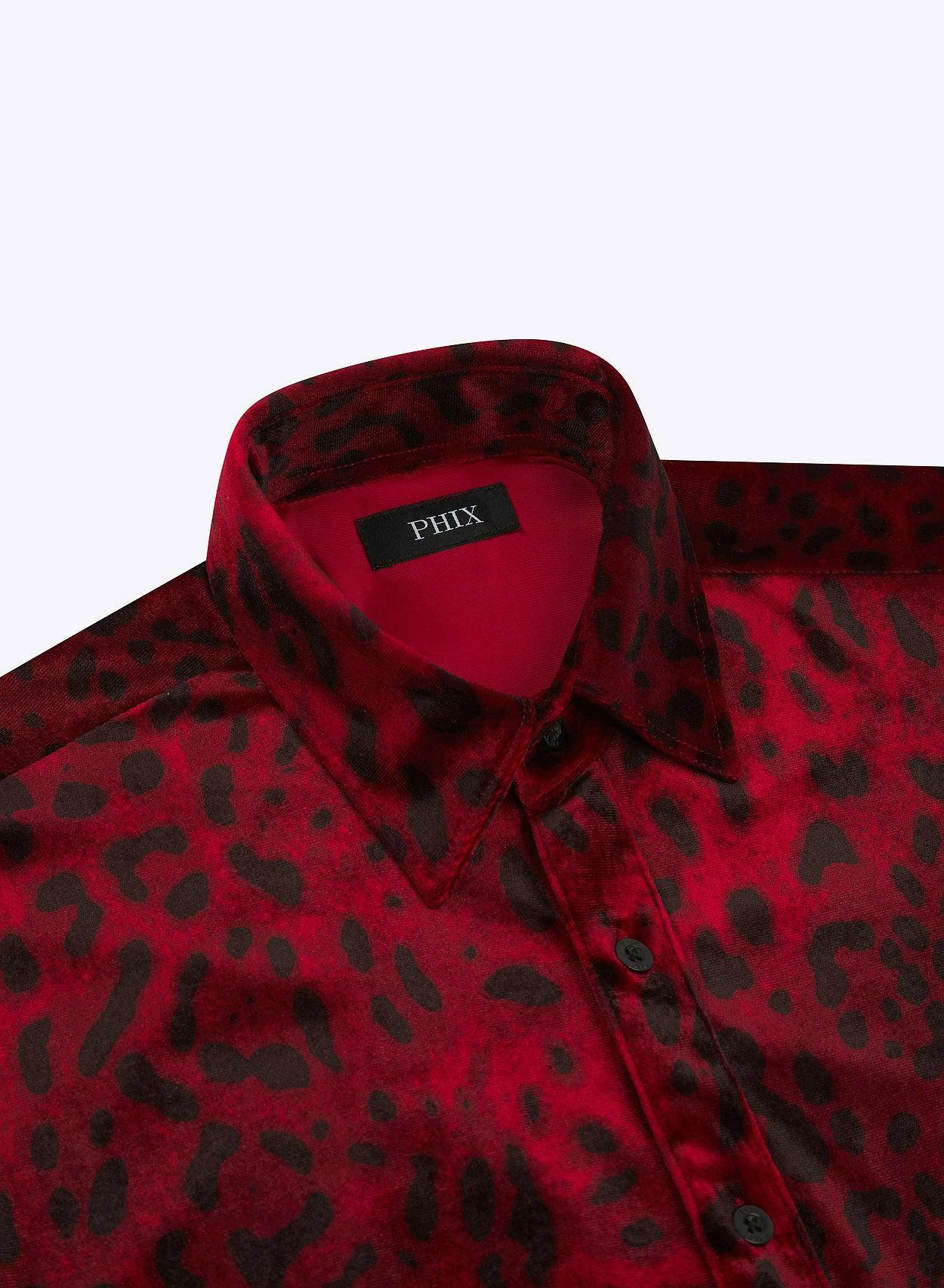 This shirt is a bold fusion of sophistication and statement style. Crafted from luxurious red velvet material with a tailored silhouette and long sleeves, this shirt exudes opulence and undeniable allure. The pointed collar and embossed buttons give a classic feel, while the captivating leopard print pattern adds a touch of wild charm. Exclusively PHIX, this print has been designed and created in-house for a truly bespoke look.