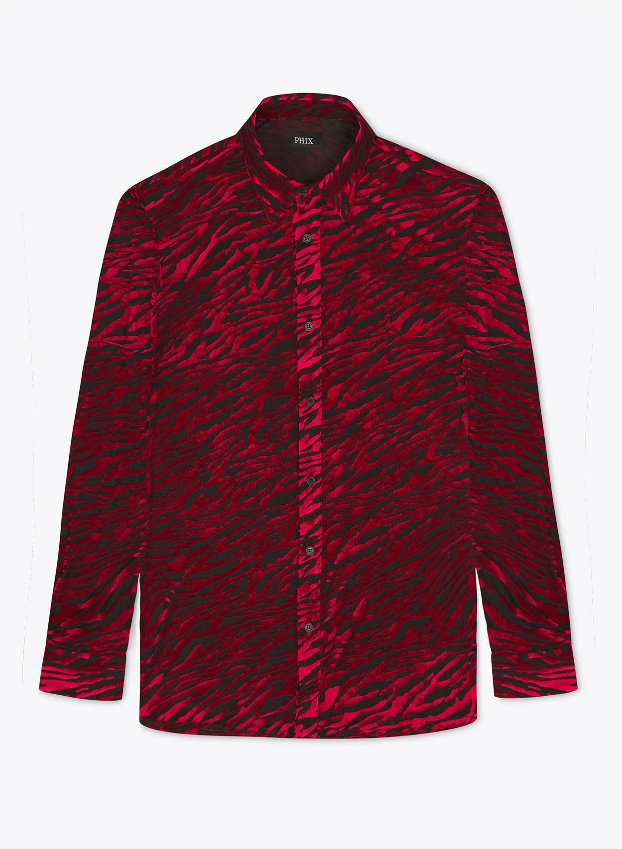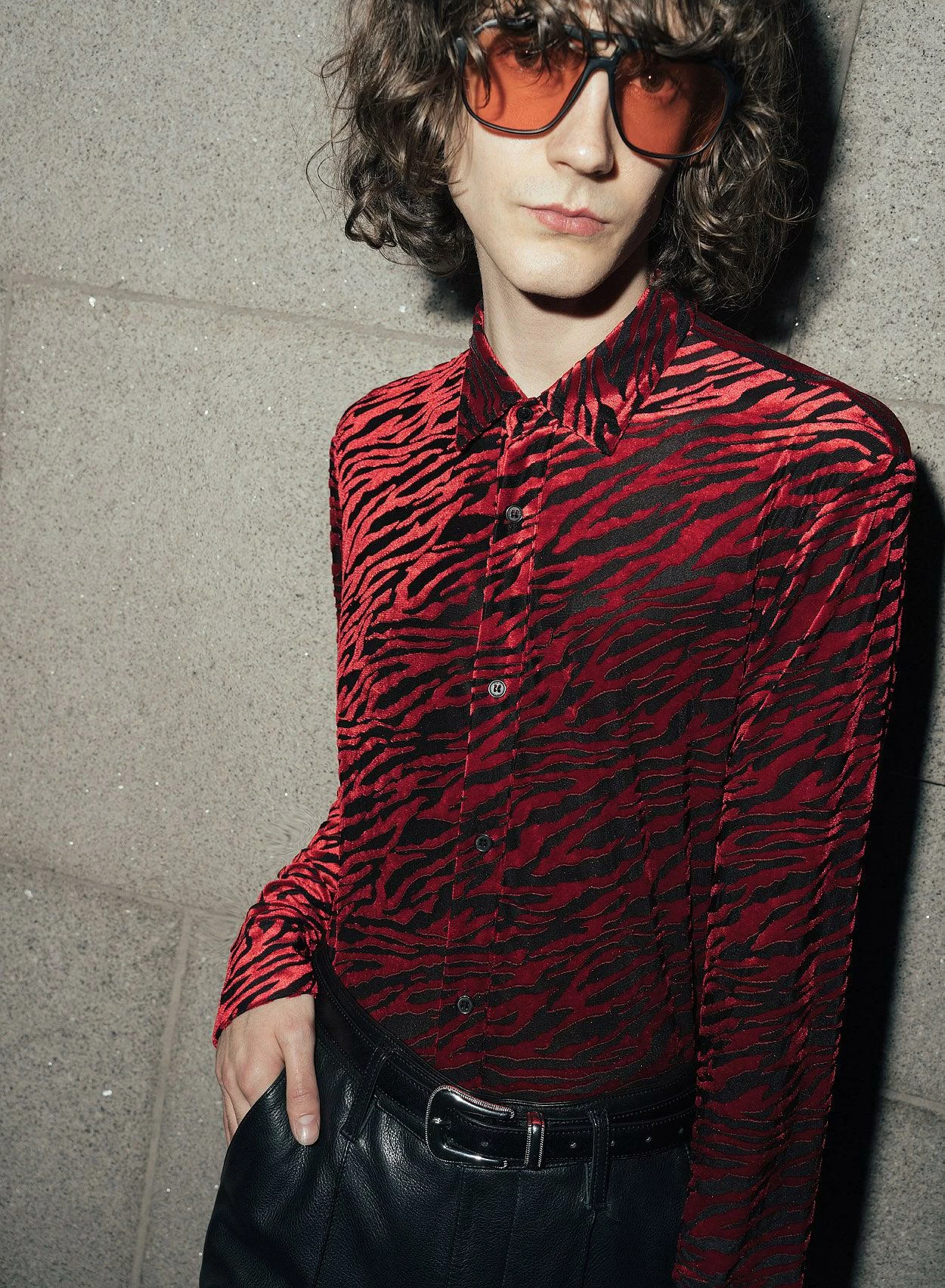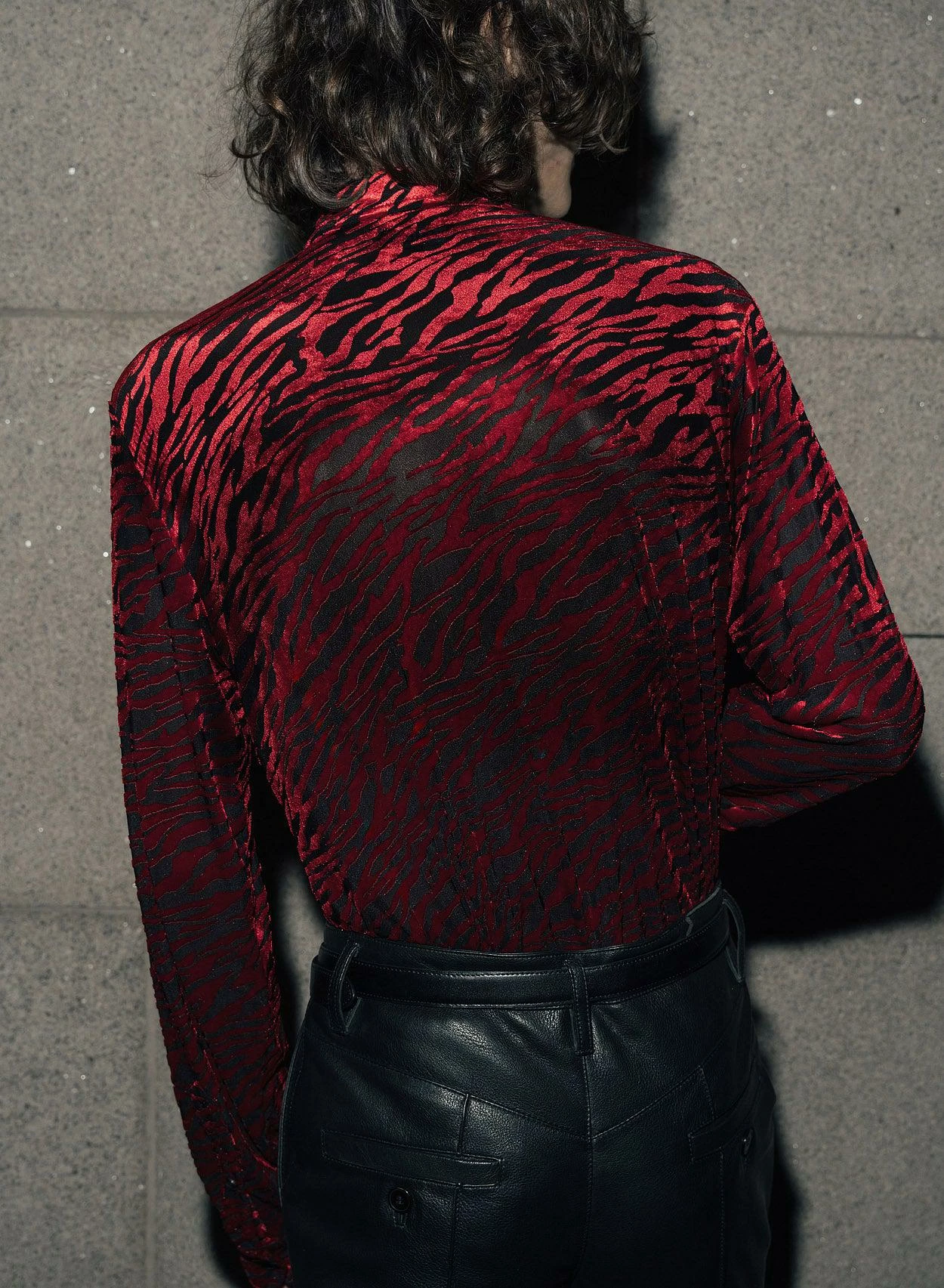 Crafted from plush dark red velvet with an intricately interwoven semi-sheer chiffon animal stripe print design, this long-sleeved shirt is the definitive statement piece for your party season style. Tailored to perfection, featuring our signature monogrammed black buttons and a pointed collar.