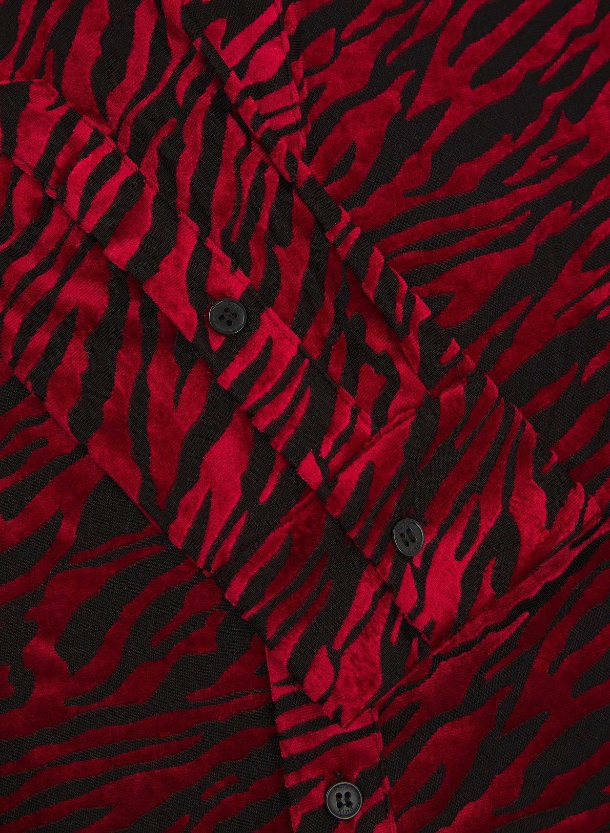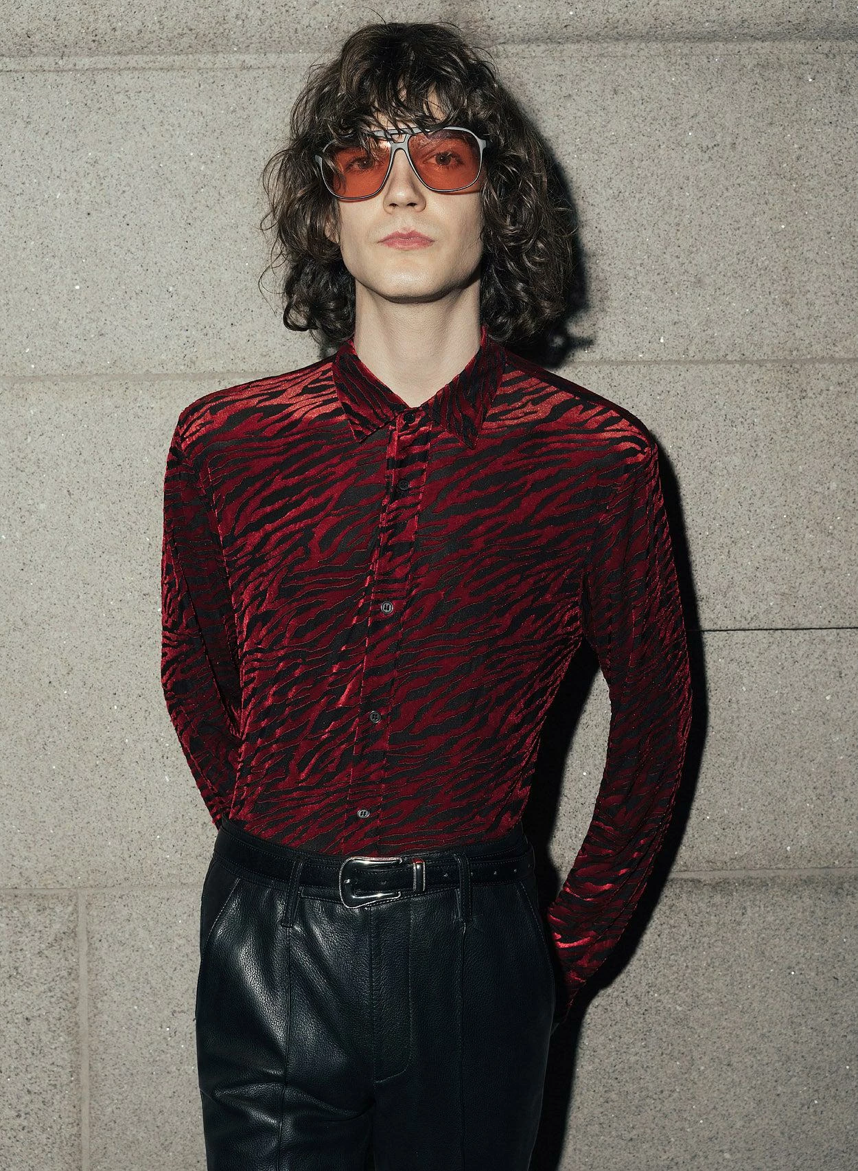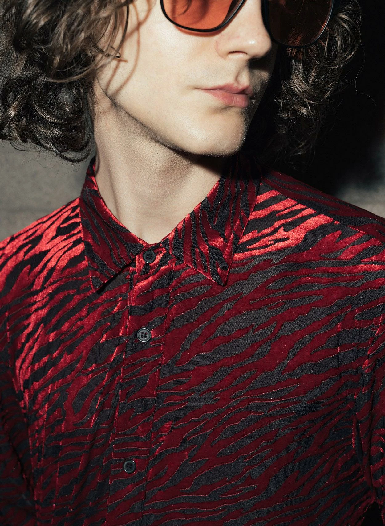 Crafted from plush dark red velvet with an intricately interwoven semi-sheer chiffon animal stripe print design, this long-sleeved shirt is the definitive statement piece for your party season style. Tailored to perfection, featuring our signature monogrammed black buttons and a pointed collar.