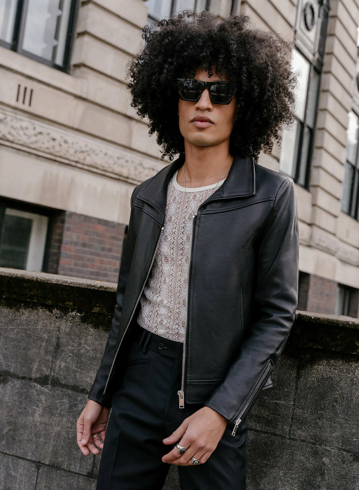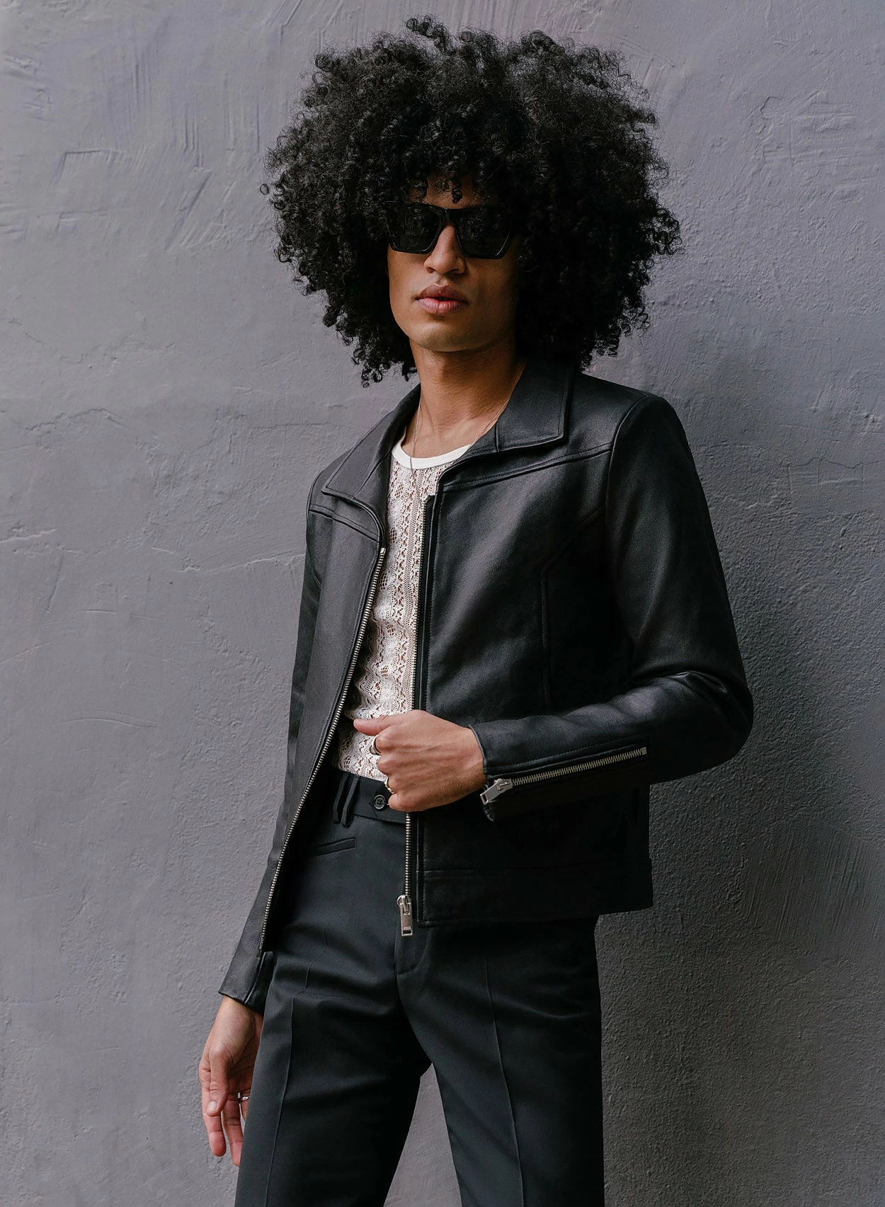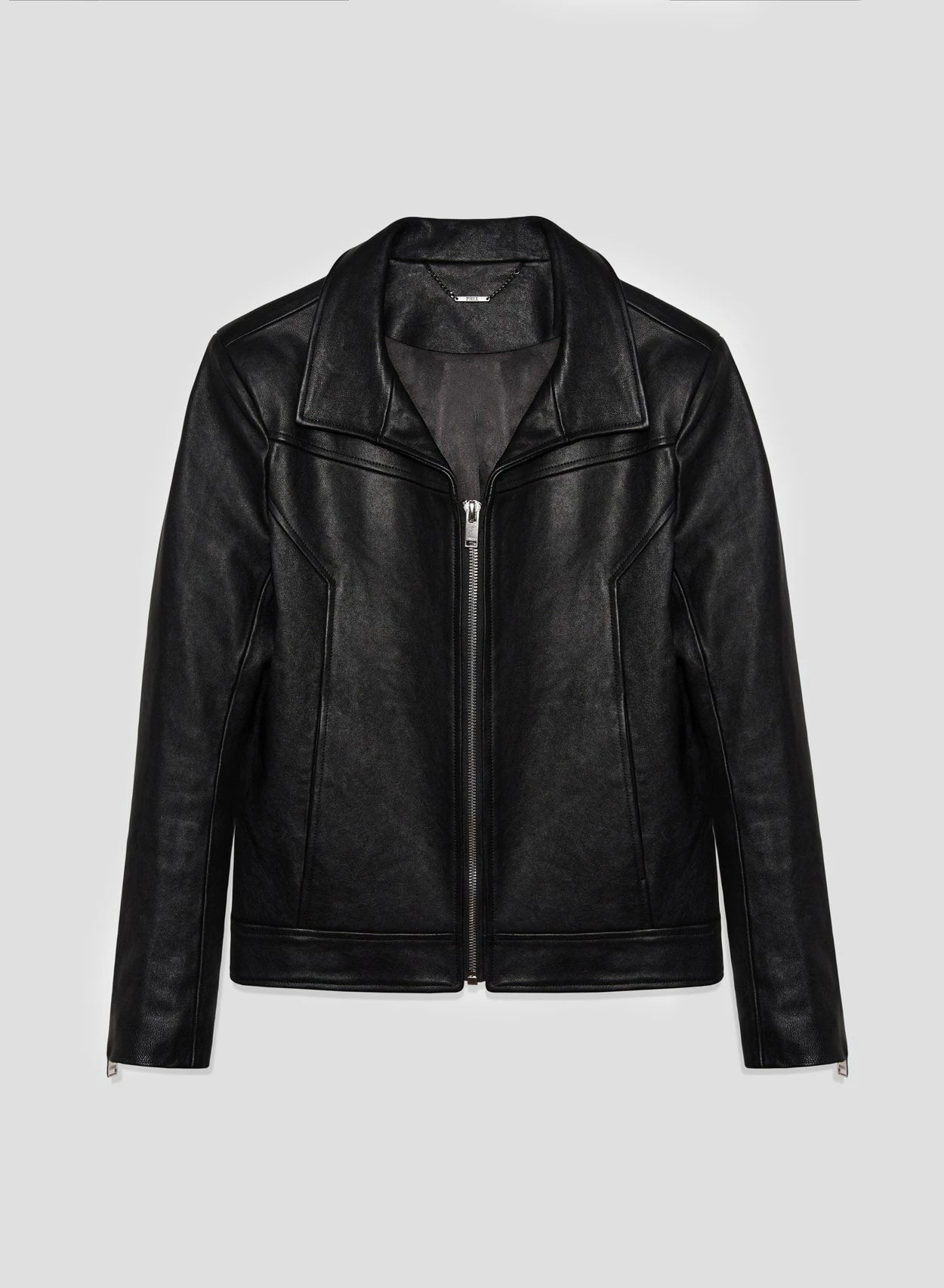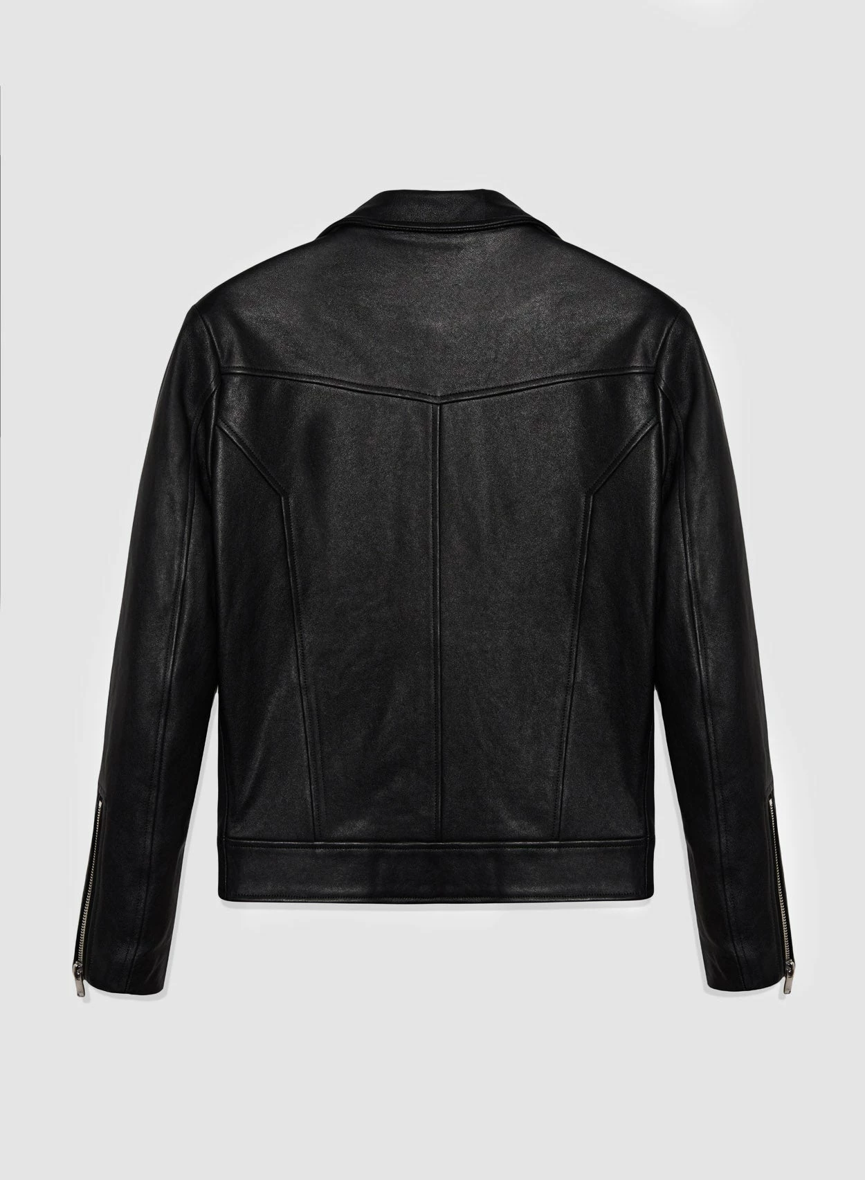 The black leather jacket has become a wardrobe and runway mainstay which can elevate any outfit. Our latest take on this classic style features a unique matte effect leather with sharp tailoring and western inspired angular line detailing. Complete with an open collar and silver-tone metal zipper. The smooth satin lining ensures easy layering.