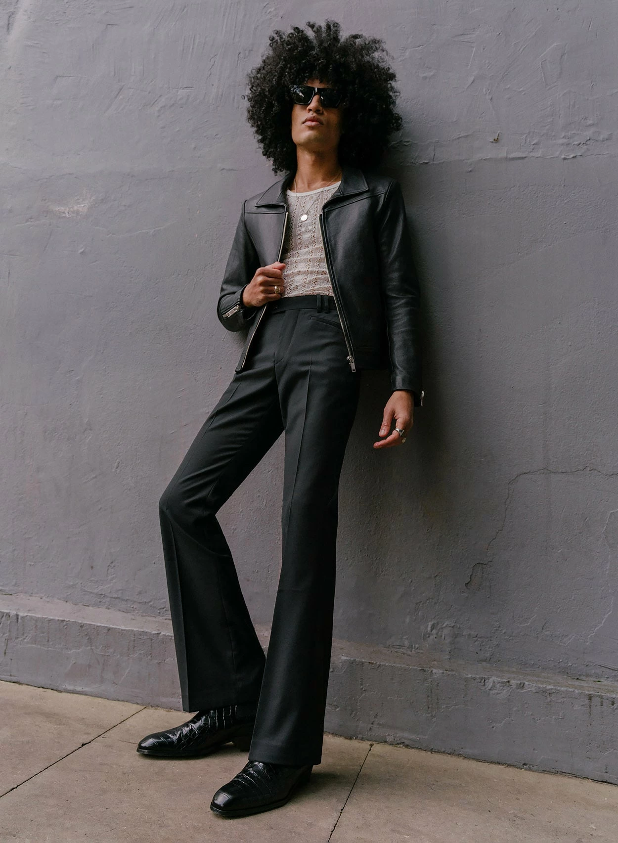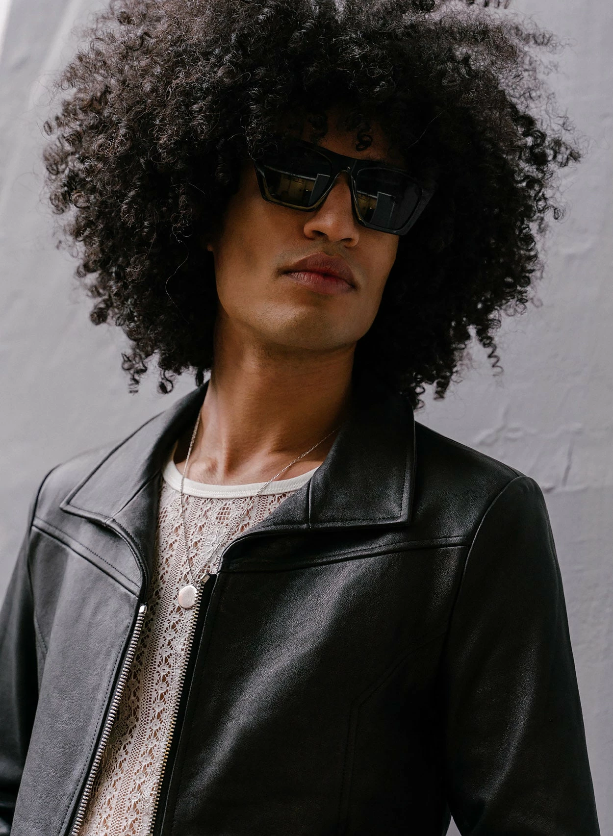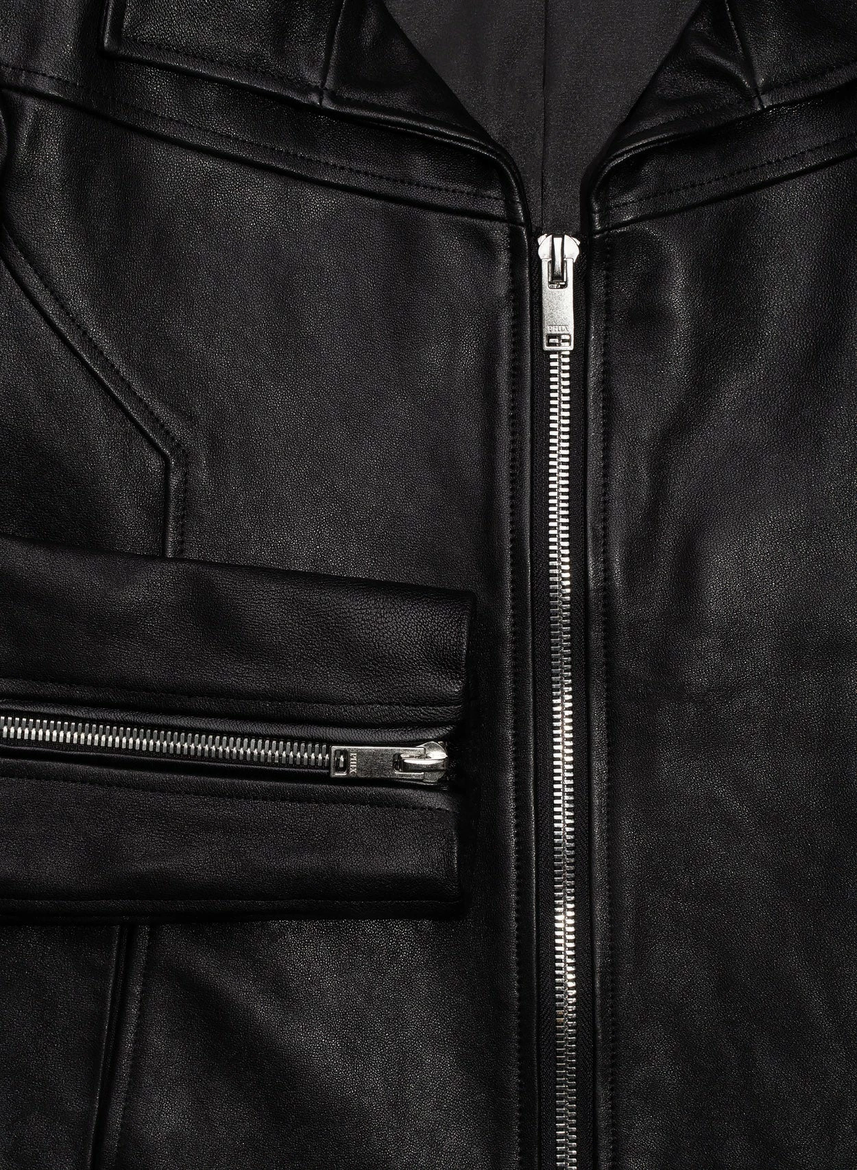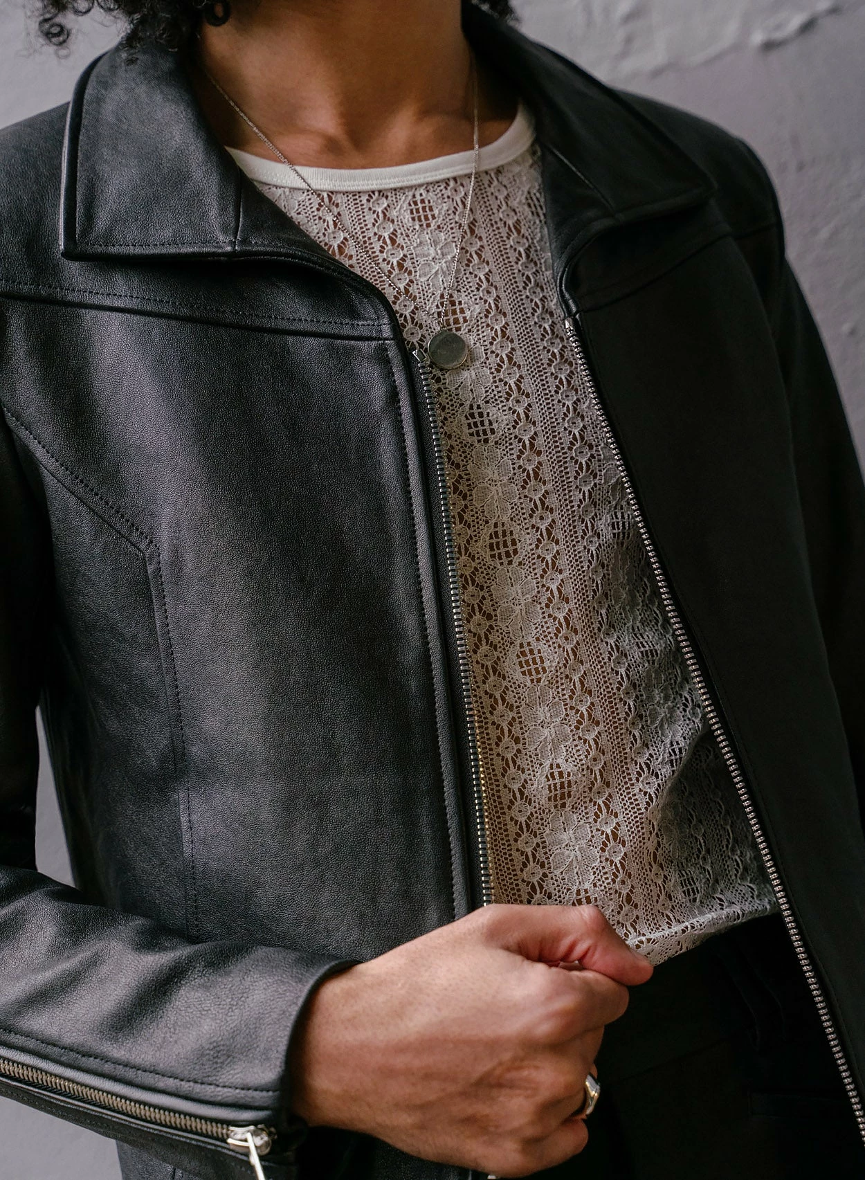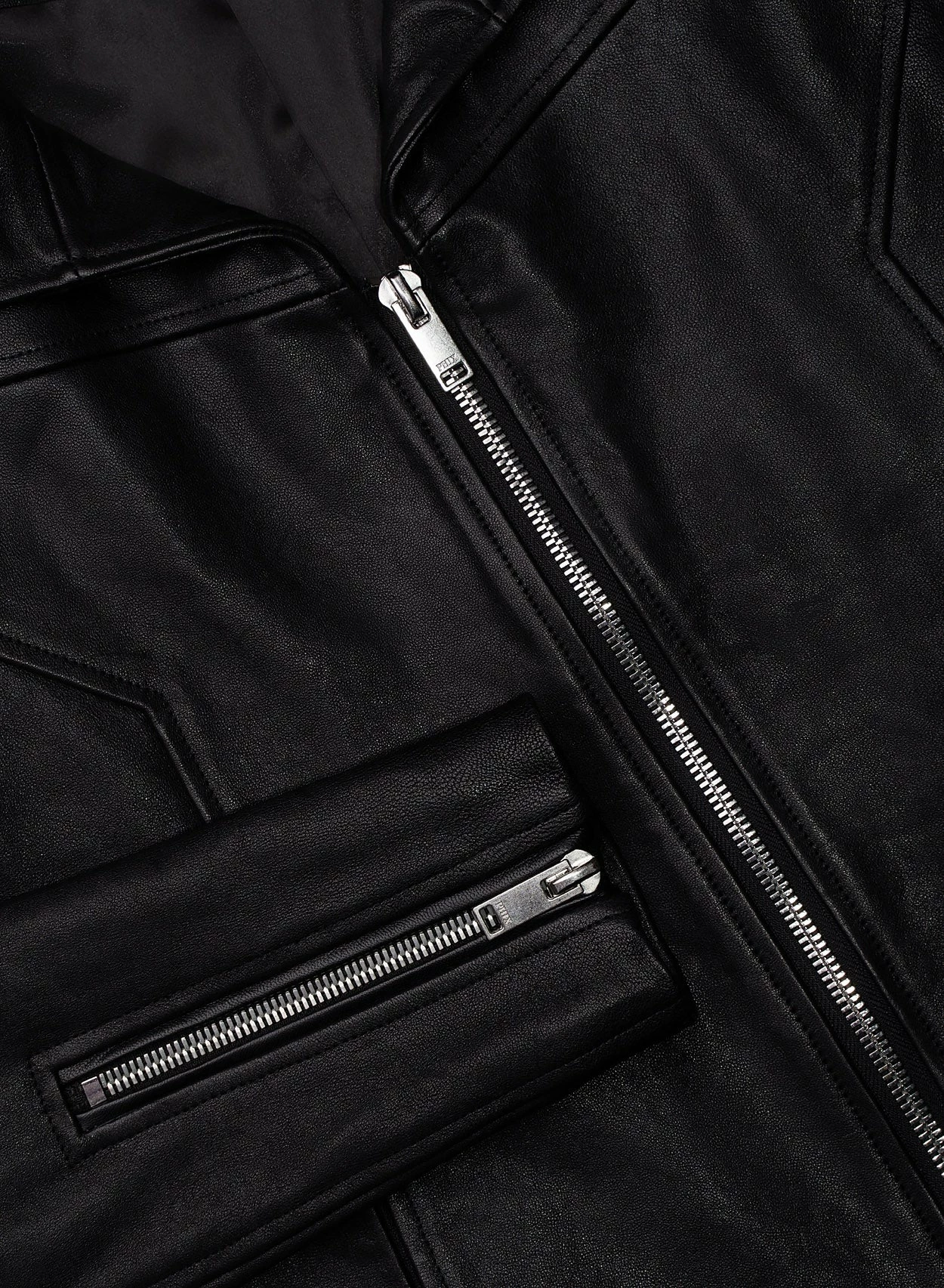 The black leather jacket has become a wardrobe and runway mainstay which can elevate any outfit. Our latest take on this classic style features a unique matte effect leather with sharp tailoring and western inspired angular line detailing. Complete with an open collar and silver-tone metal zipper. The smooth satin lining ensures easy layering.