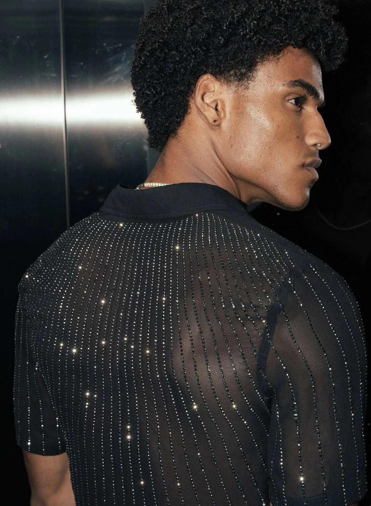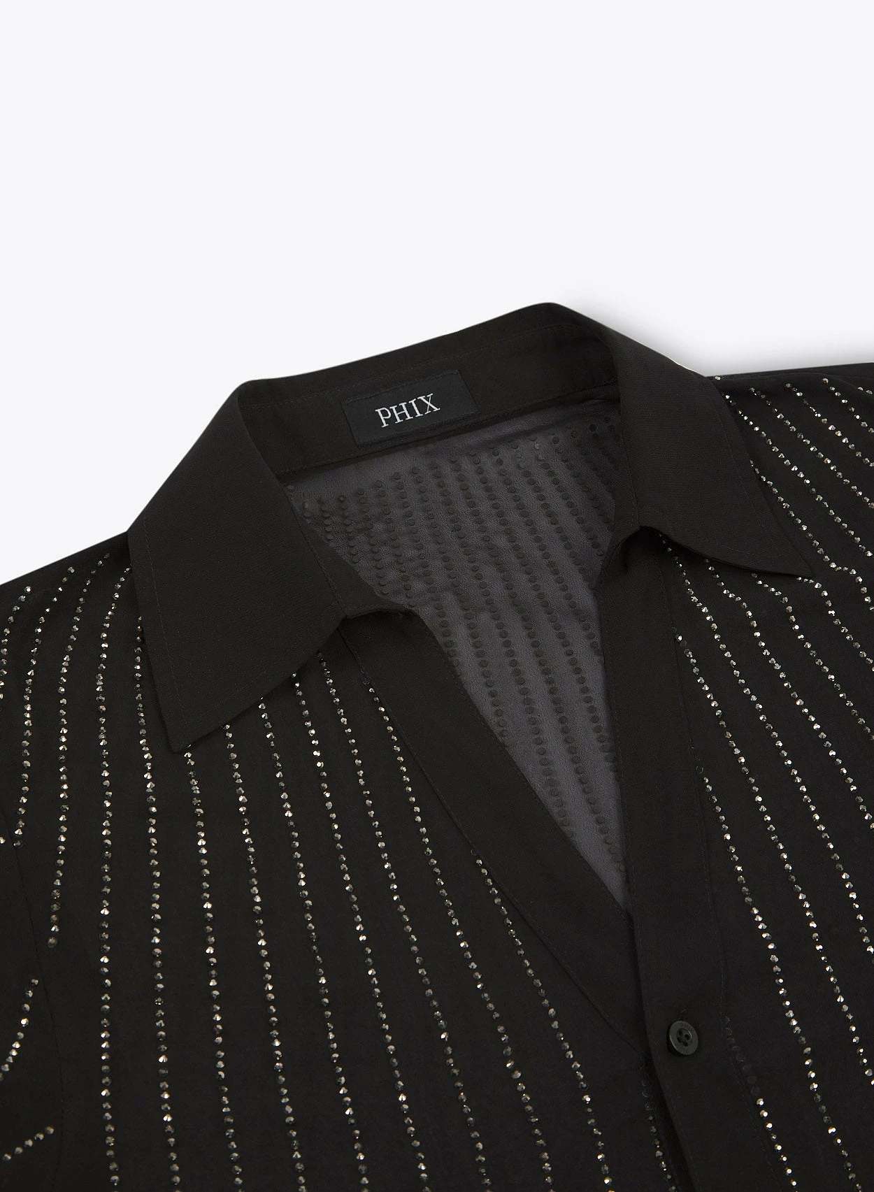 Cut from smooth semi-sheer dark chiffon for our signature tailored fit with pointed collar and short sleeved silhouette, this is a true glitzy statement shirt. Intricately embroidered with rhinestone crystals in a linear pattern and finished with subtle black logo embossed buttons throughout. Exclusively PHIX, this material has been designed and created in-house for a truly bespoke look. Style yours with sleek tailoring and leather boots for effortless cool. Also available in a long sleeved silhouette.