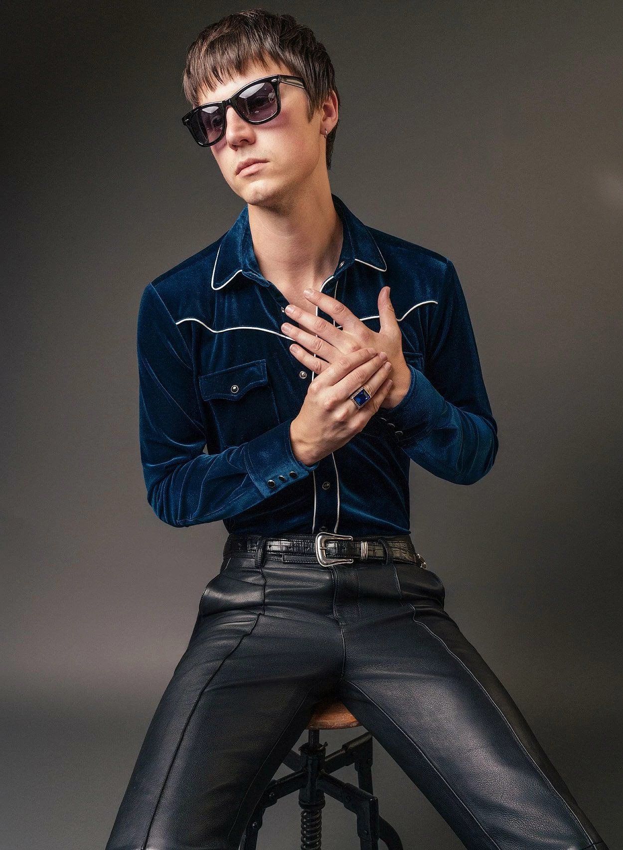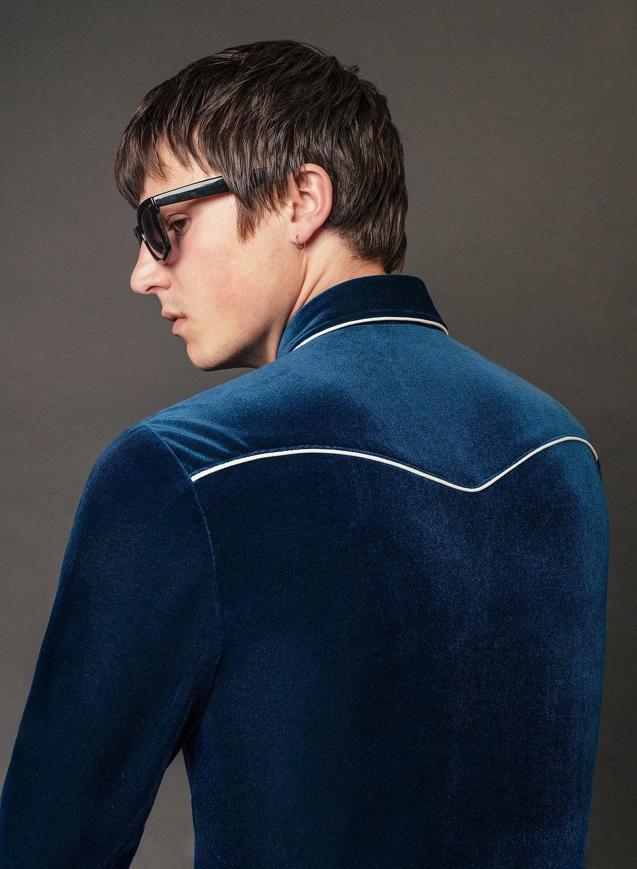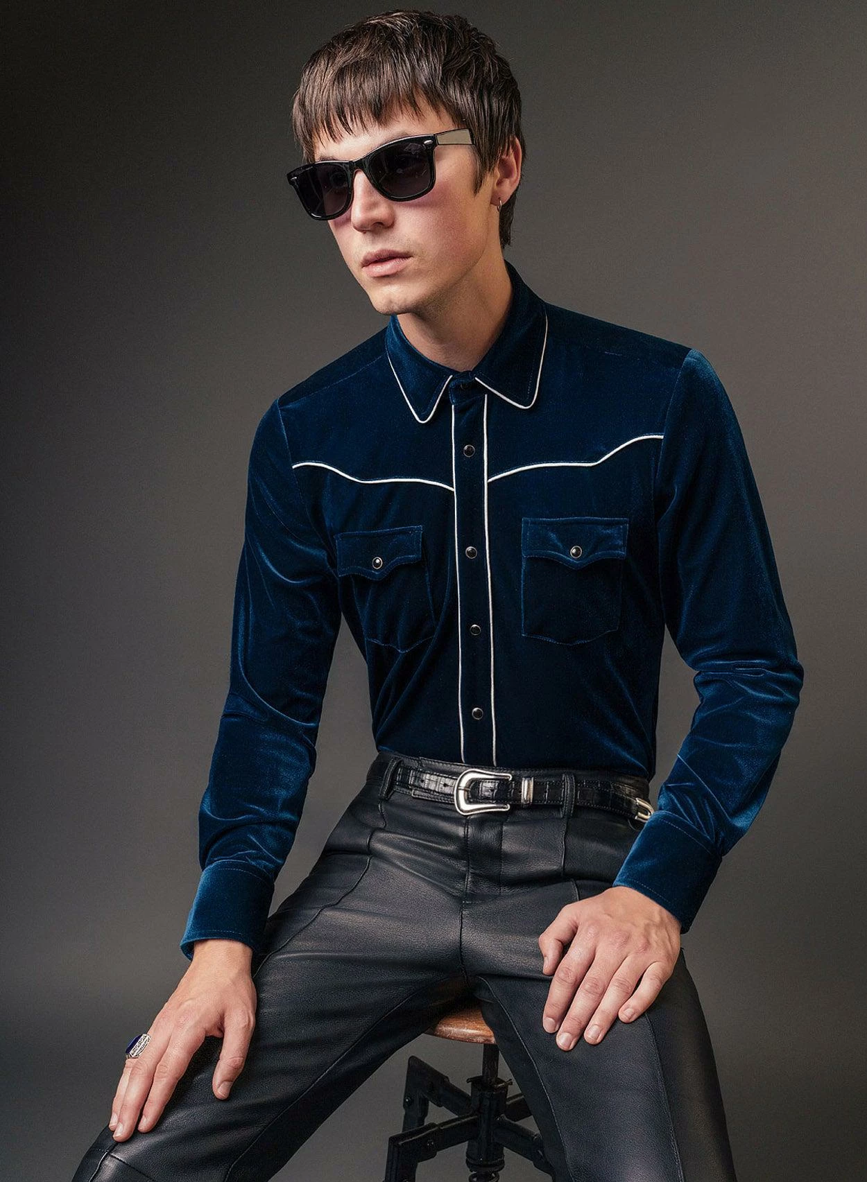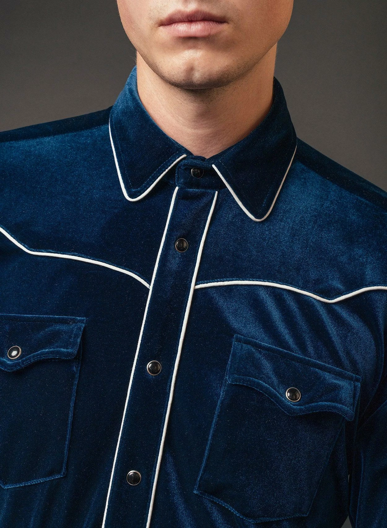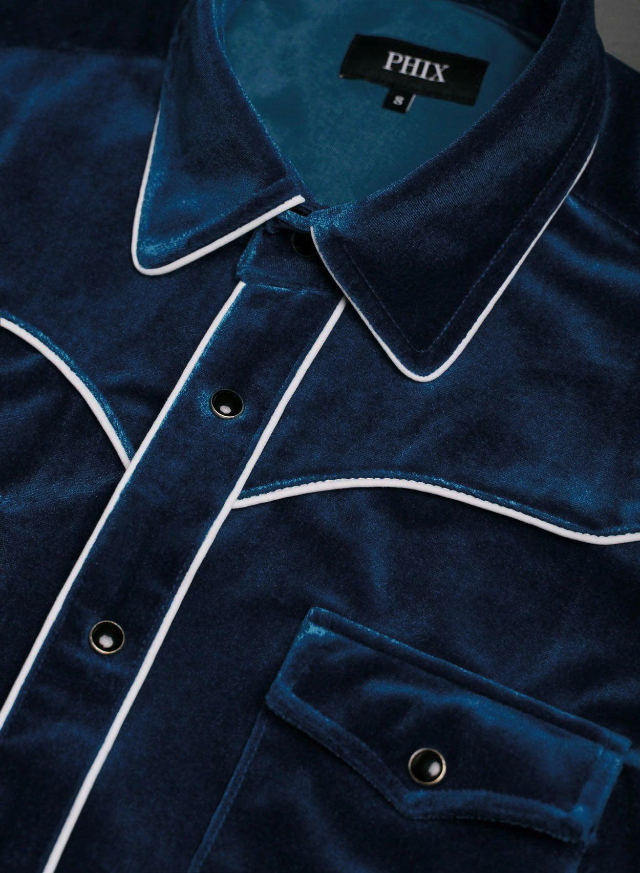 Crafted from a luxuriously plush teal velvet with white piping, this western infused shirt is finished with silver edged, black popper buttons for added ease of wear and features functional angular flap pockets on the chest. Tuck yours into high-waisted denim flares for a vintage all-American look. Available in other colourways via our shirting category.