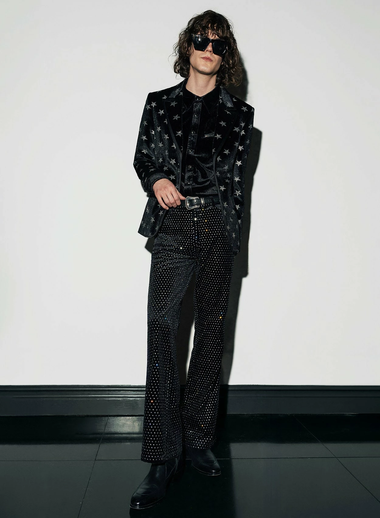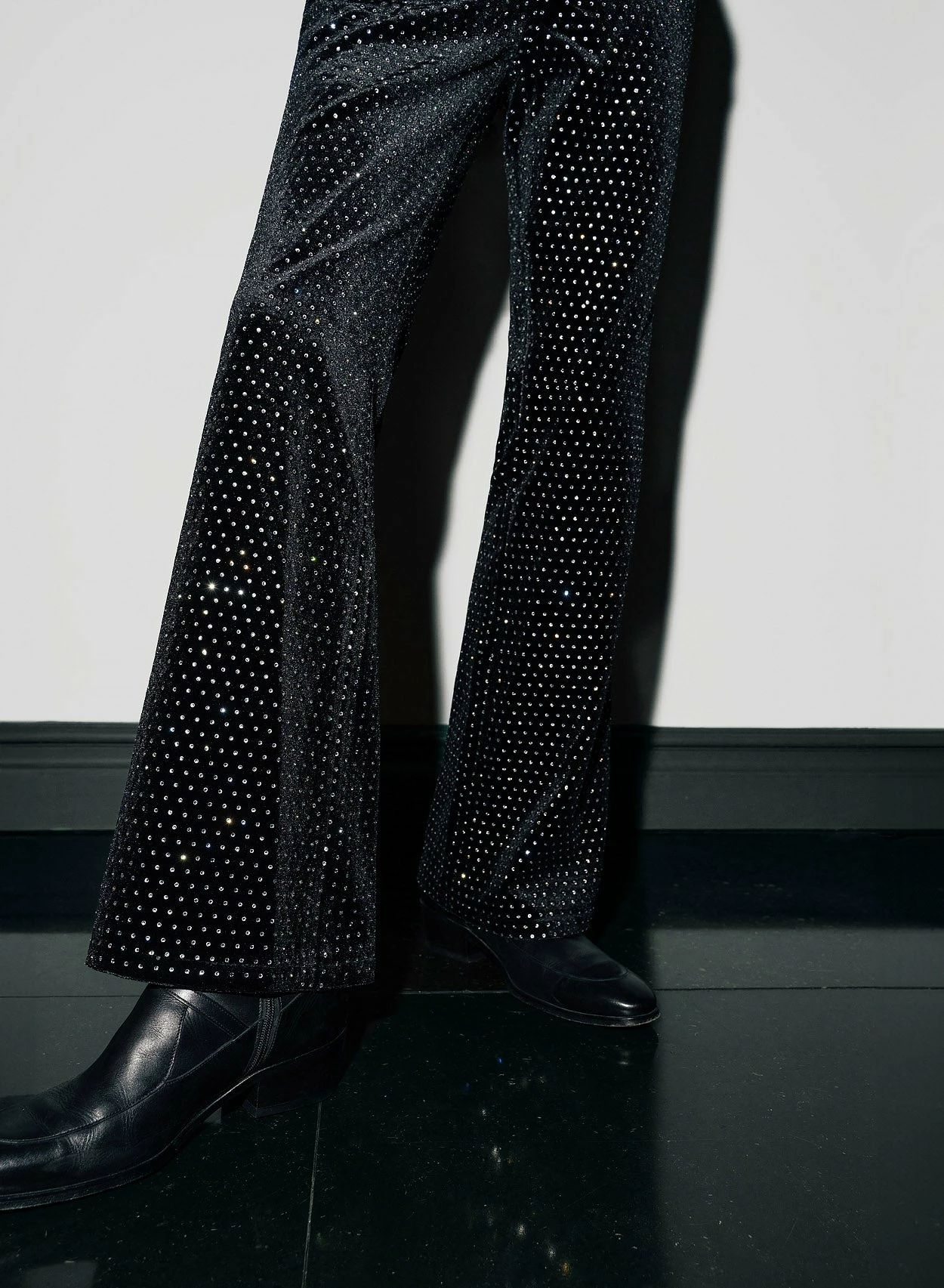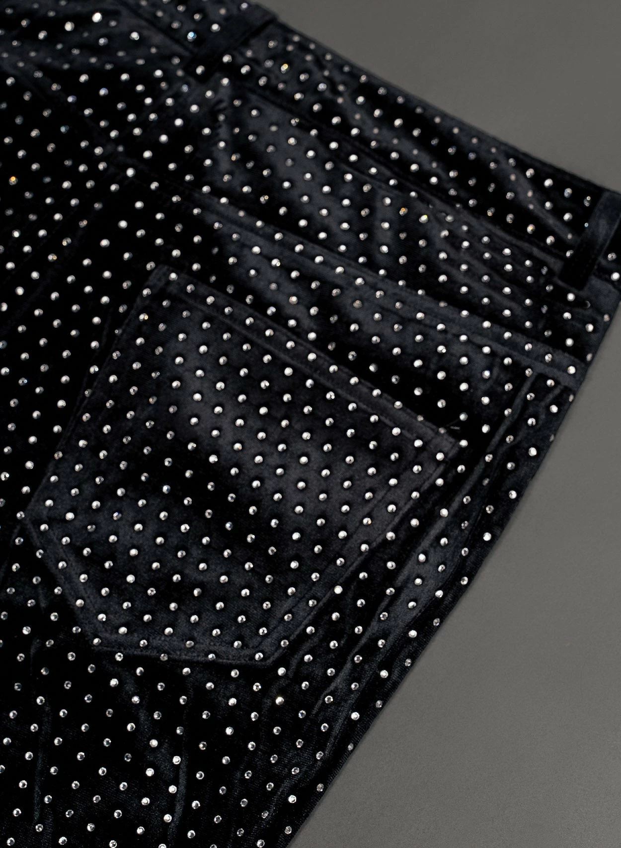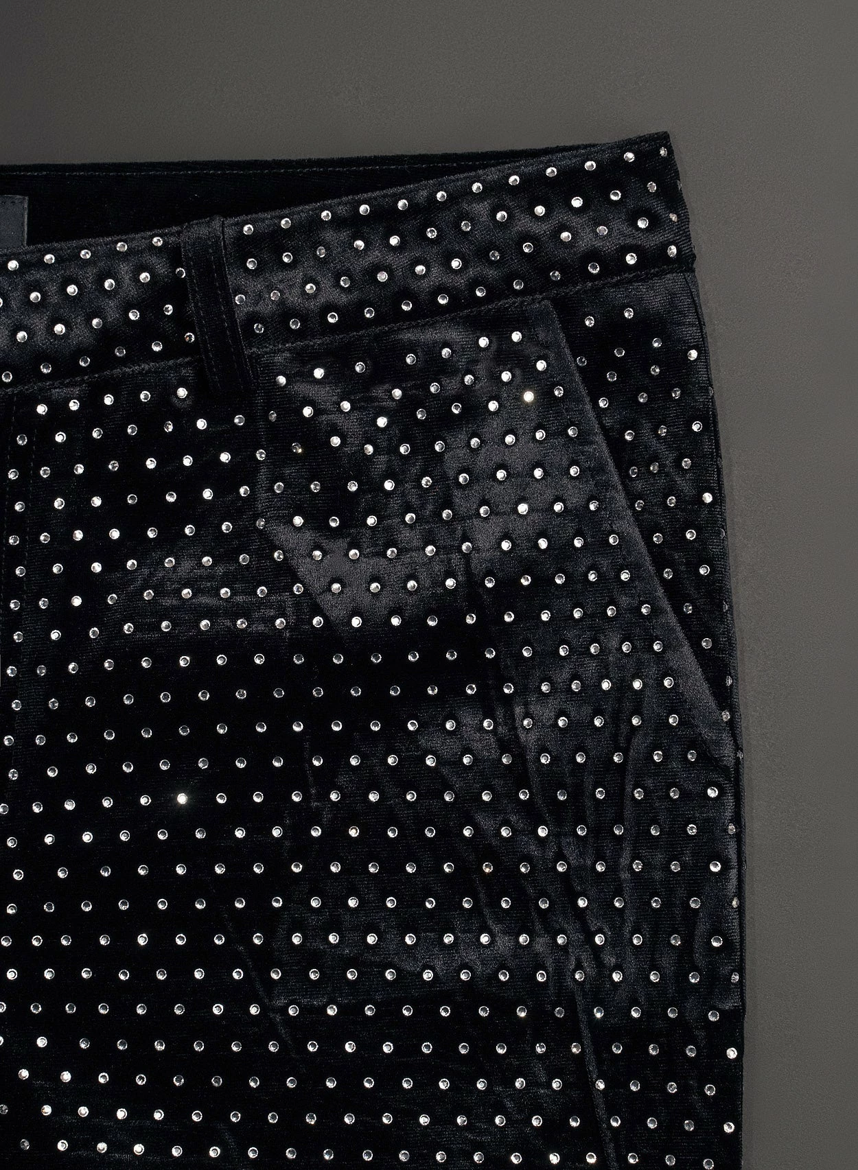 Crafted from sumptuous black velvet, these flared trousers boast mesmerising silver diamante embellishments, adding sparkle and drama to your look. Available in a regular 32-inch length or long 34-inch length with a sleek vintage-infused tapered bell bottom silhouette, they offer a perfect fit and timeless style.